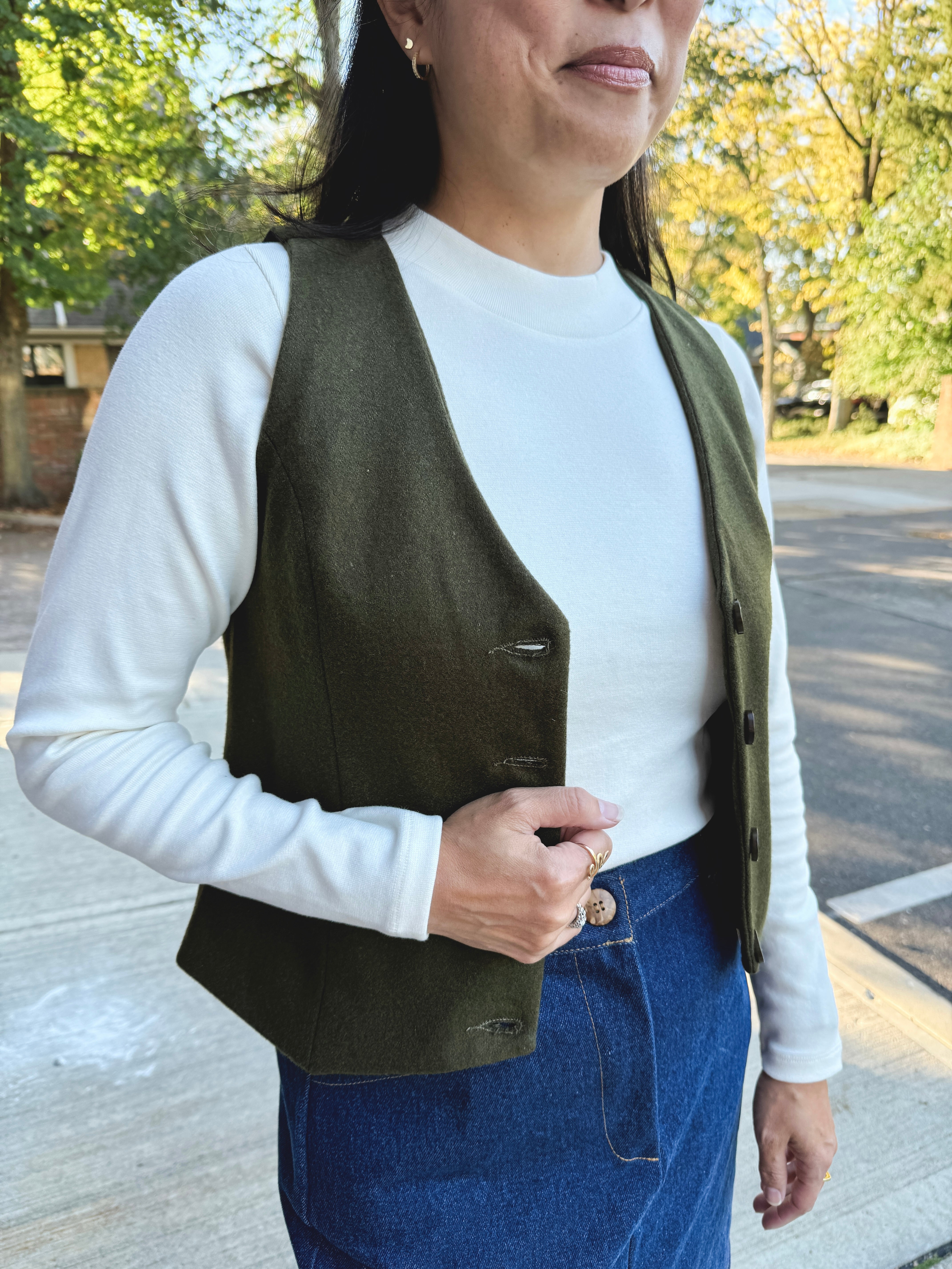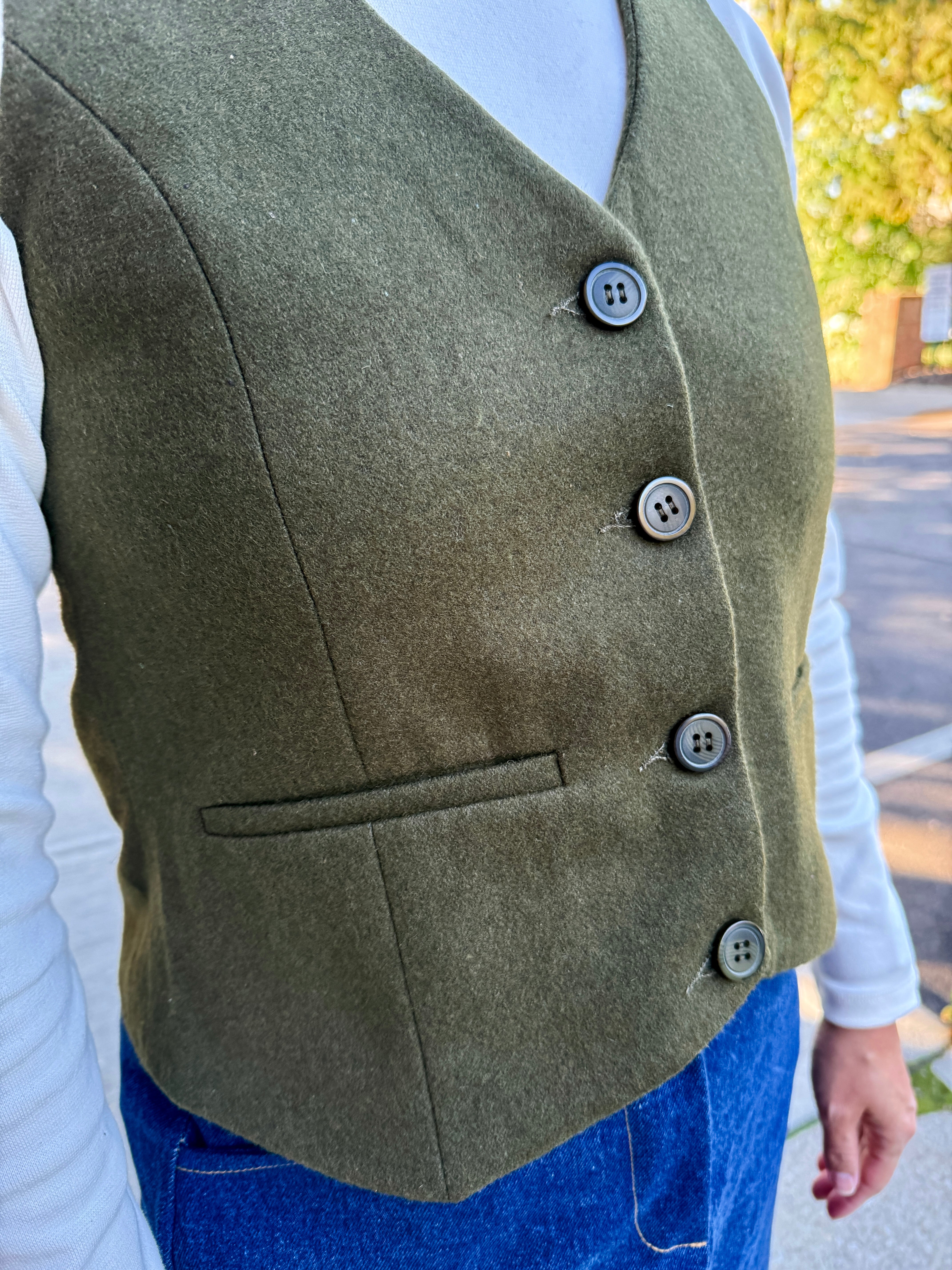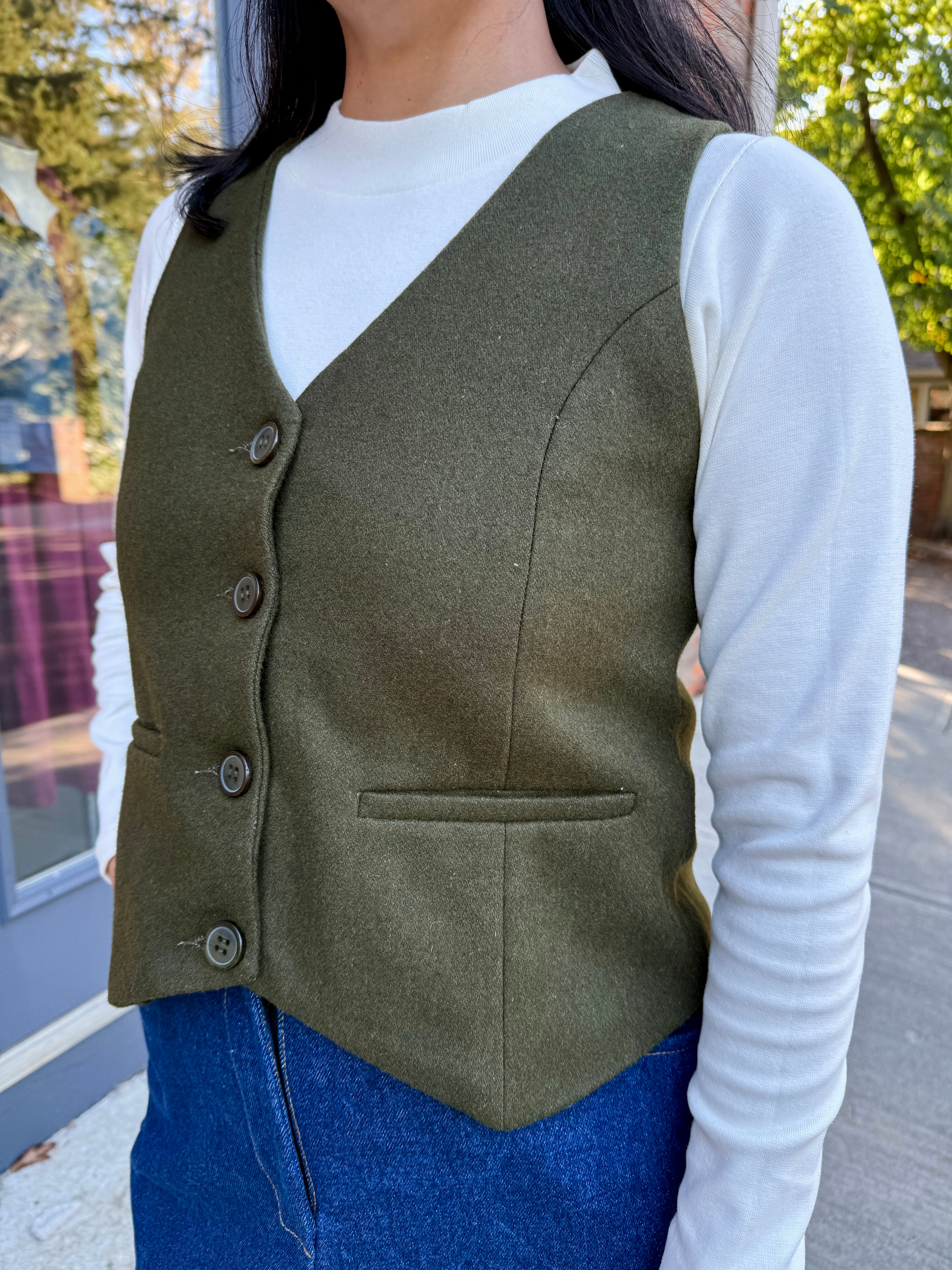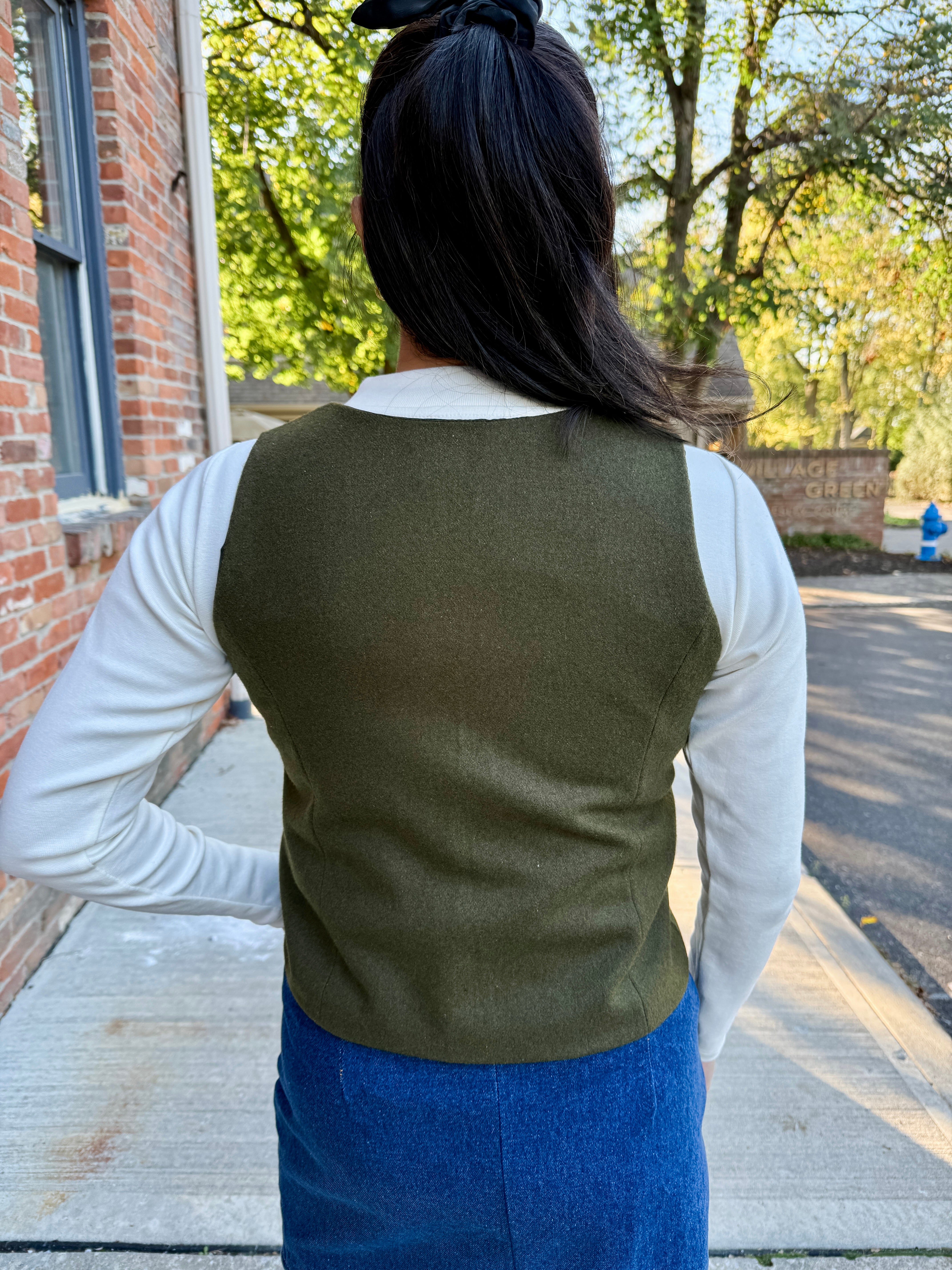 Elevate your fall and winter wardrobe with this sophisticated button-front vest in rich Rifle Green, crafted from premium wool and tweed surplus fabrics. This menswear-inspired piece combines timeless style with sustainable fashion.
