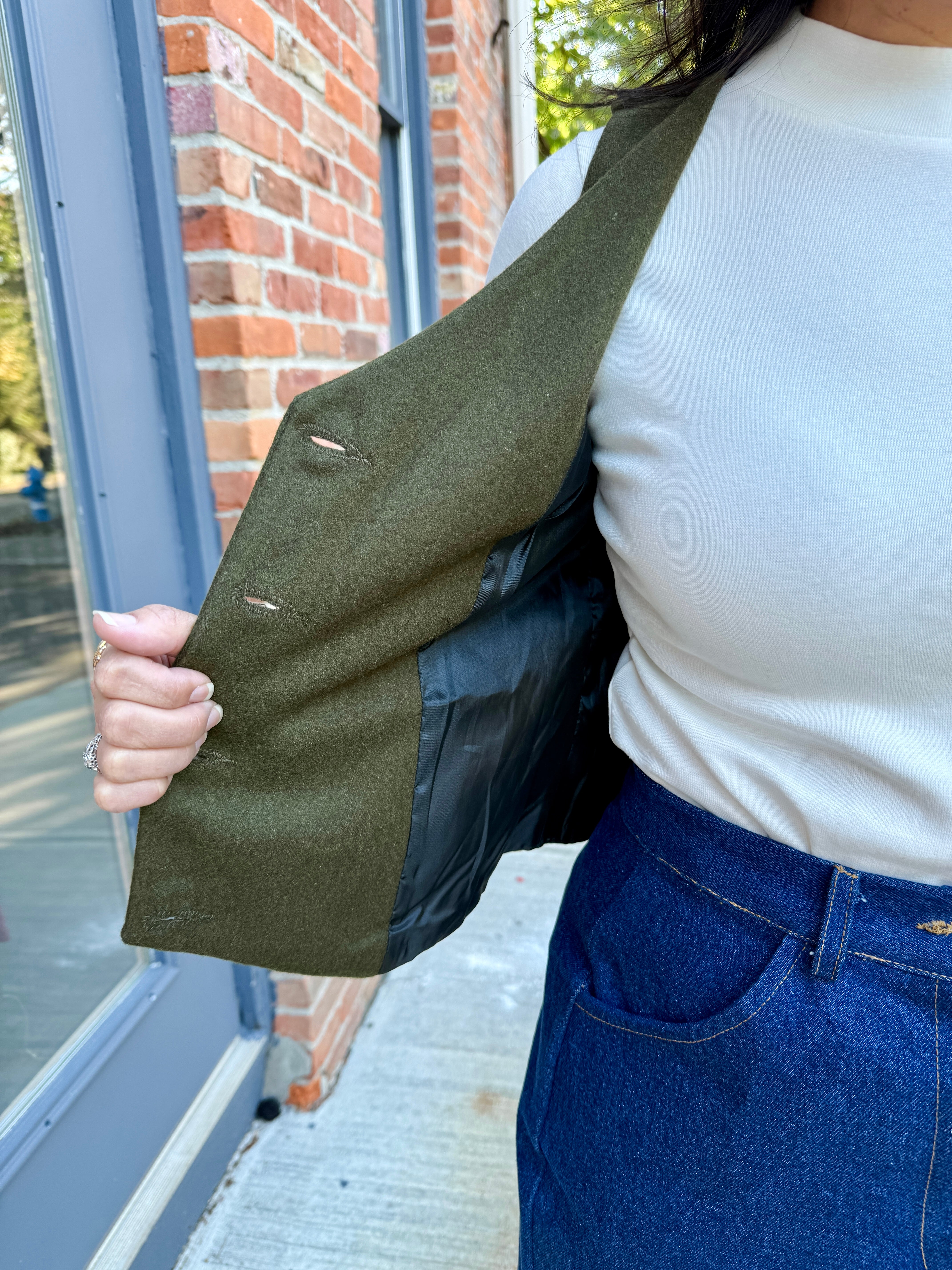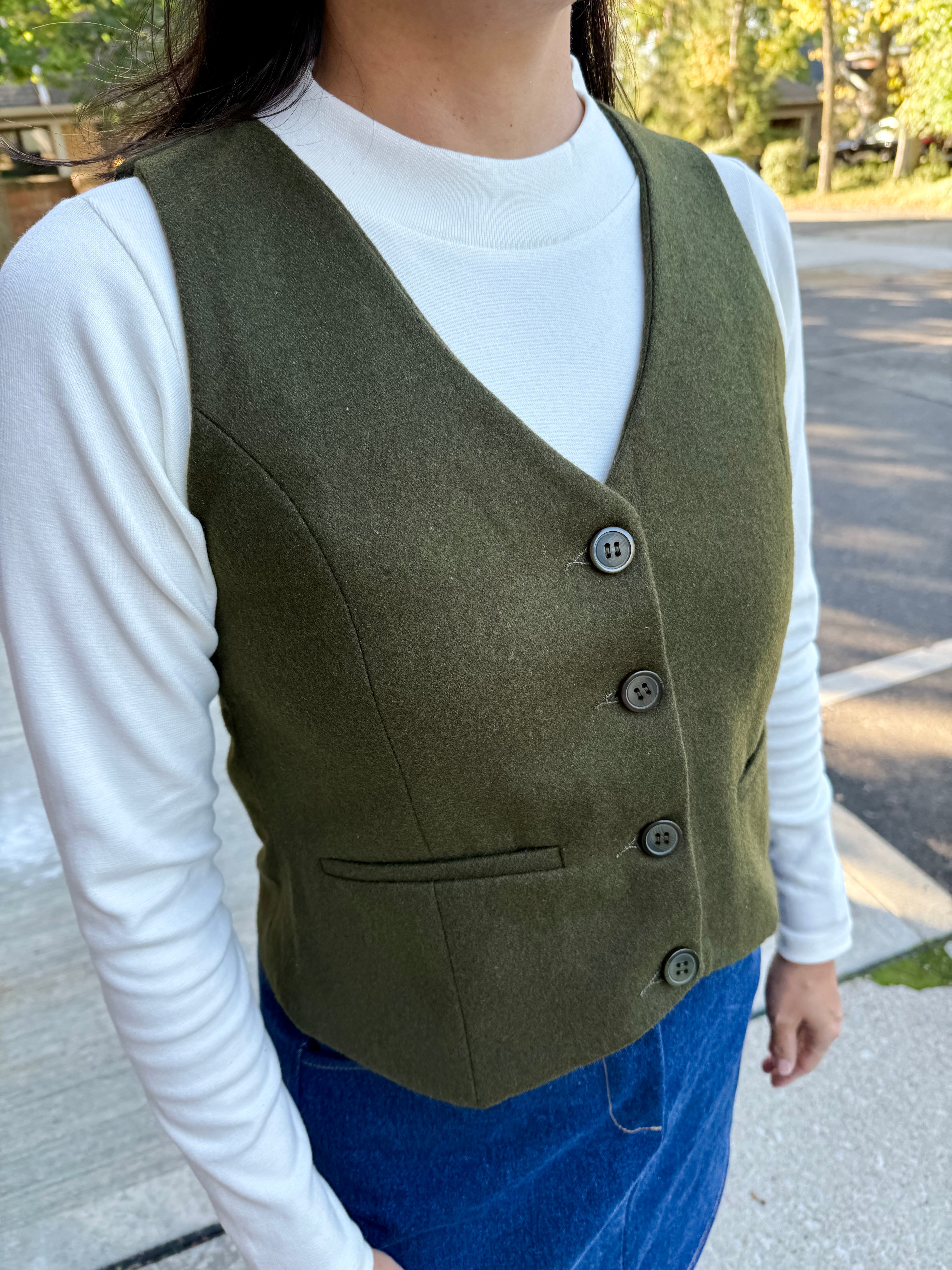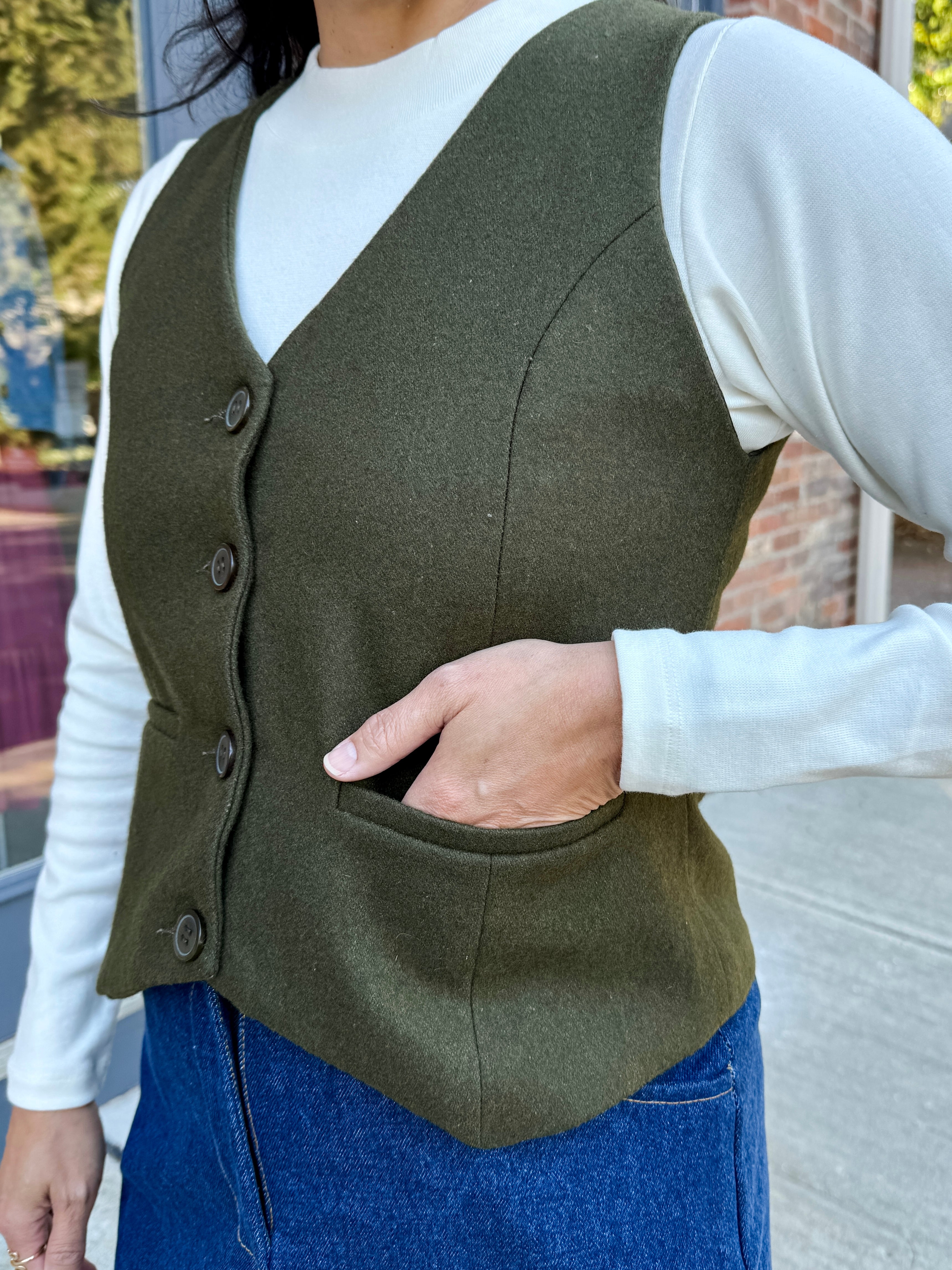 Elevate your fall and winter wardrobe with this sophisticated button-front vest in rich Rifle Green, crafted from premium wool and tweed surplus fabrics. This menswear-inspired piece combines timeless style with sustainable fashion.