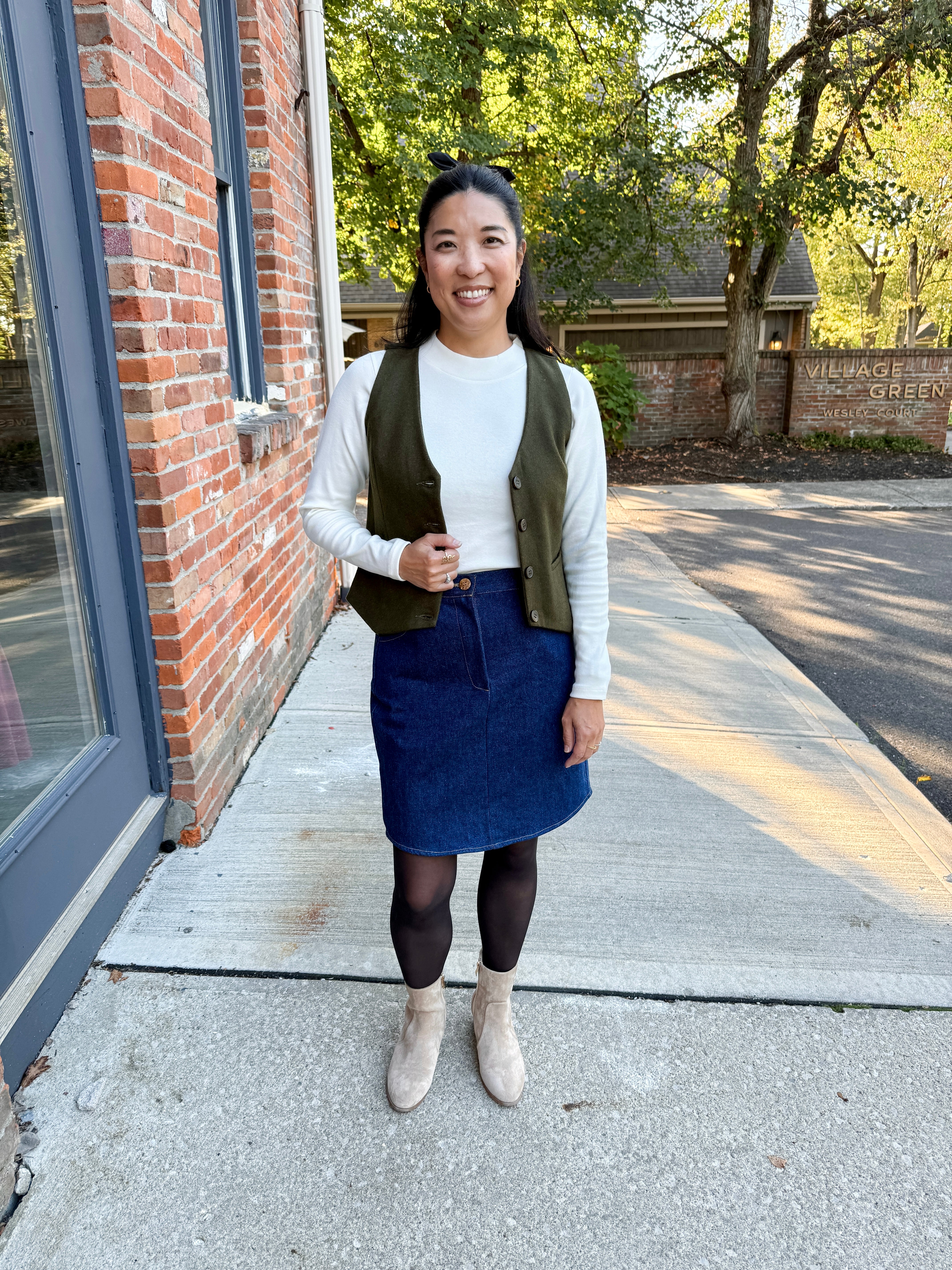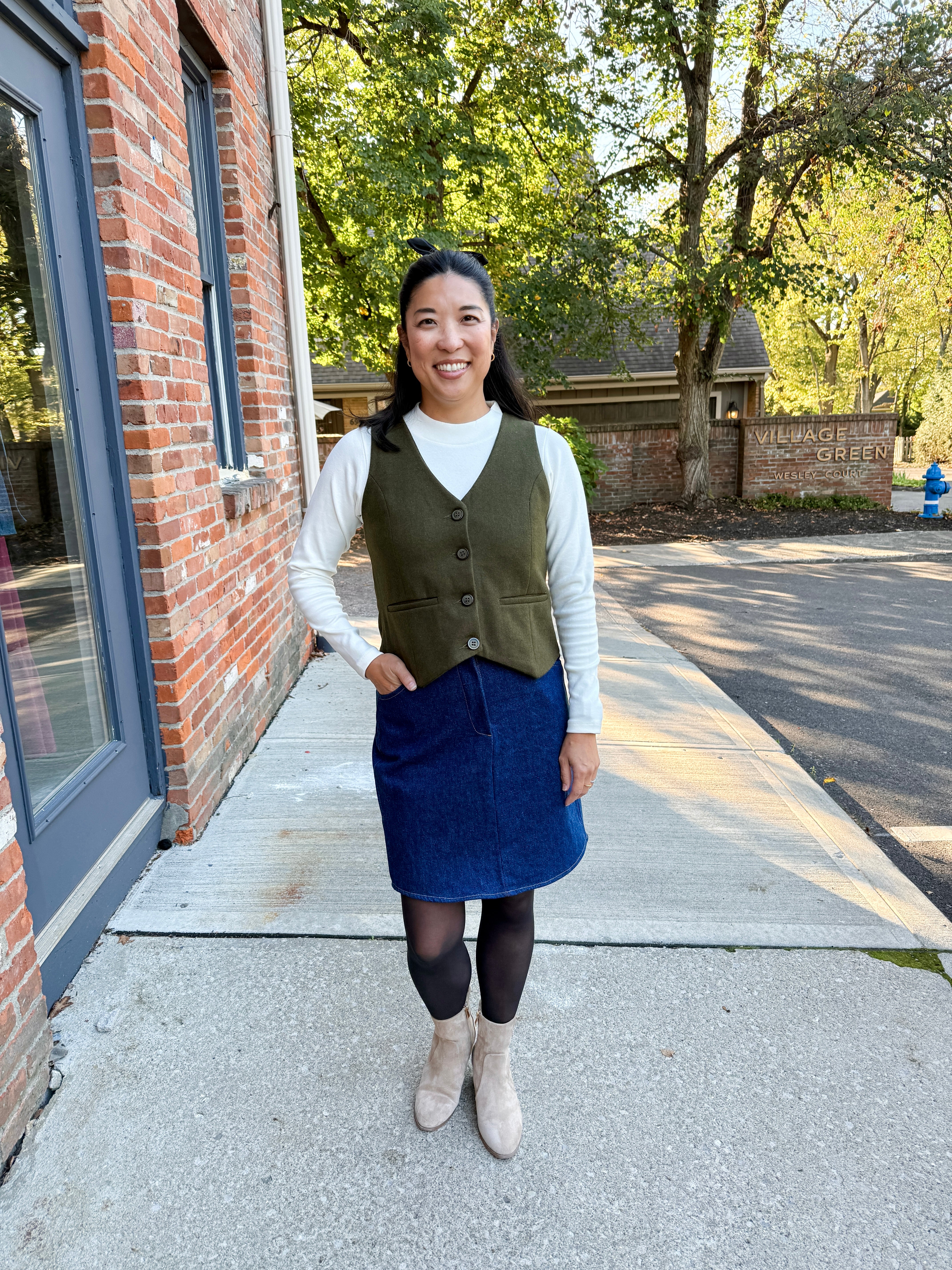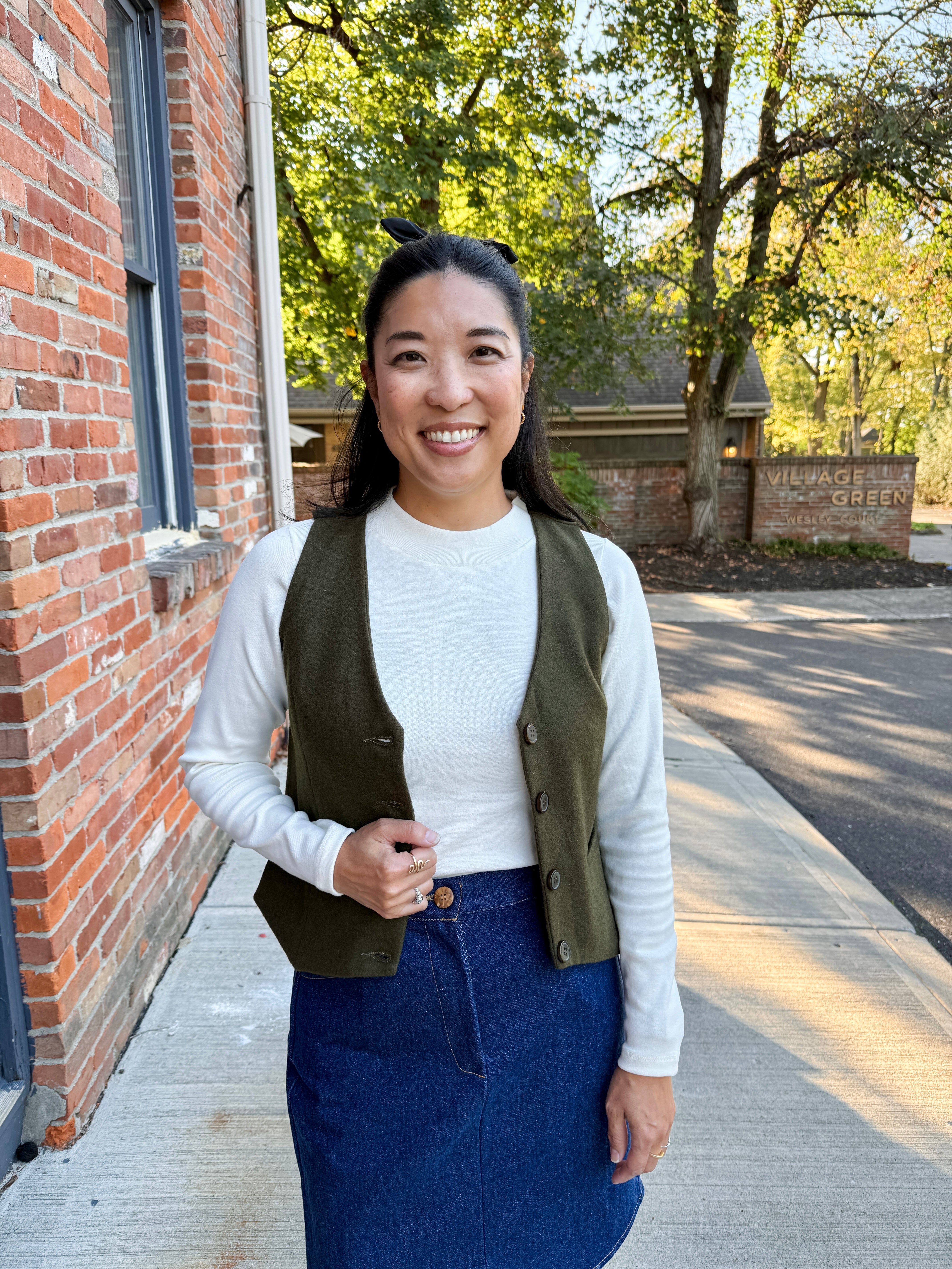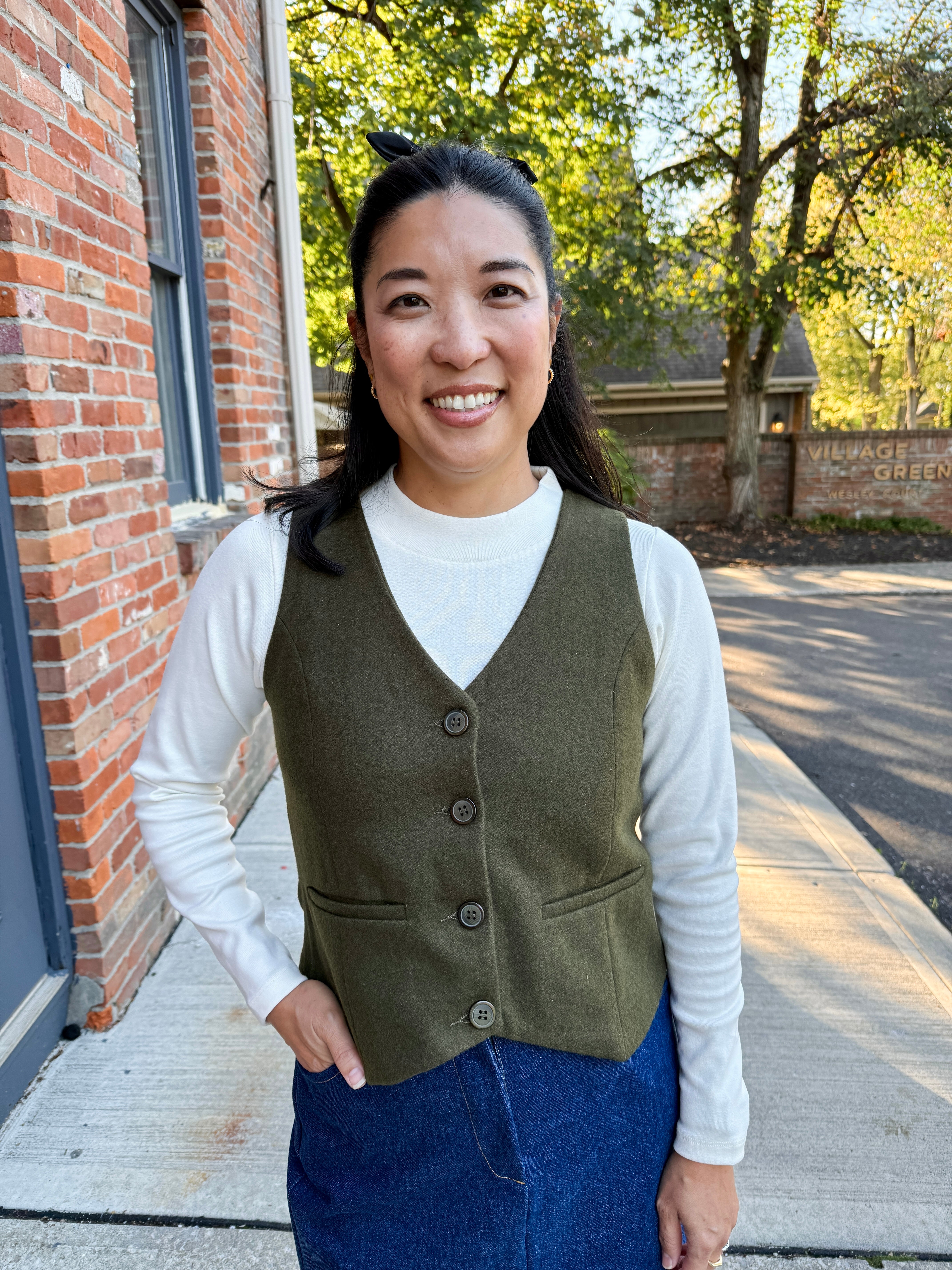 Elevate your fall and winter wardrobe with this sophisticated button-front vest in rich Rifle Green, crafted from premium wool and tweed surplus fabrics. This menswear-inspired piece combines timeless style with sustainable fashion.