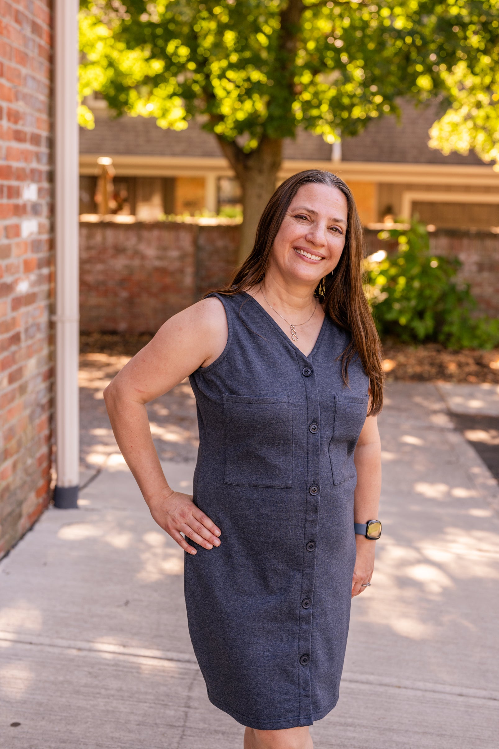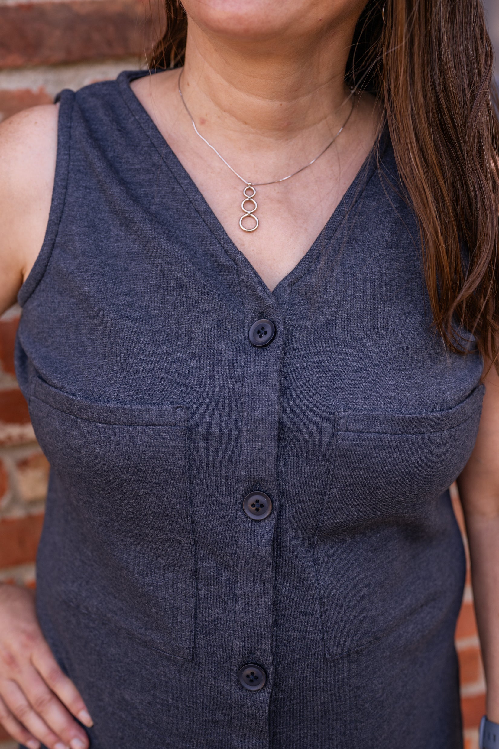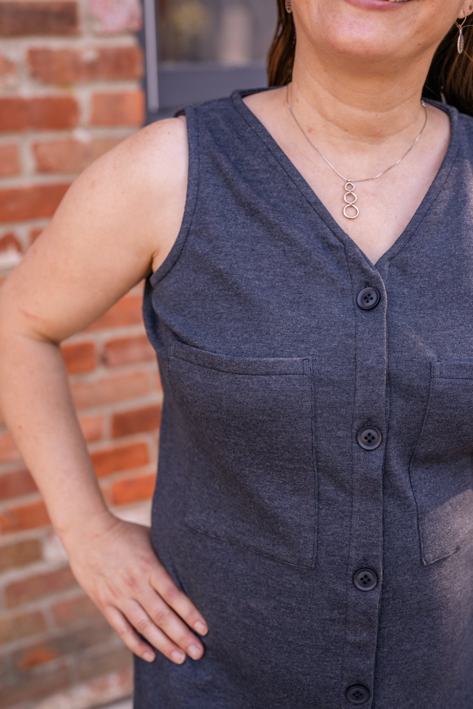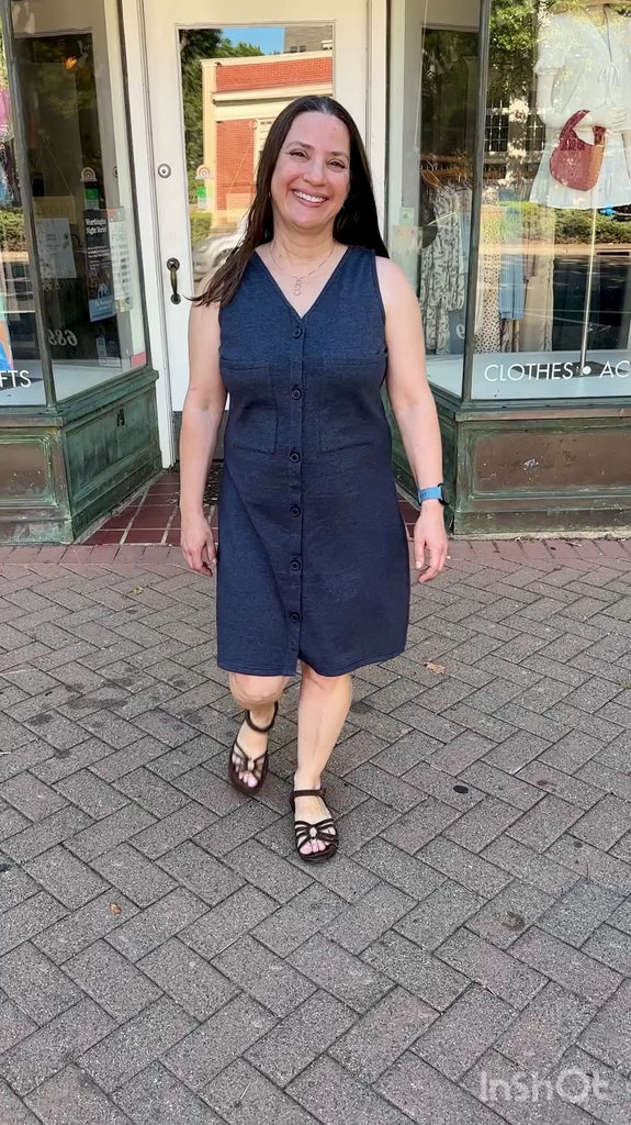 The Annie Button-Front Dress is your versatile wardrobe essential that transitions effortlessly through every season. This sleeveless mini dress features functional button-front closure with hidden snaps to prevent gapping, a flattering V-neckline, and convenient front pockets.
