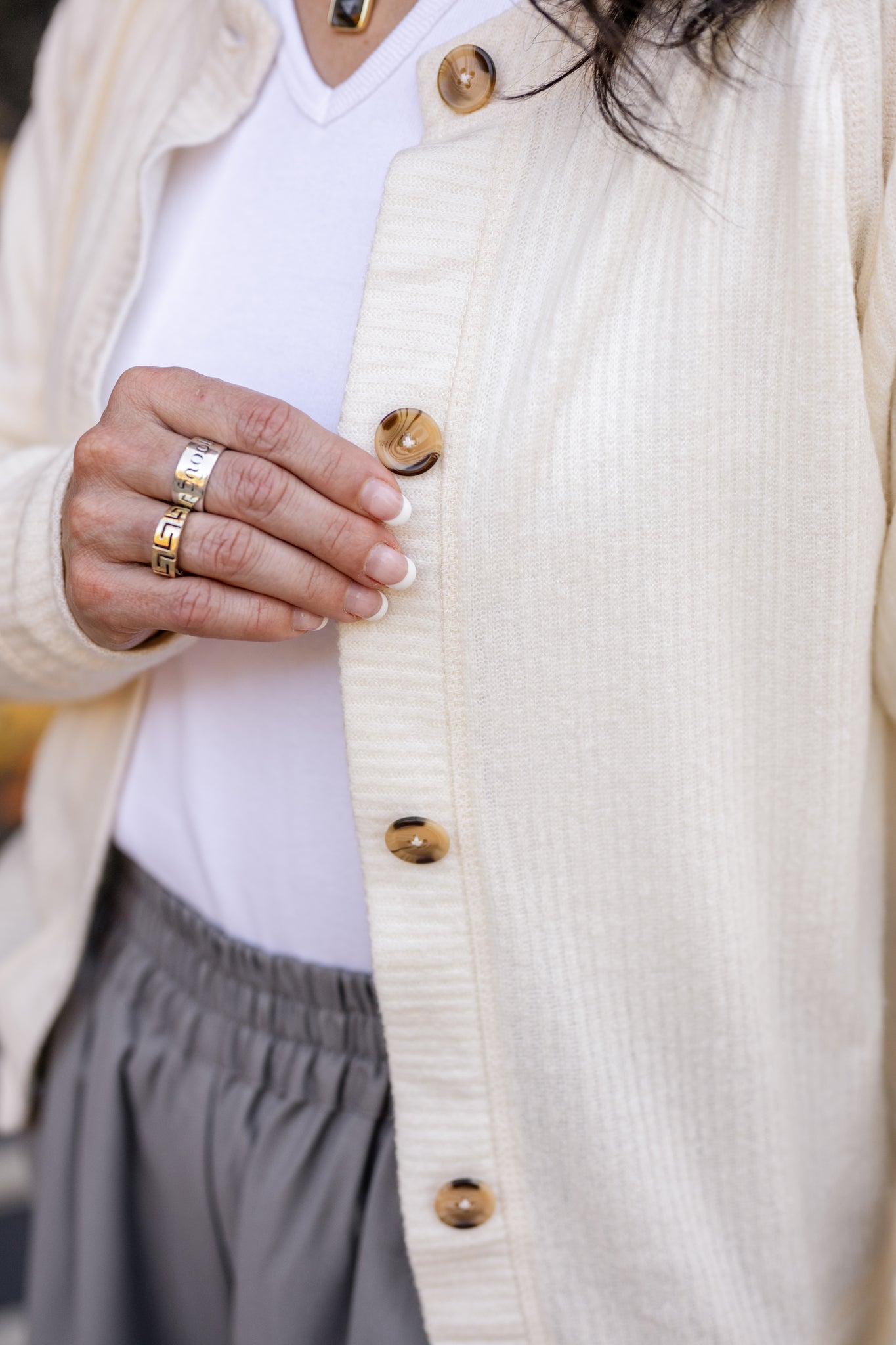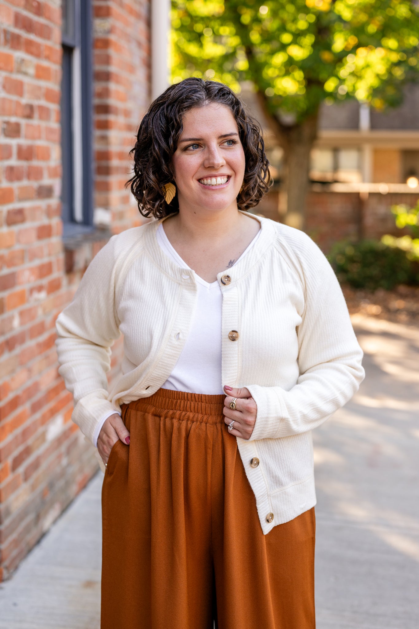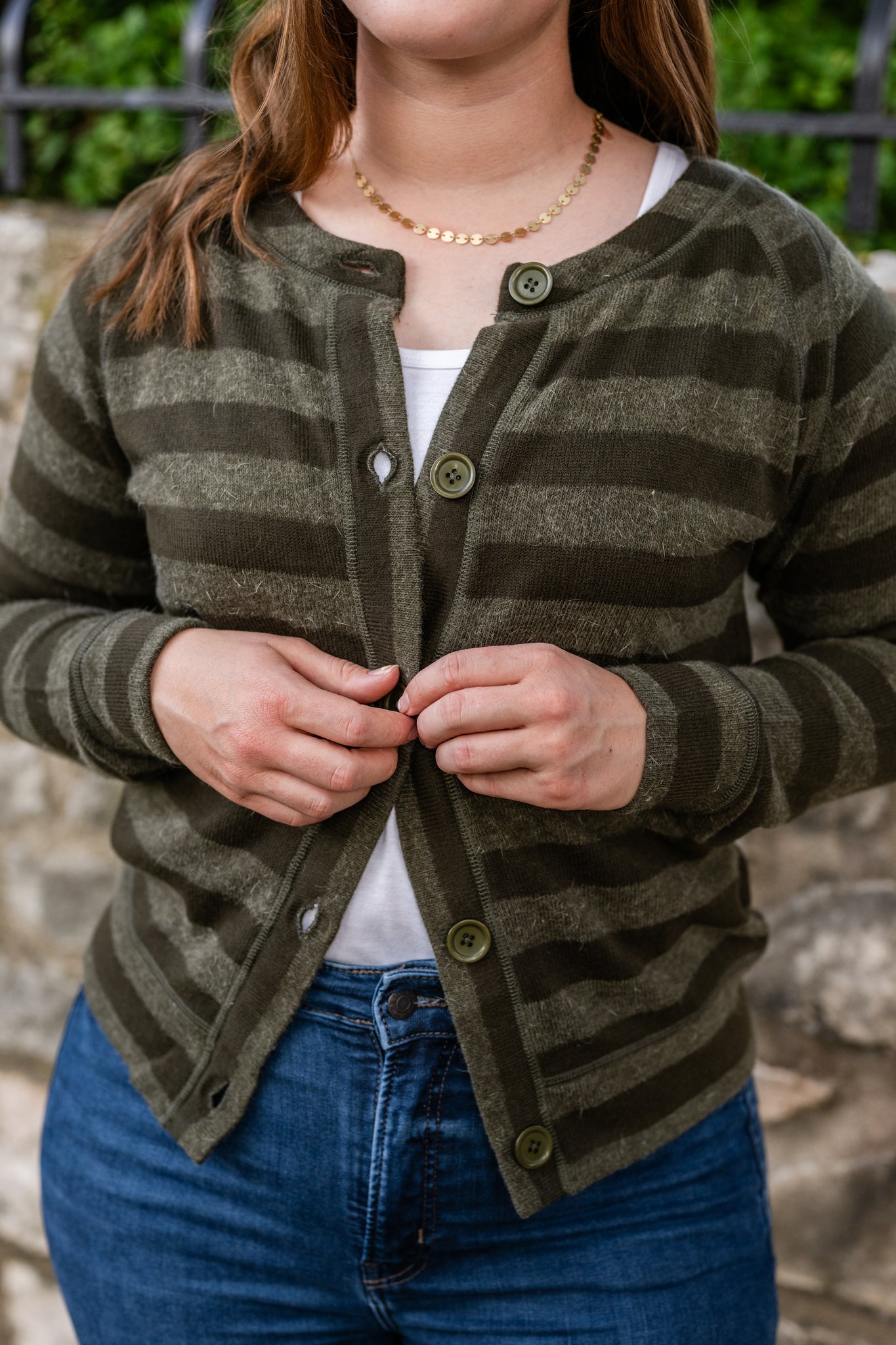 Classic button-up cardigan with unique sleeve detail and matching functional buttons. Made from mixed sweater knit surplus fabrics.