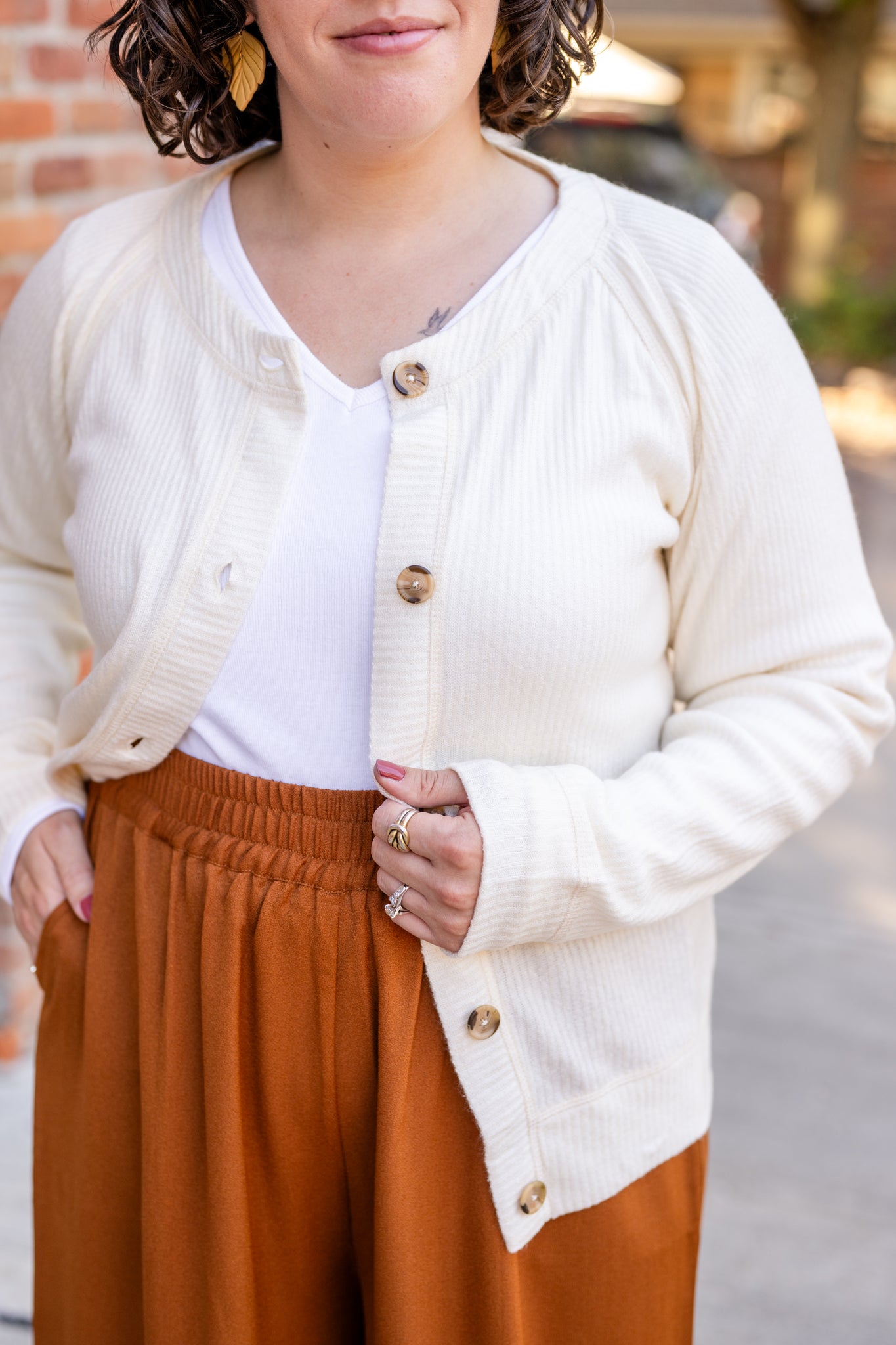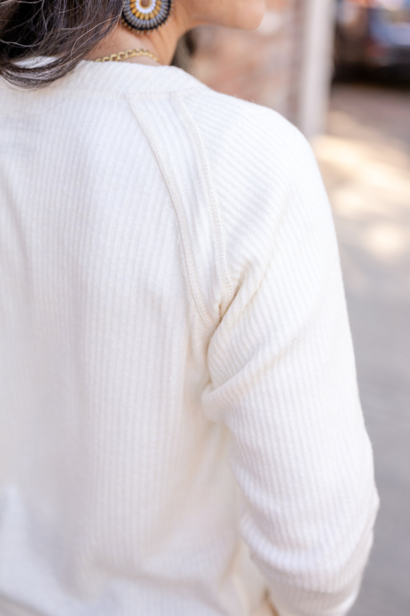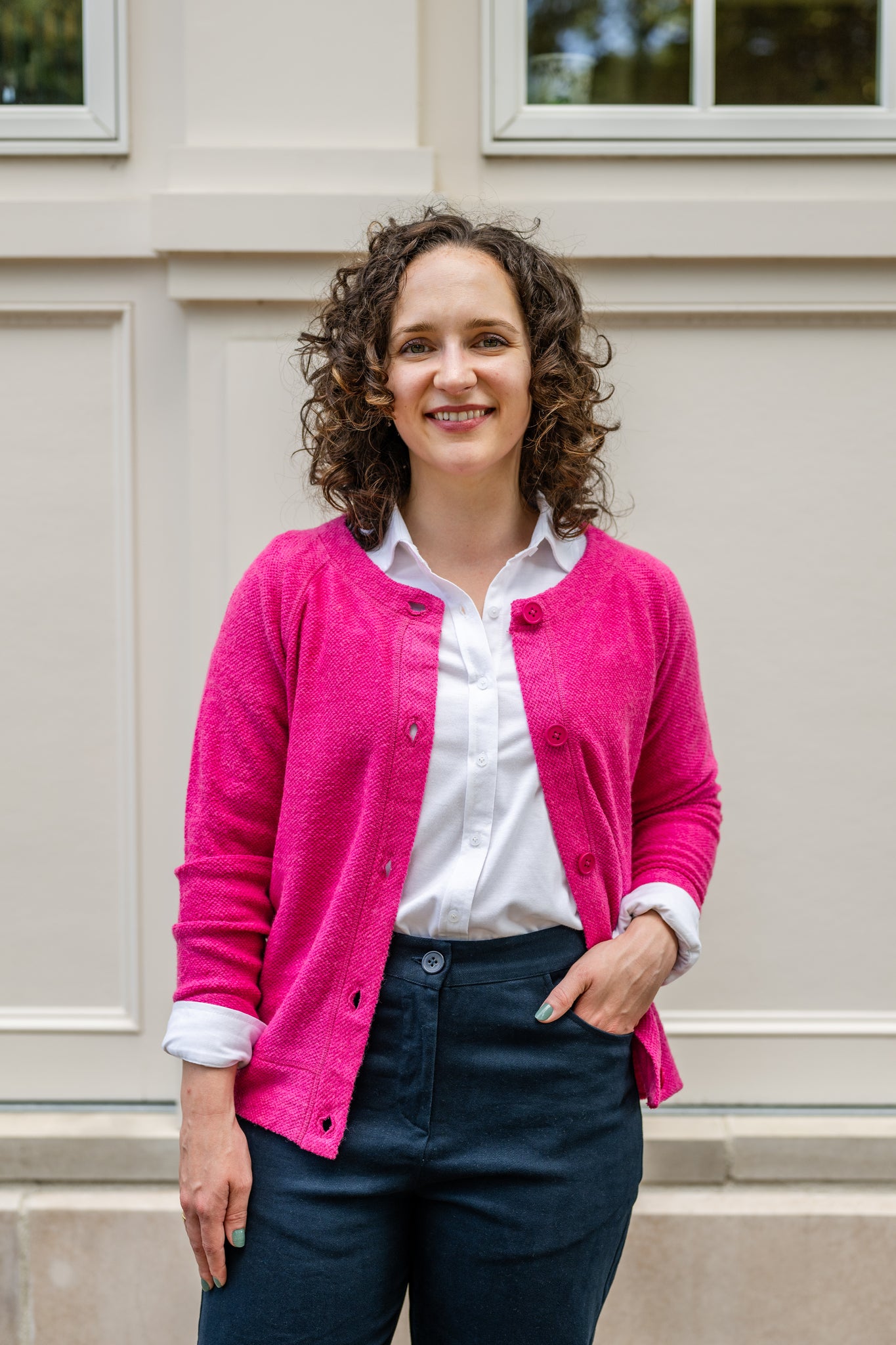 Classic button-up cardigan with unique sleeve detail and matching functional buttons. Made from mixed sweater knit surplus fabrics.