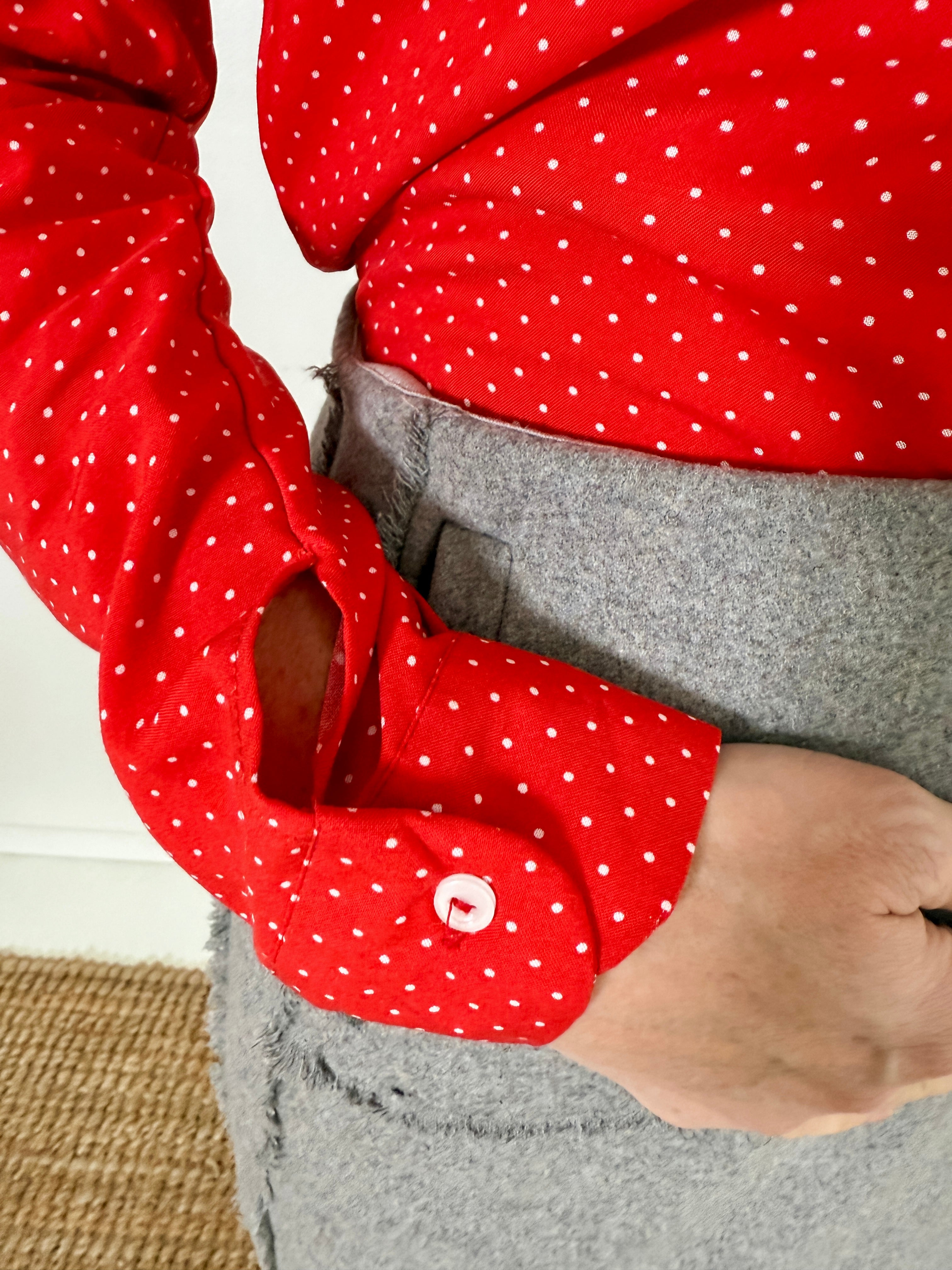 - Long sleeves with button cuffs and elegant back yoke pleat