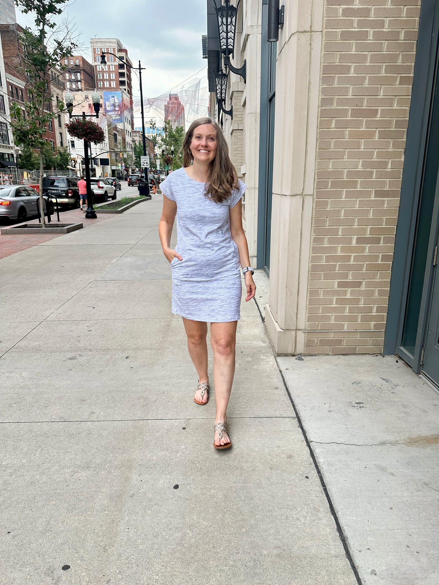 Heathered gray worn by Maggie size S and Brittany size L | Olive worn by Elisabeth size S and Kelly size XL (sized up one size from her top size)| Heathered Blue worn by Rebekah size M and Rachel size 2X (sized up one size from her top size)