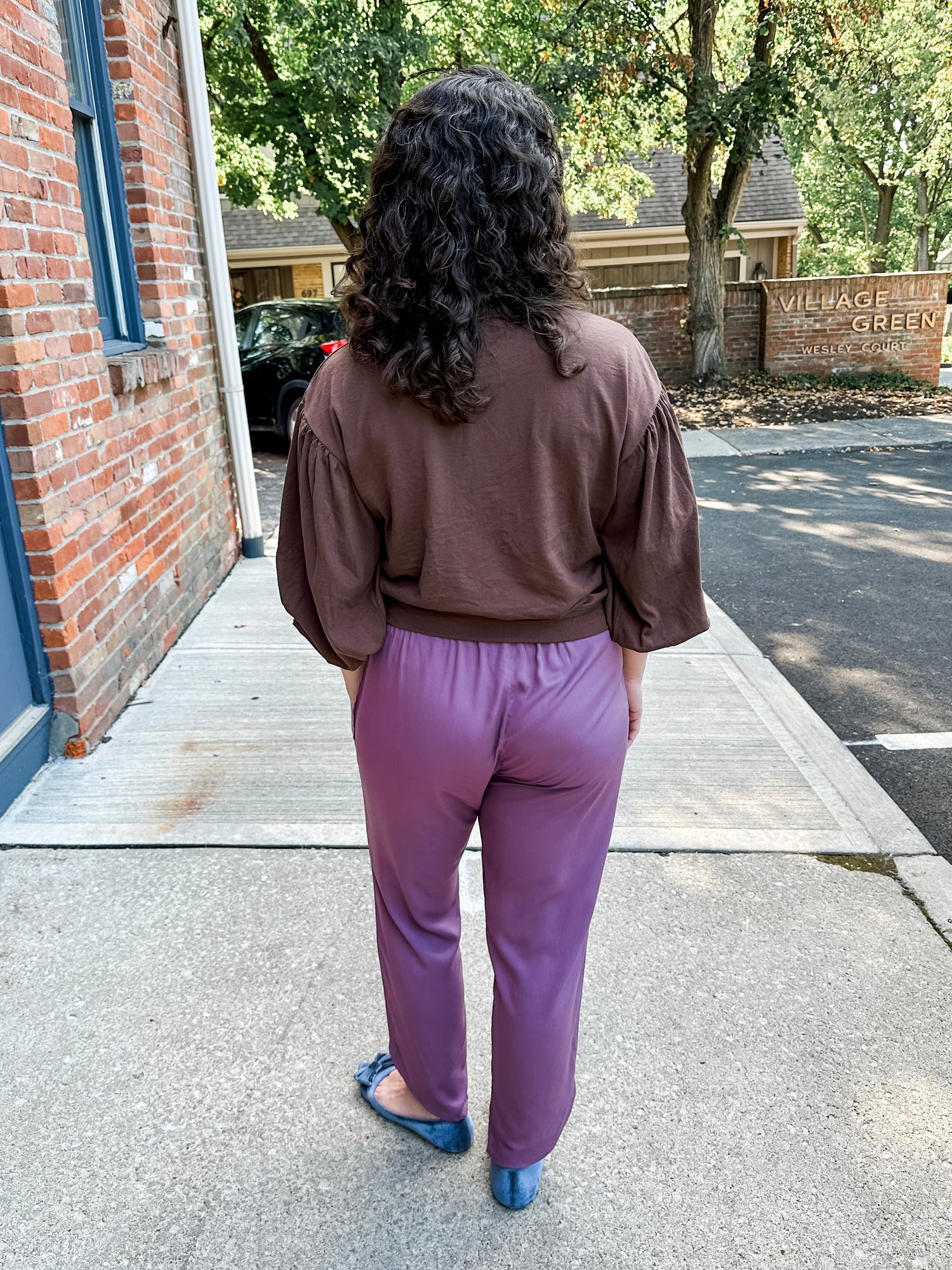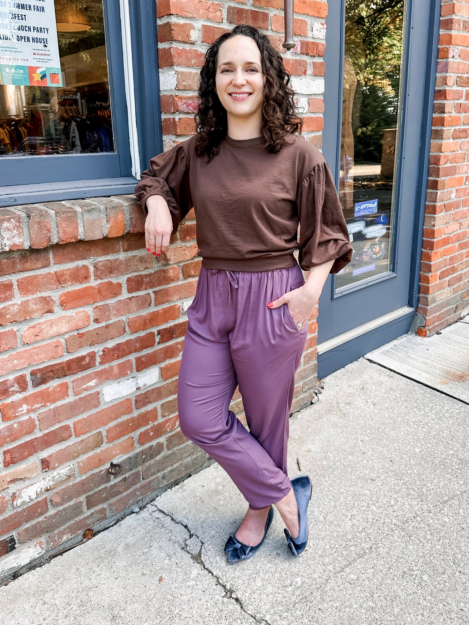 - Models are shown wearing their typical size bottom - size M light eggplant shown on Elisabeth & size S in cocoa wine show on Donna