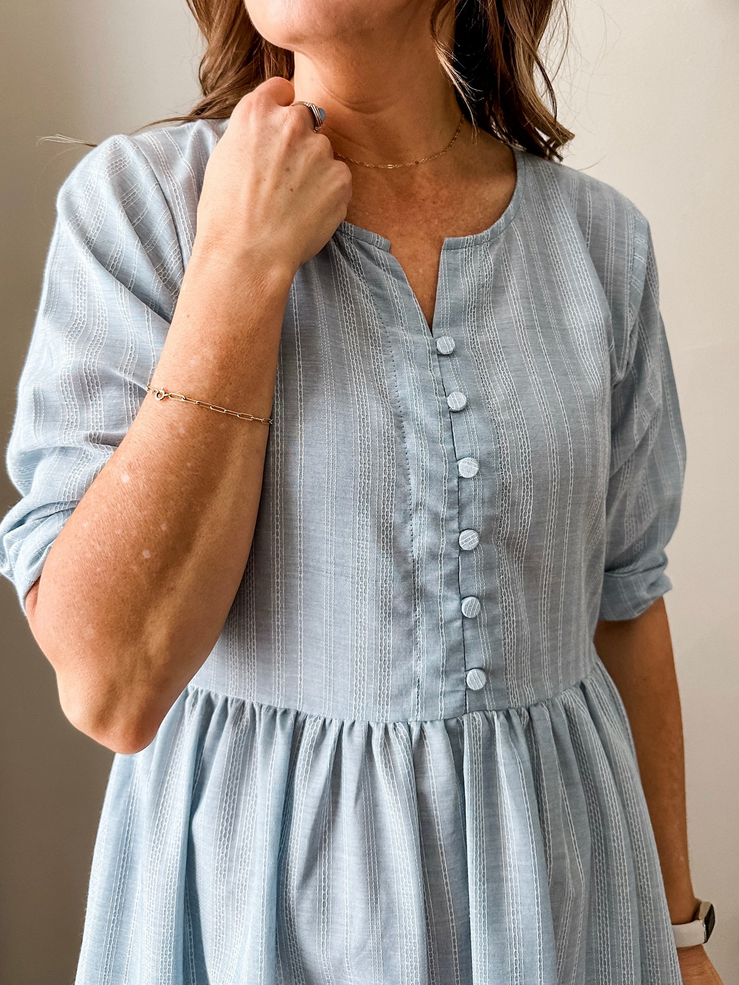 • Models are wearing their typical top size in the dress: Dusty Sky Amy is wearing size S, Nude Pink Maggie is wearing size S
