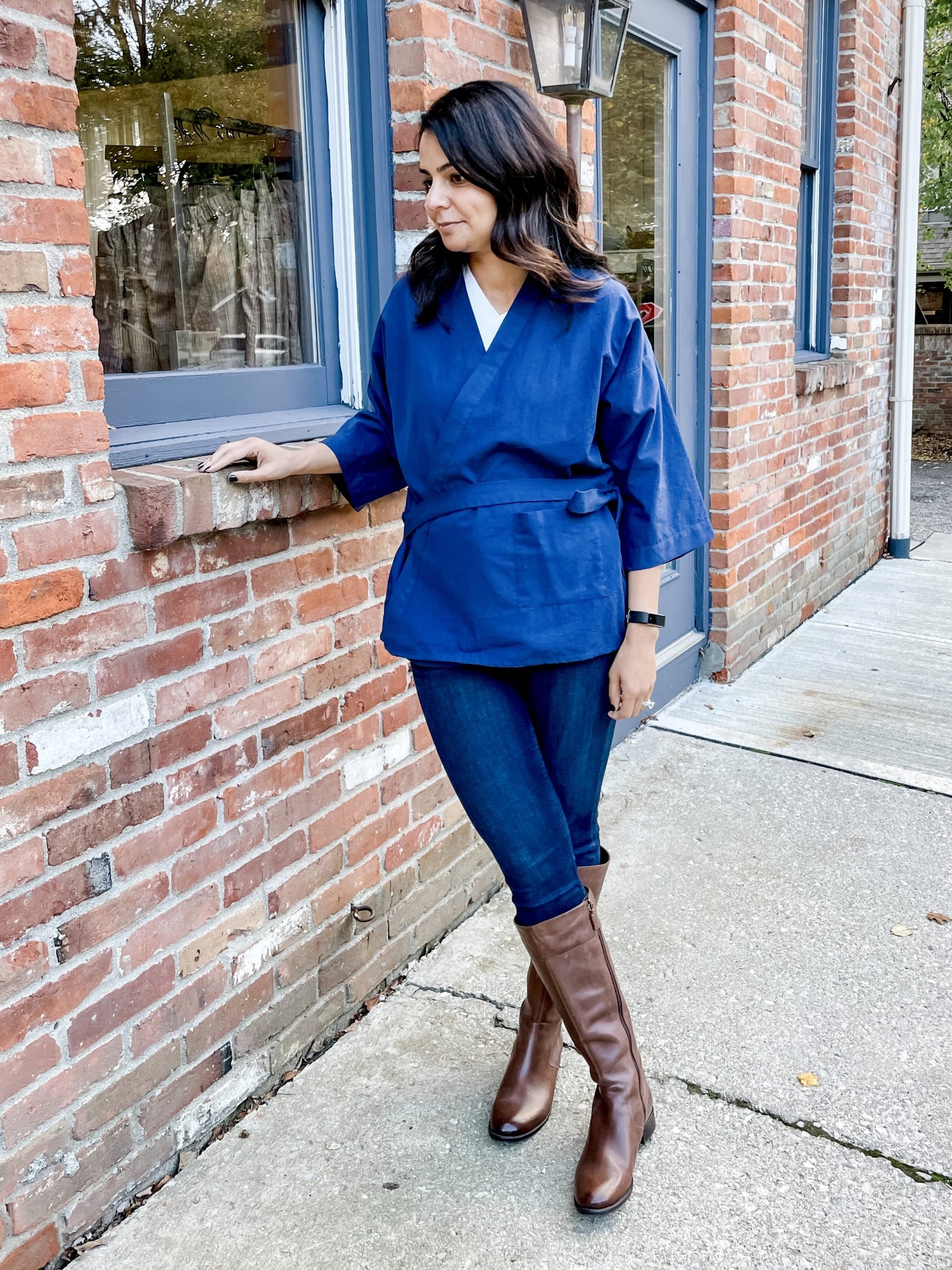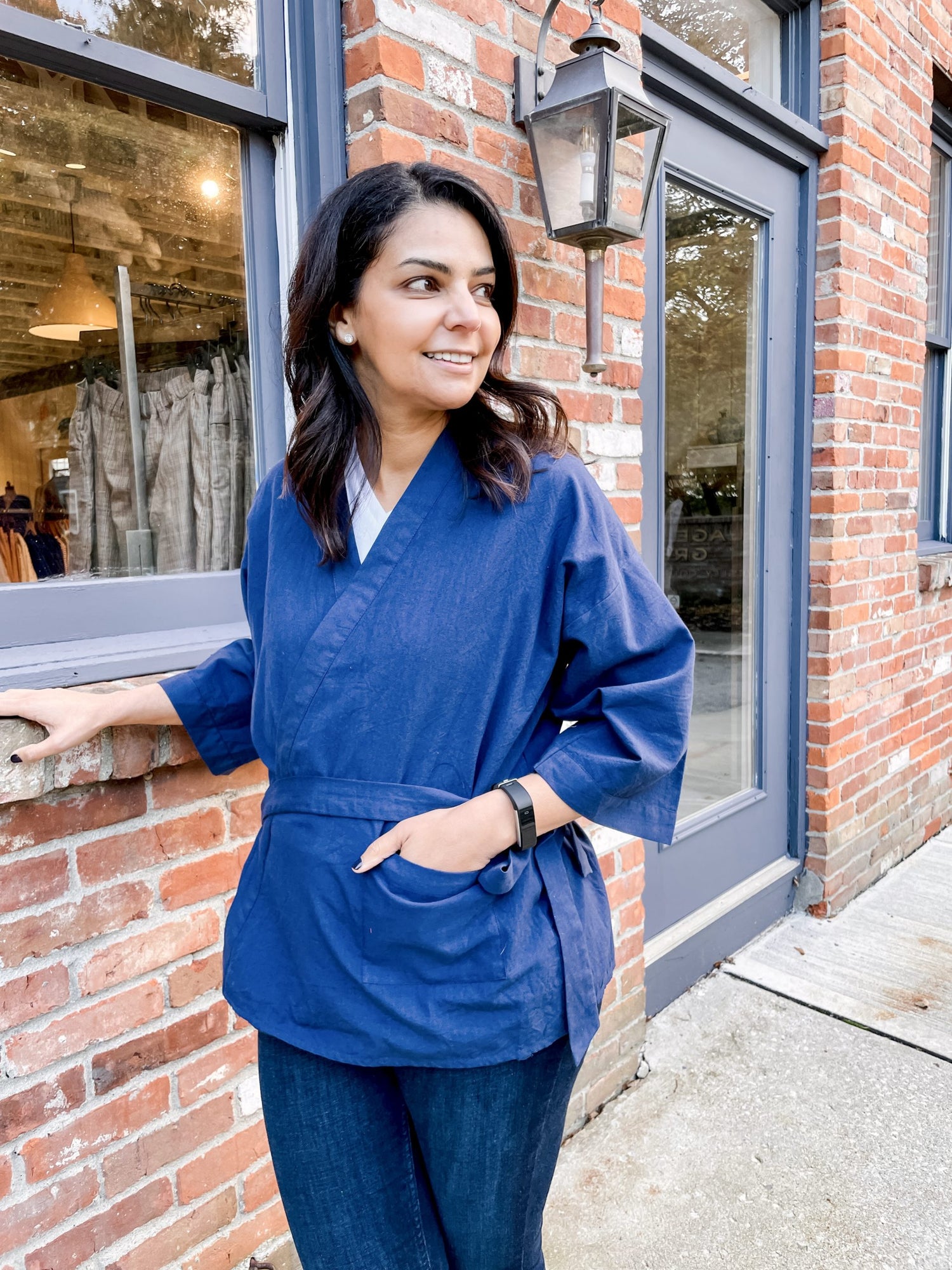 Fit is relaxed with an open crossover front. We recommend choosing your typical shirt. If you consider yourself curvy, we recommend choosing the larger size range of the jacket.