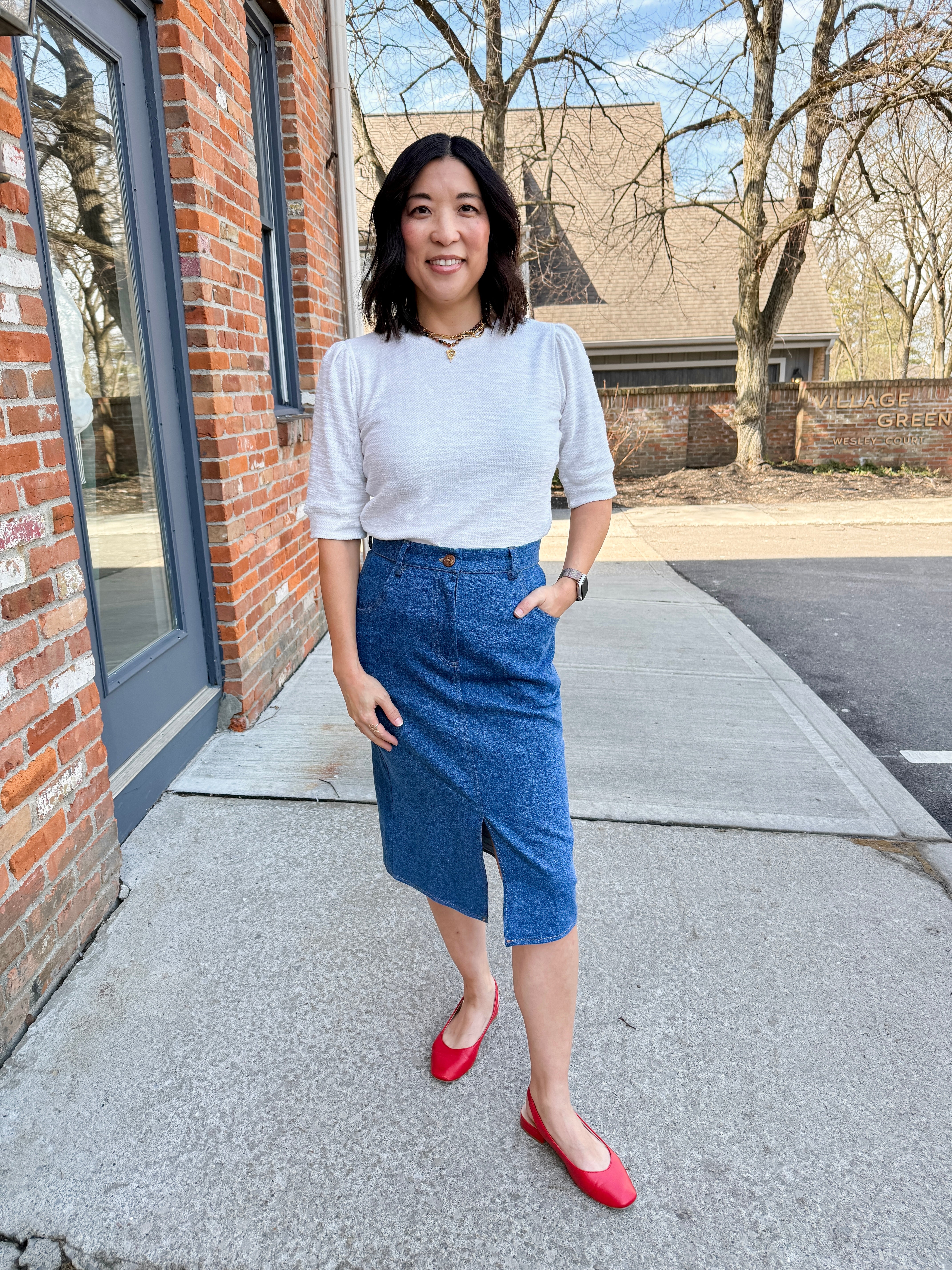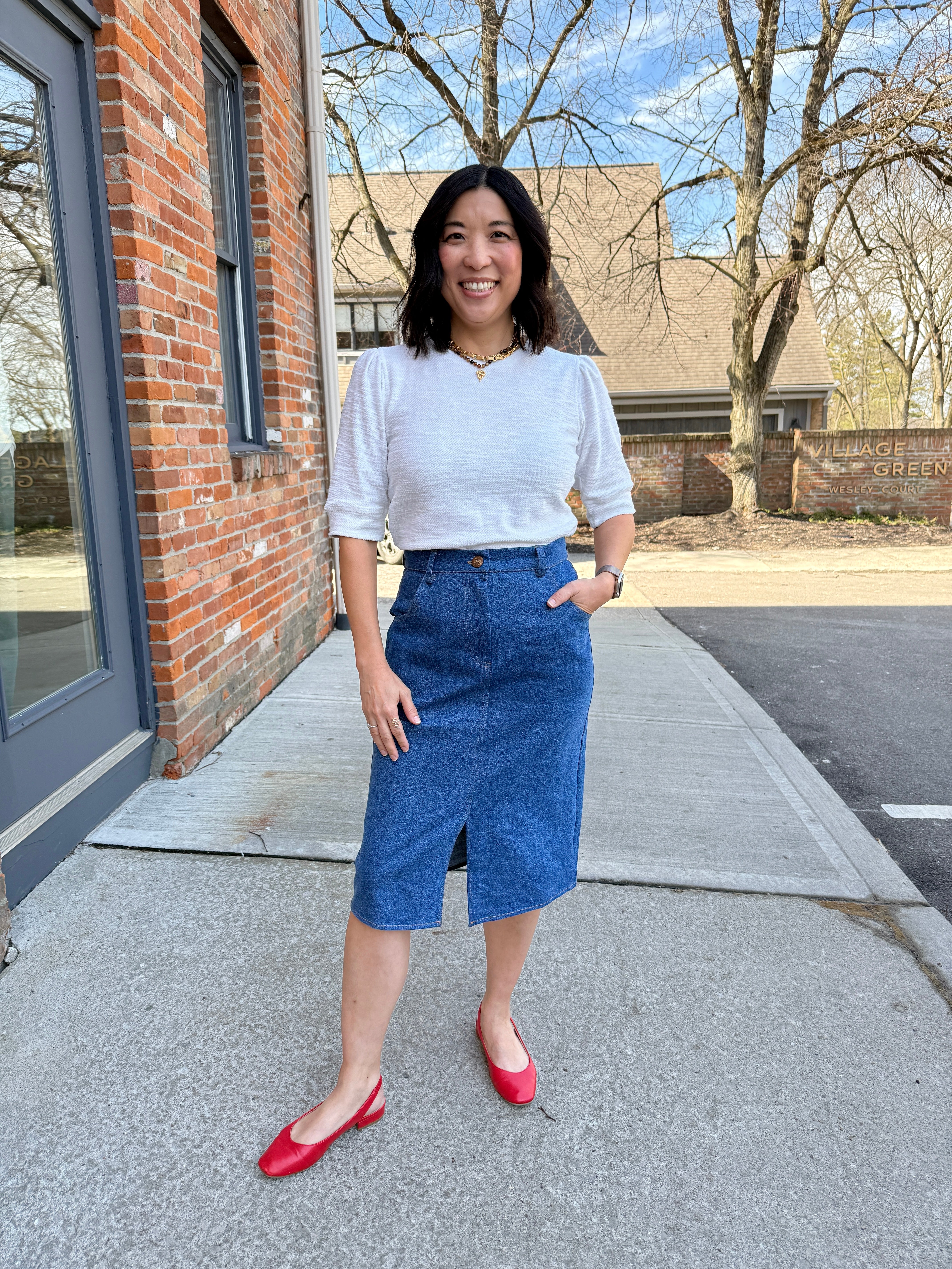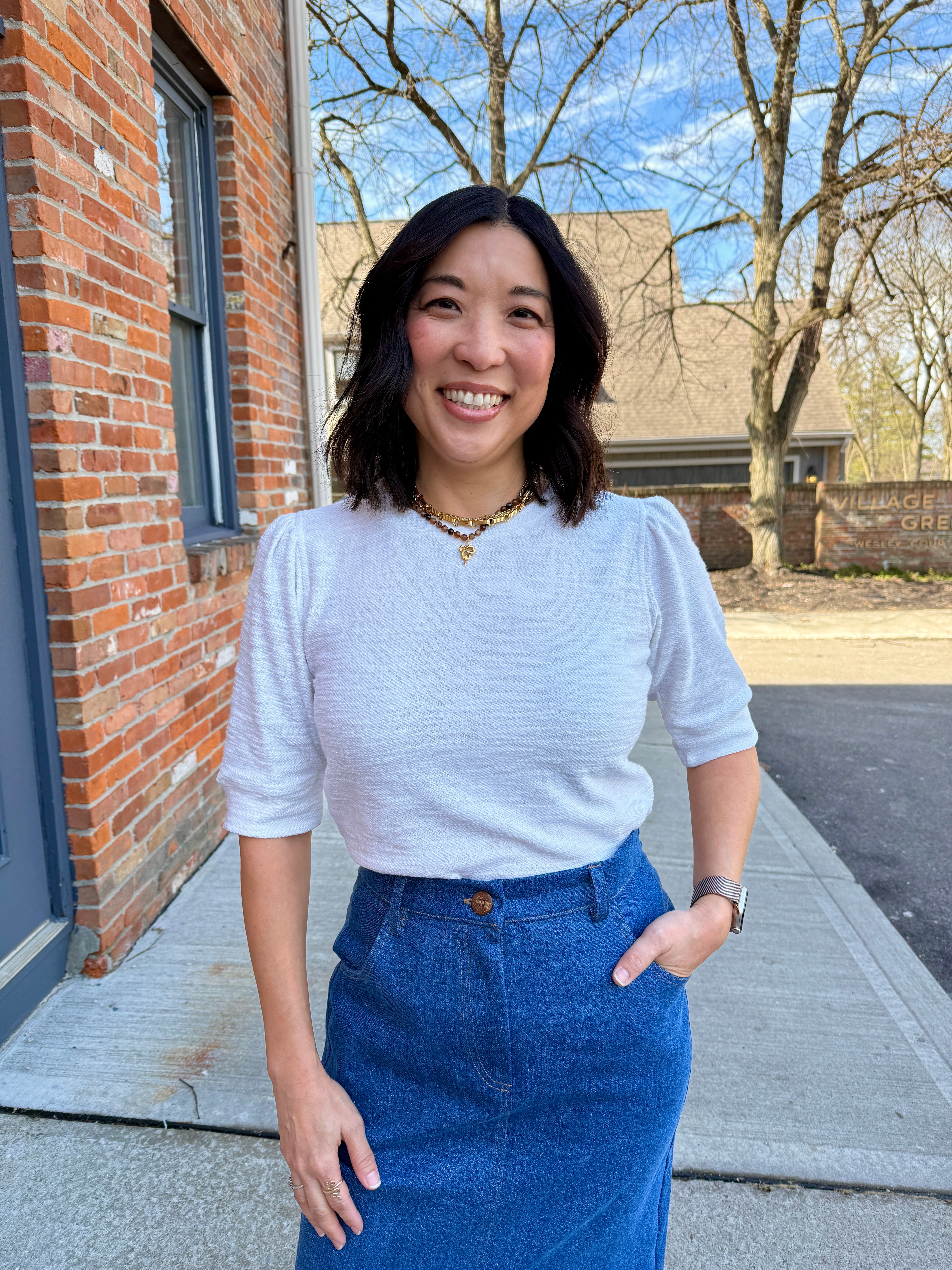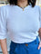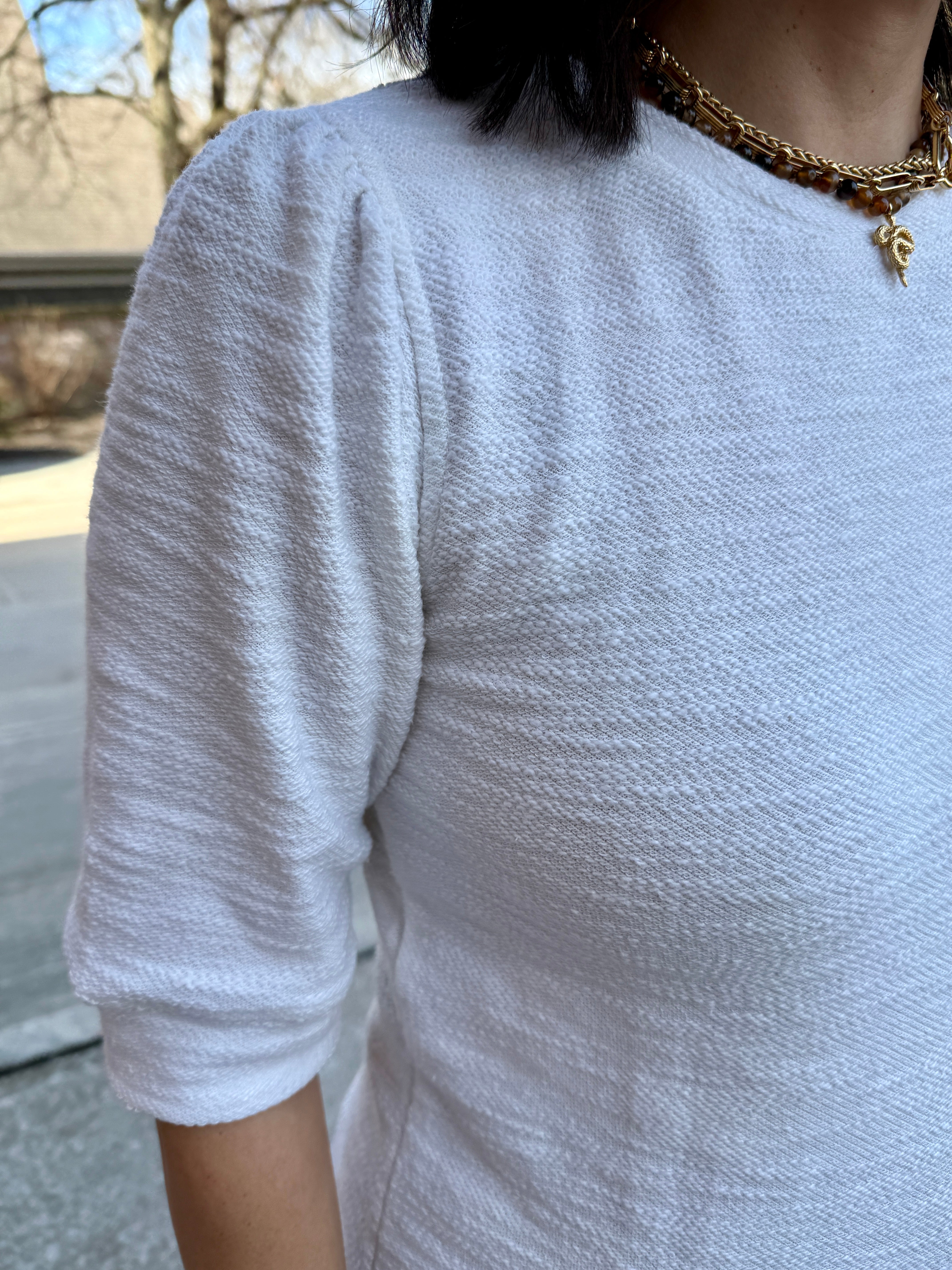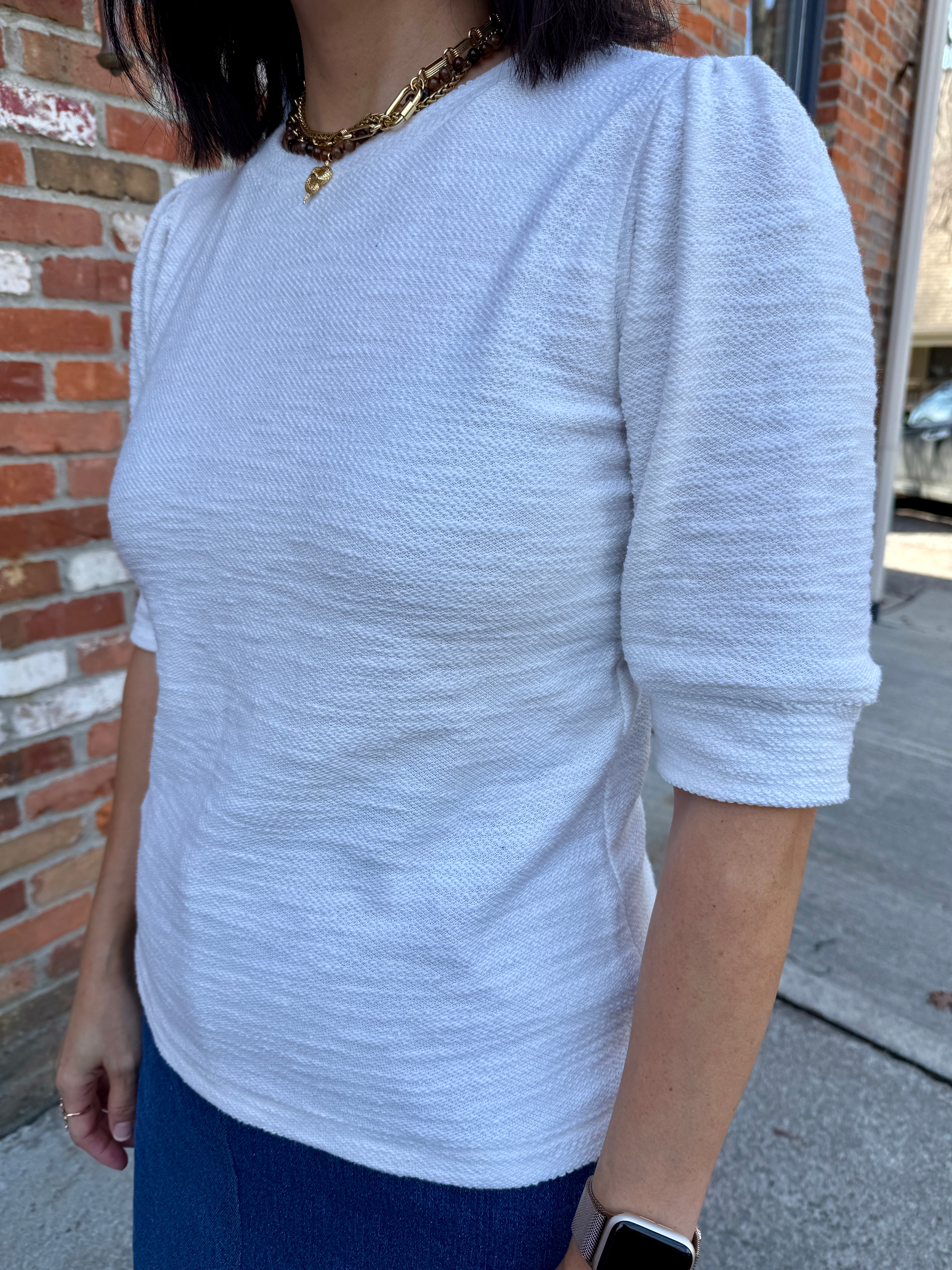 A versatile lightweight sweater with elbow-length sleeves and subtle shoulder gathering detail.