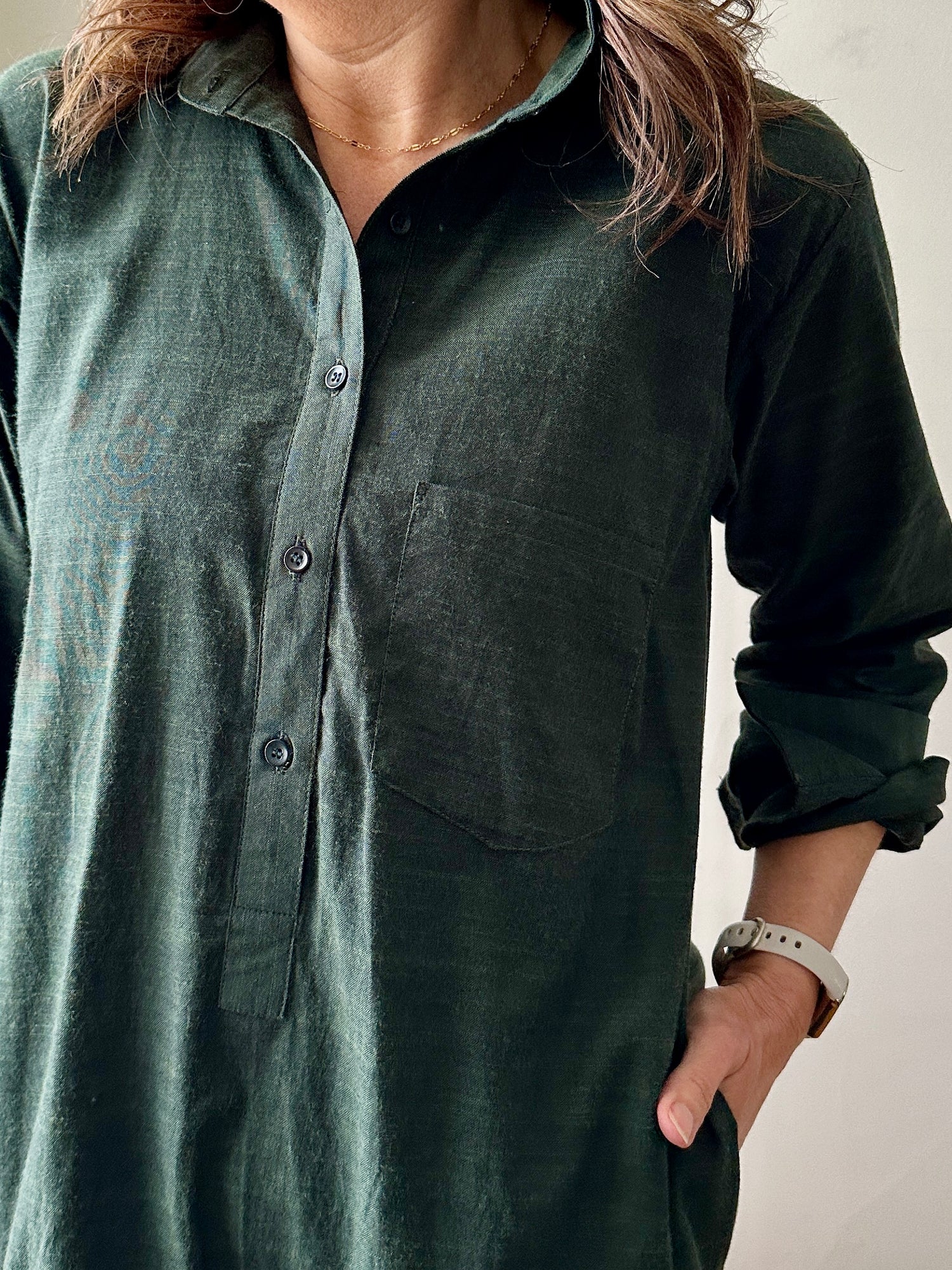 Relaxed fit with no stretch. Size for chest. Try-on models wore typical button up shirt size.