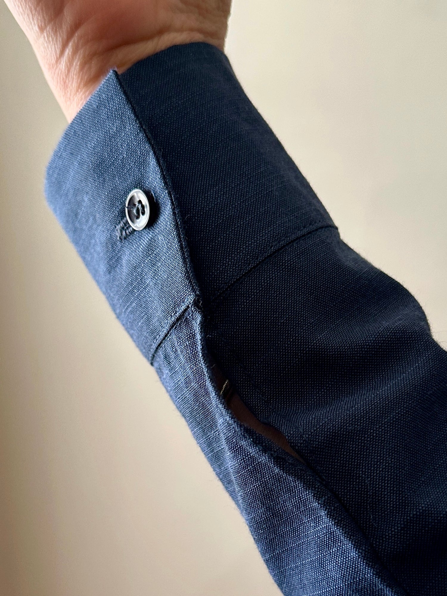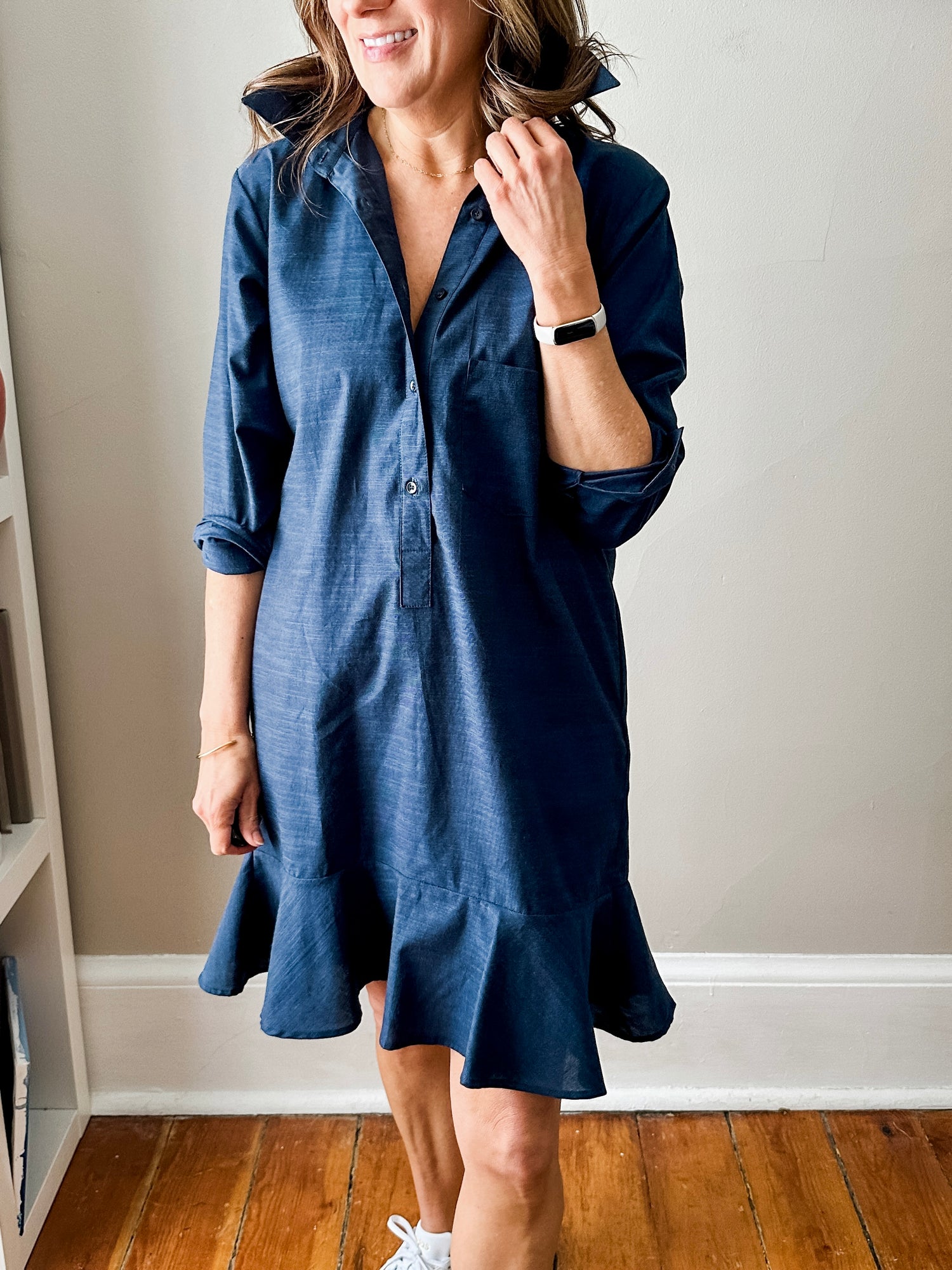 Relaxed fit with no stretch. Size for chest. Try-on models wore typical button up shirt size.