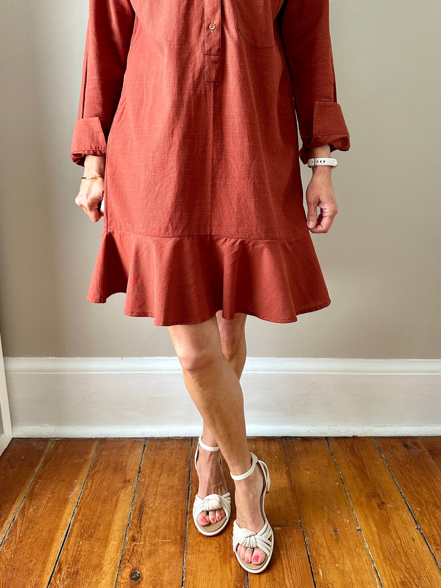 Relaxed fit with no stretch. Size for chest. Try-on models wore typical button up shirt size.
