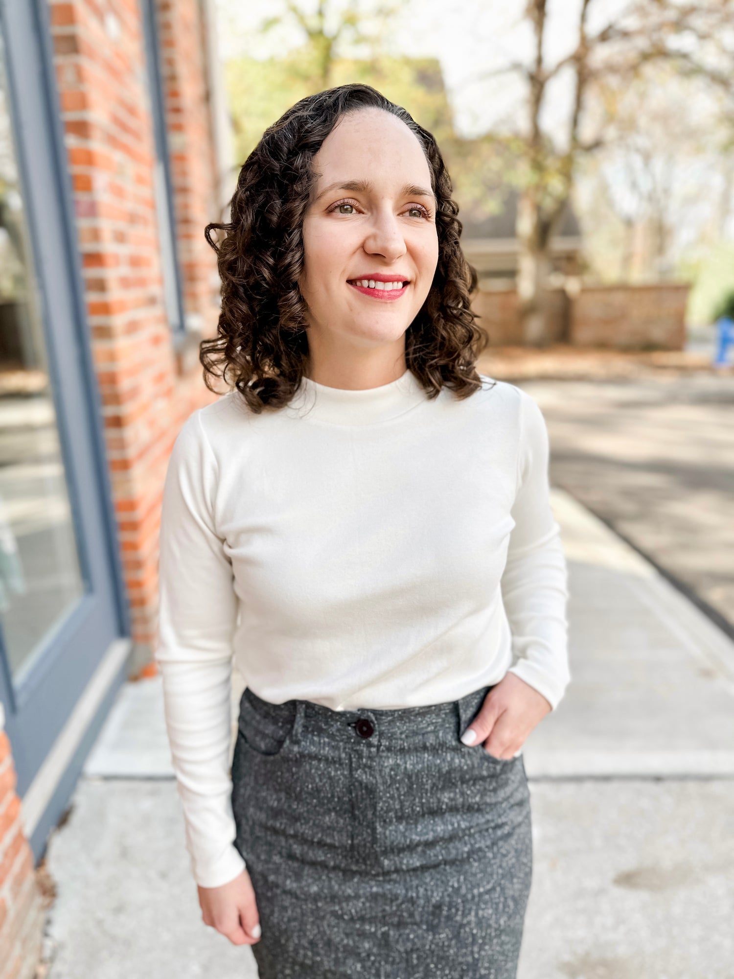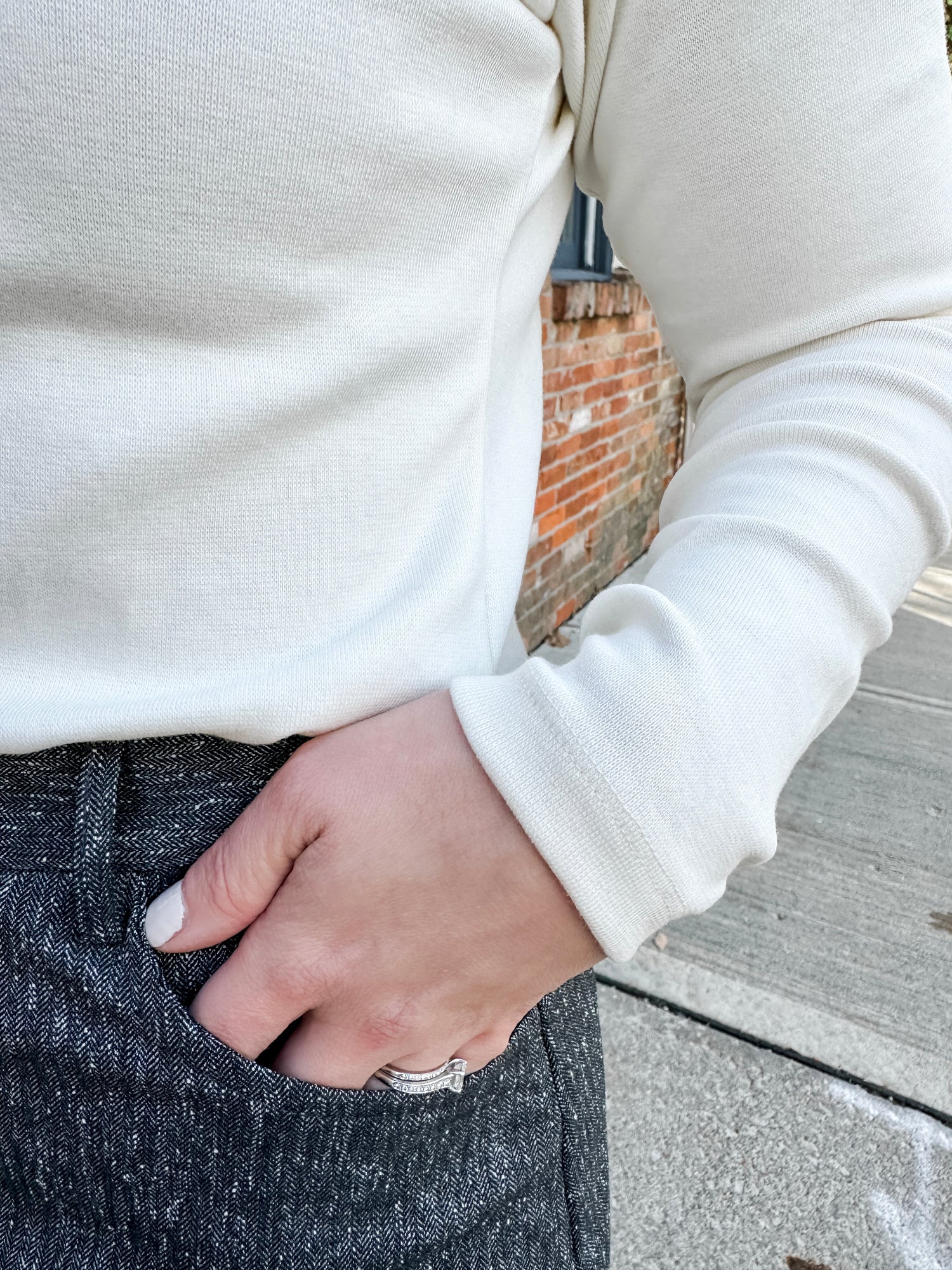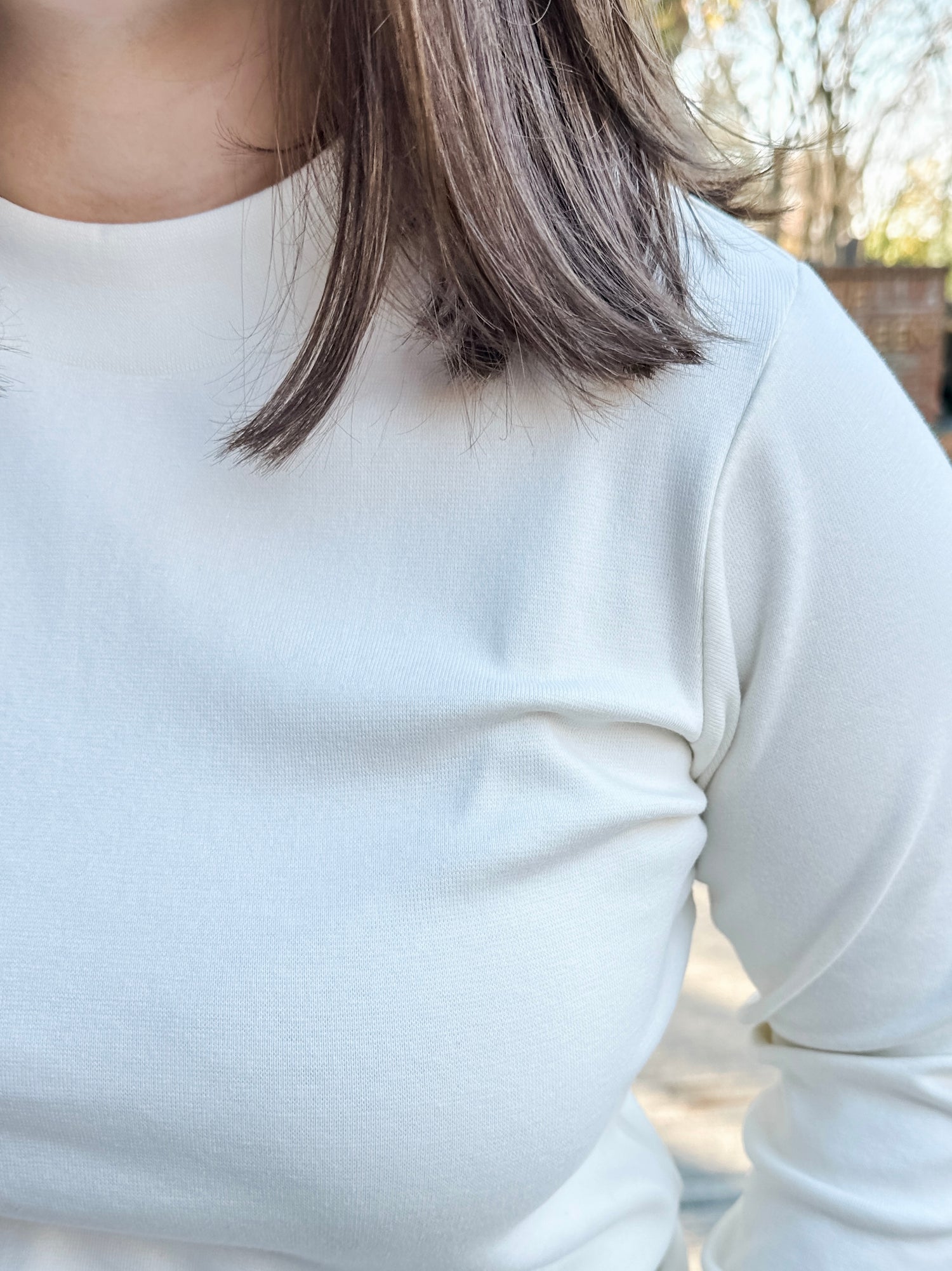 The staple you have been missing. Layering has never been easier with our new long sleeve length “mock” neckline. Customers love that it is not a true “high mock”, the ease of care, the comfortable fabric and now available in a long-sleeve length. Elbow length is available as well.