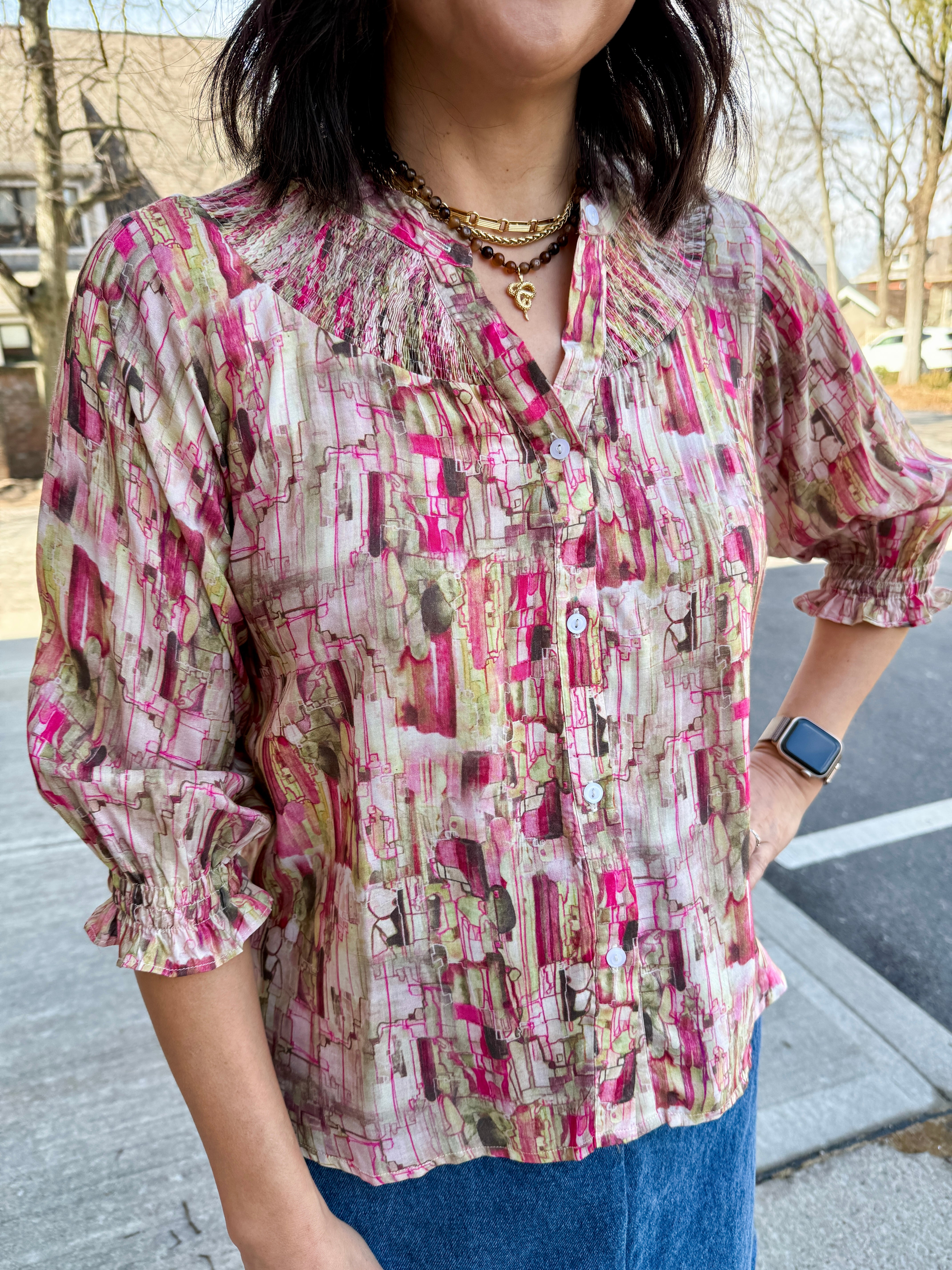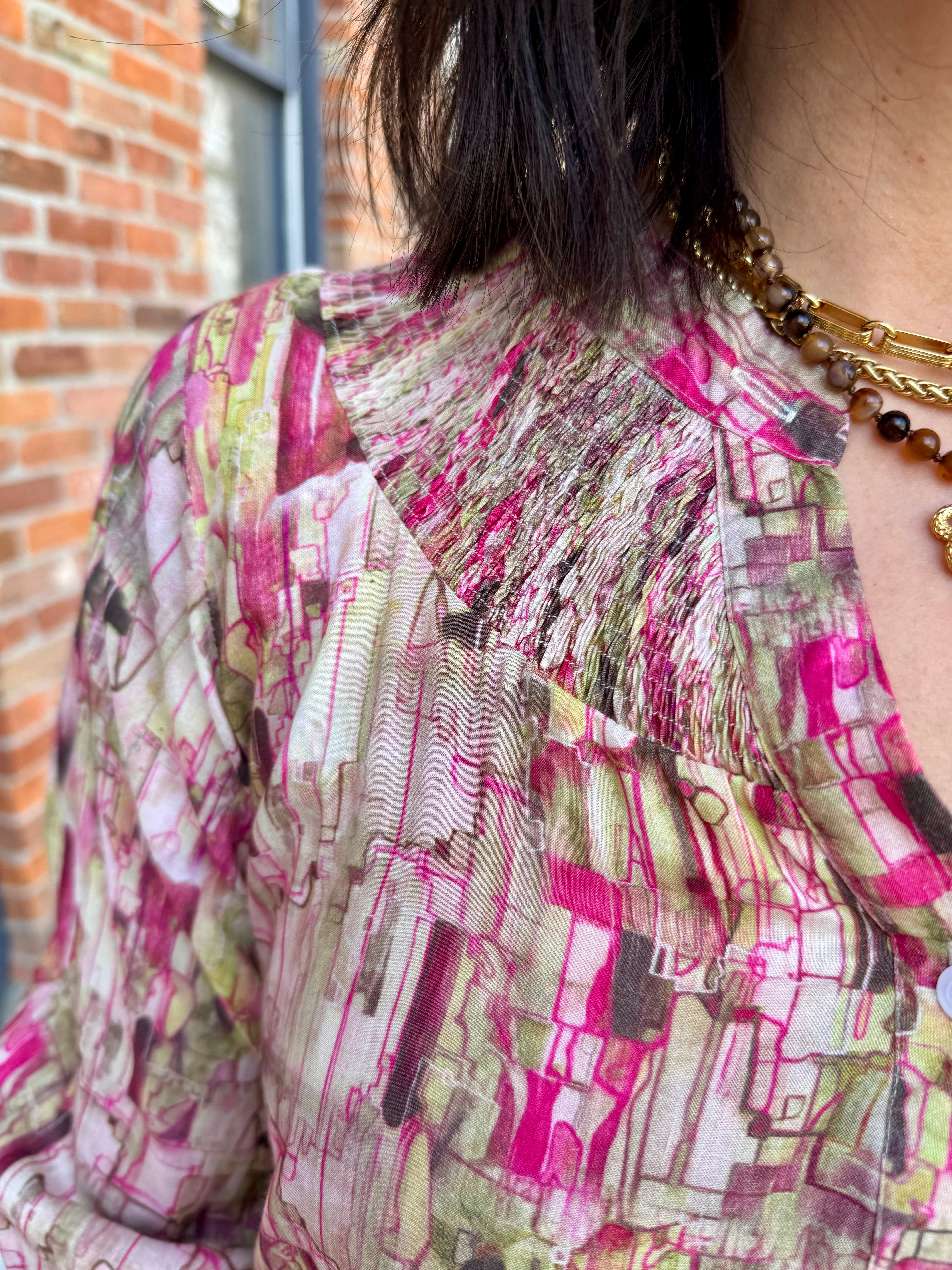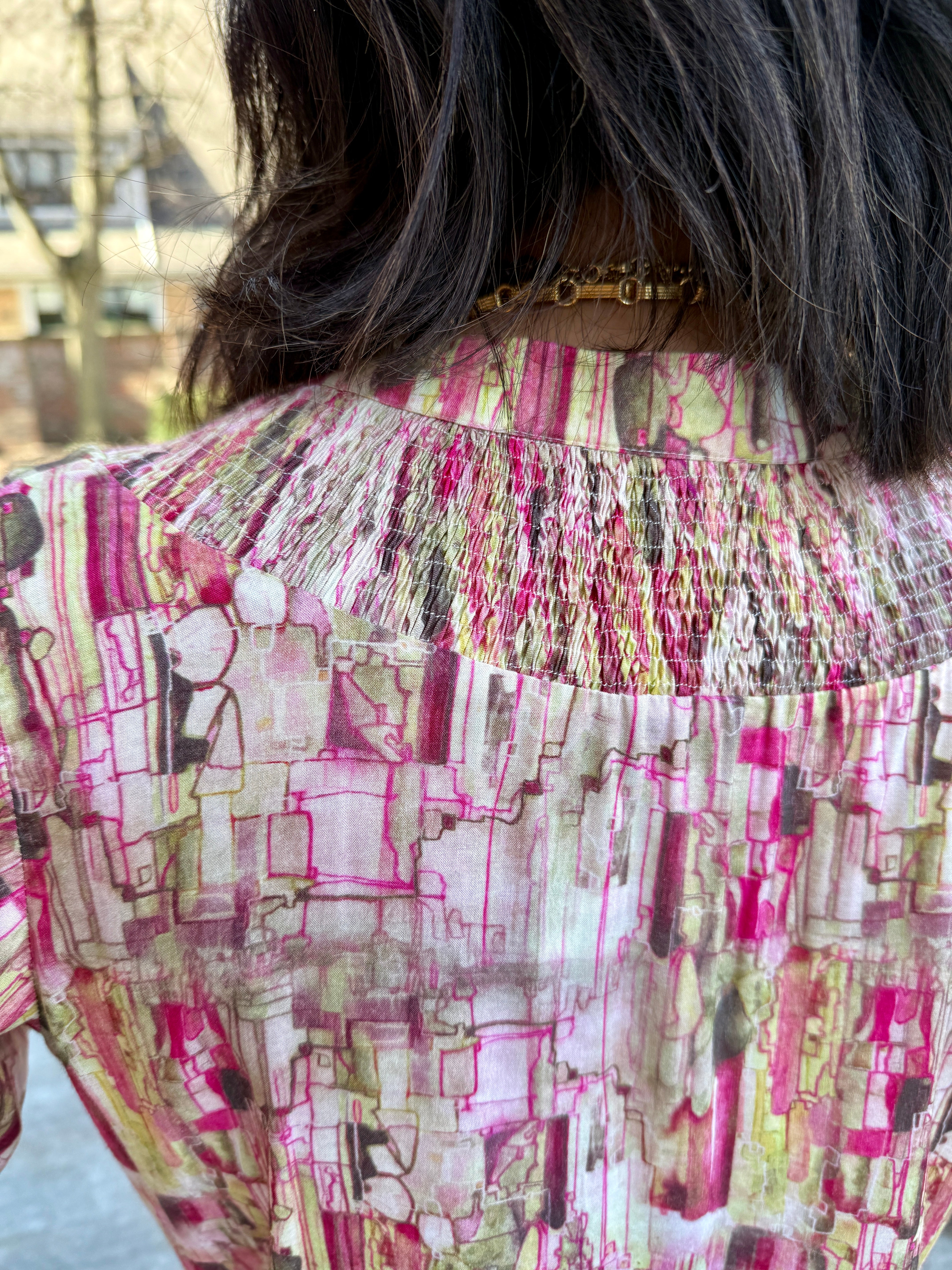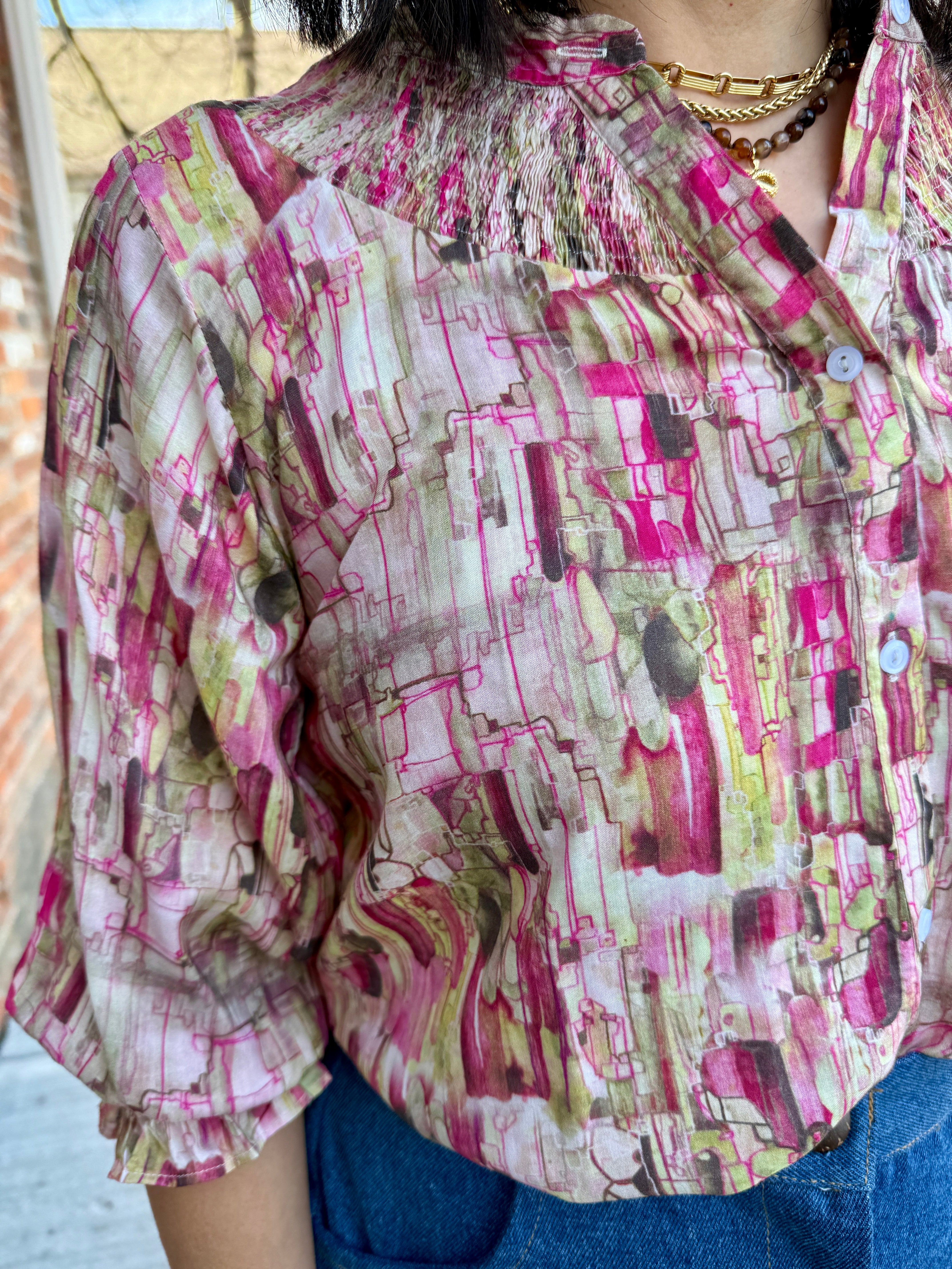 Elevate your wardrobe with the Lucy Blouse, a versatile button-up featuring elegant banded collar and smocked yoke details. This sustainable piece is crafted from surplus viscose fabric in limited-edition prints.