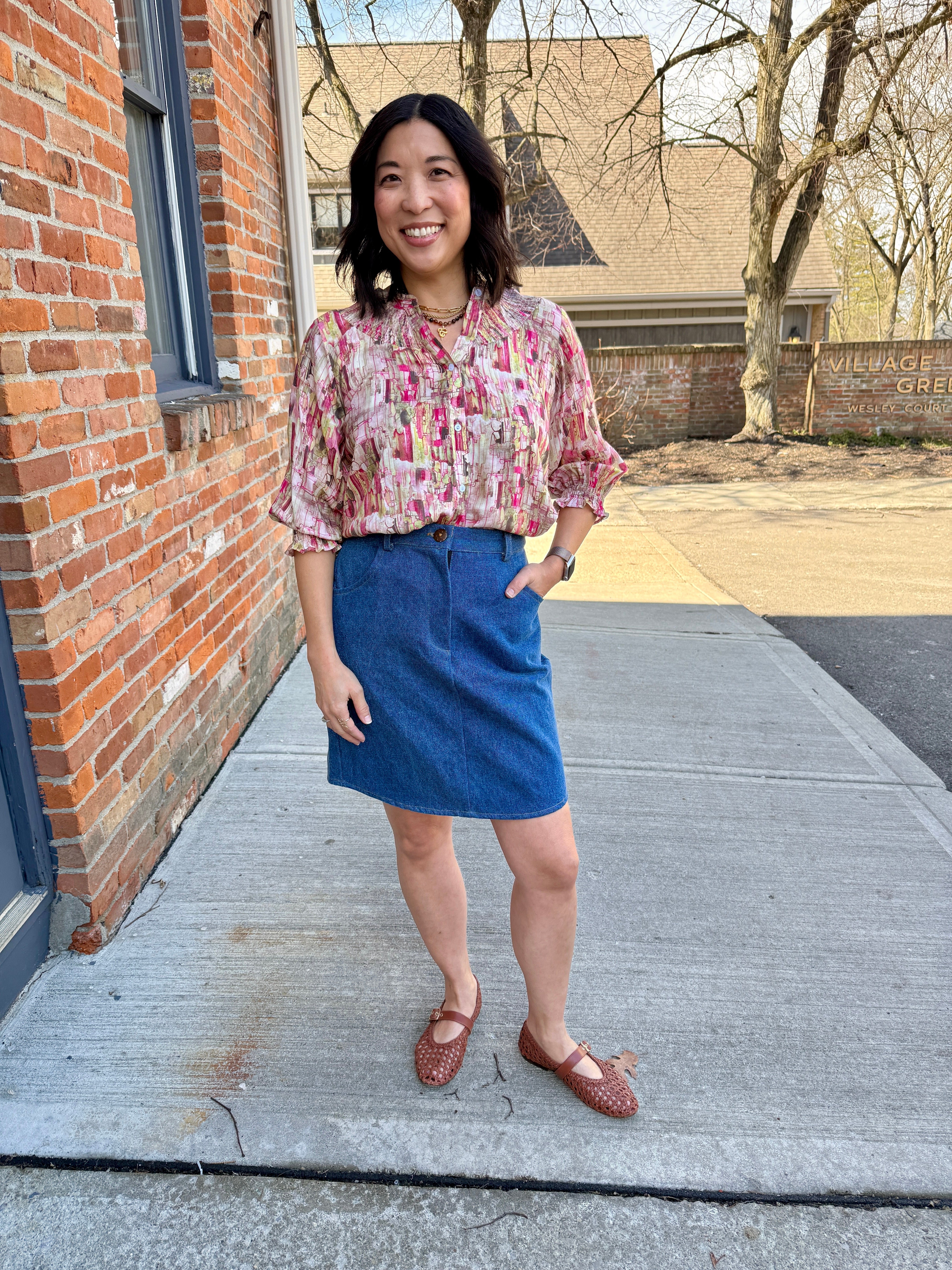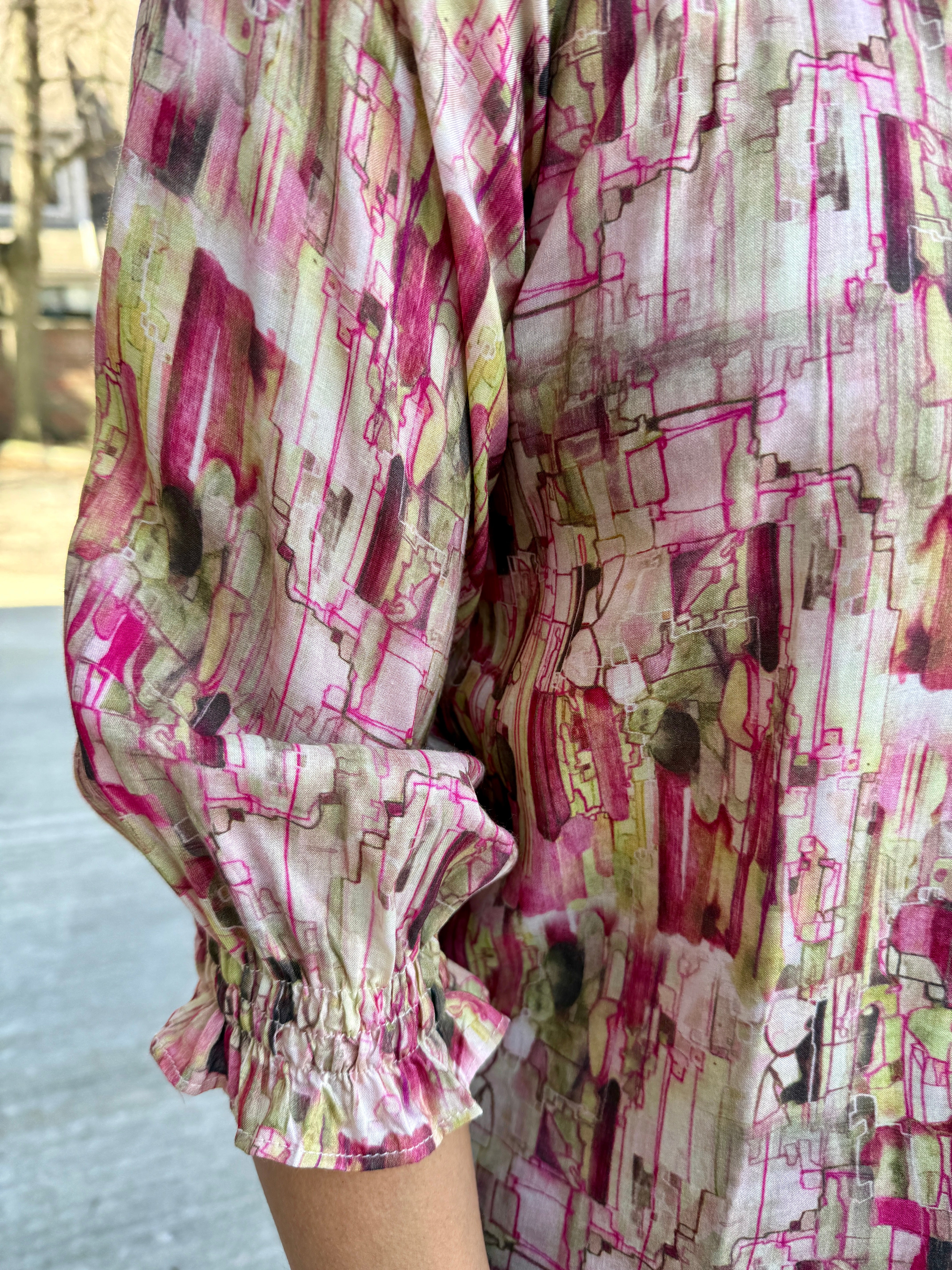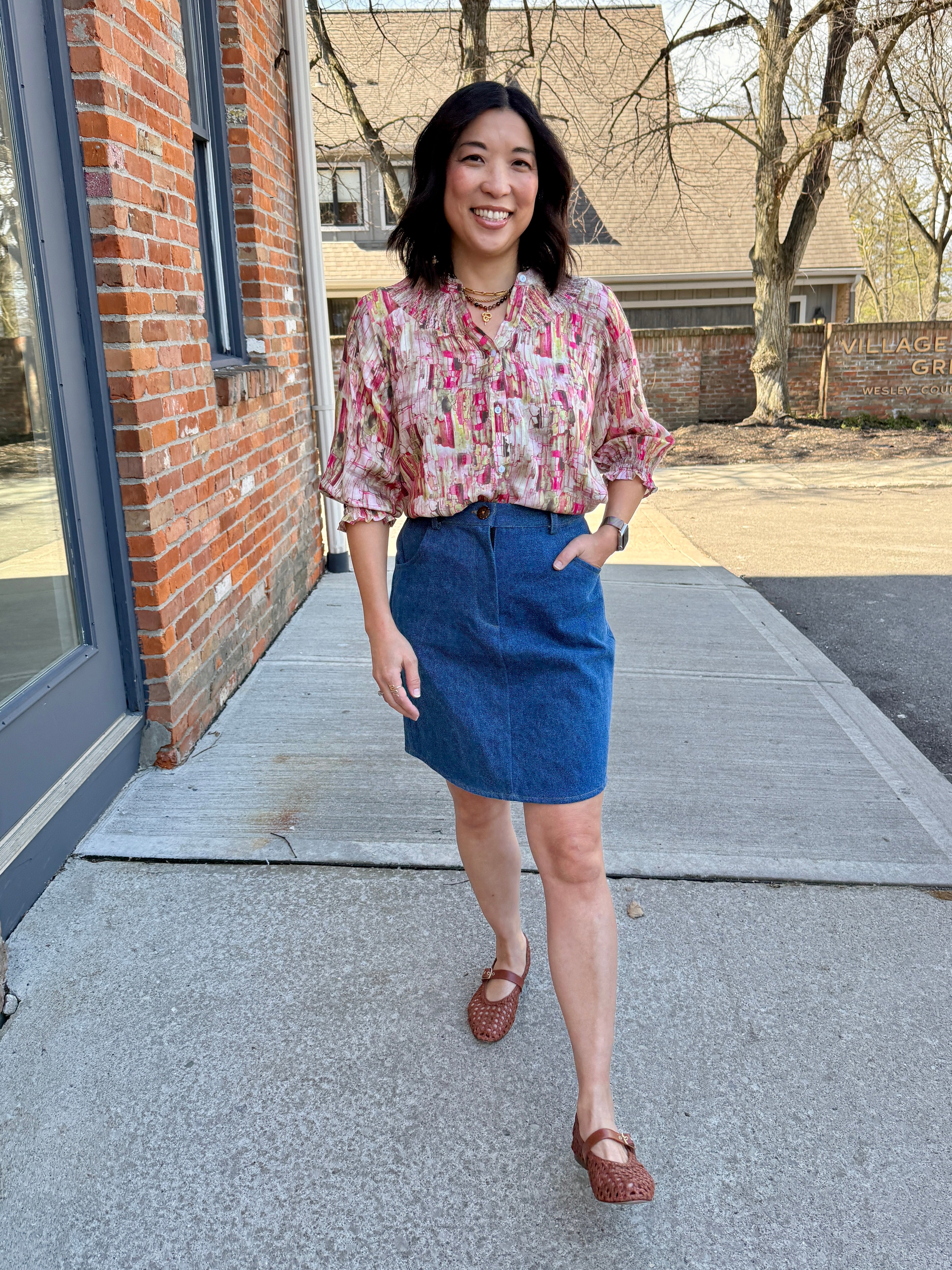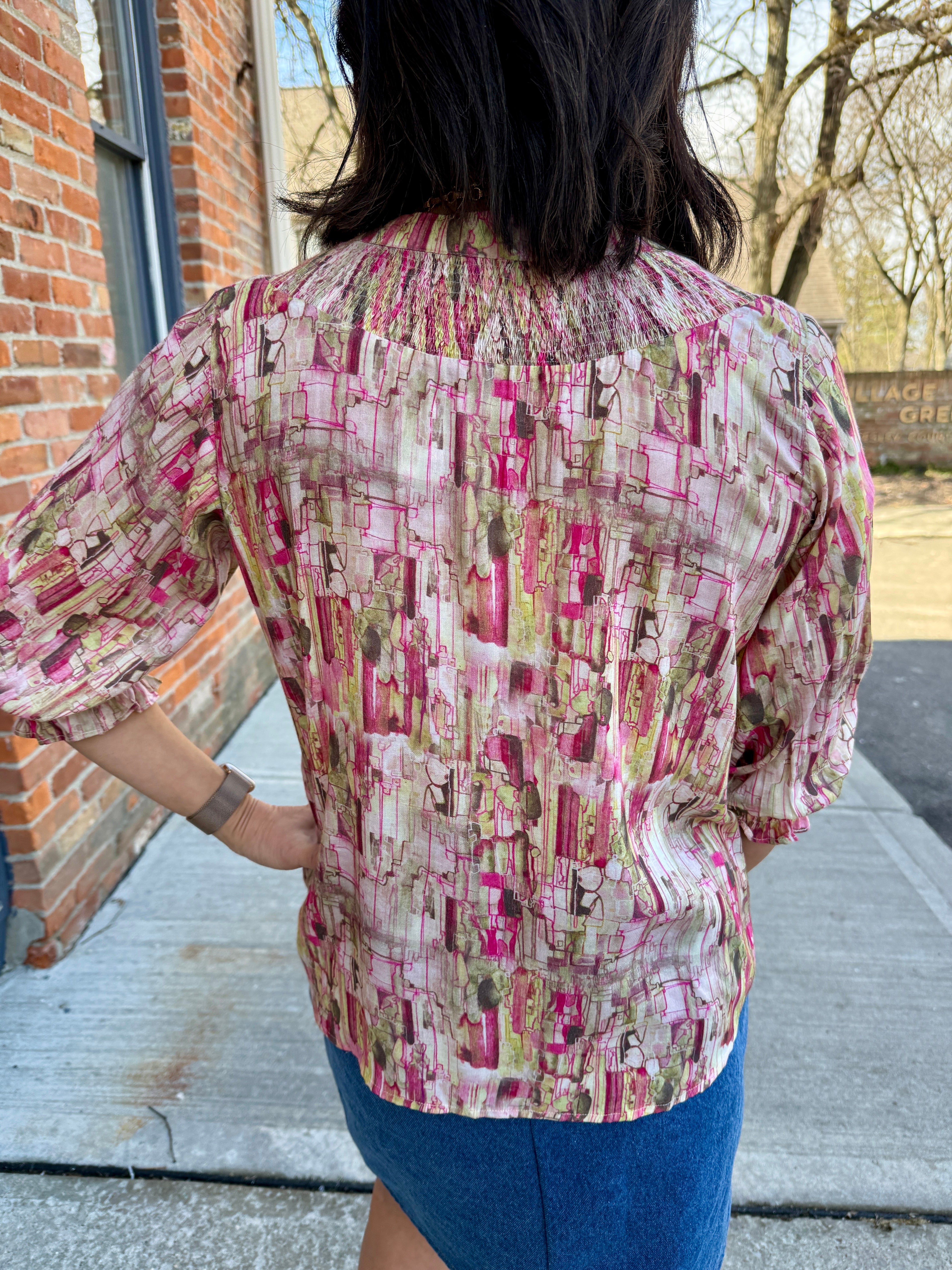 Elevate your wardrobe with the Lucy Blouse, a versatile button-up featuring elegant banded collar and smocked yoke details. This sustainable piece is crafted from surplus viscose fabric in limited-edition prints.