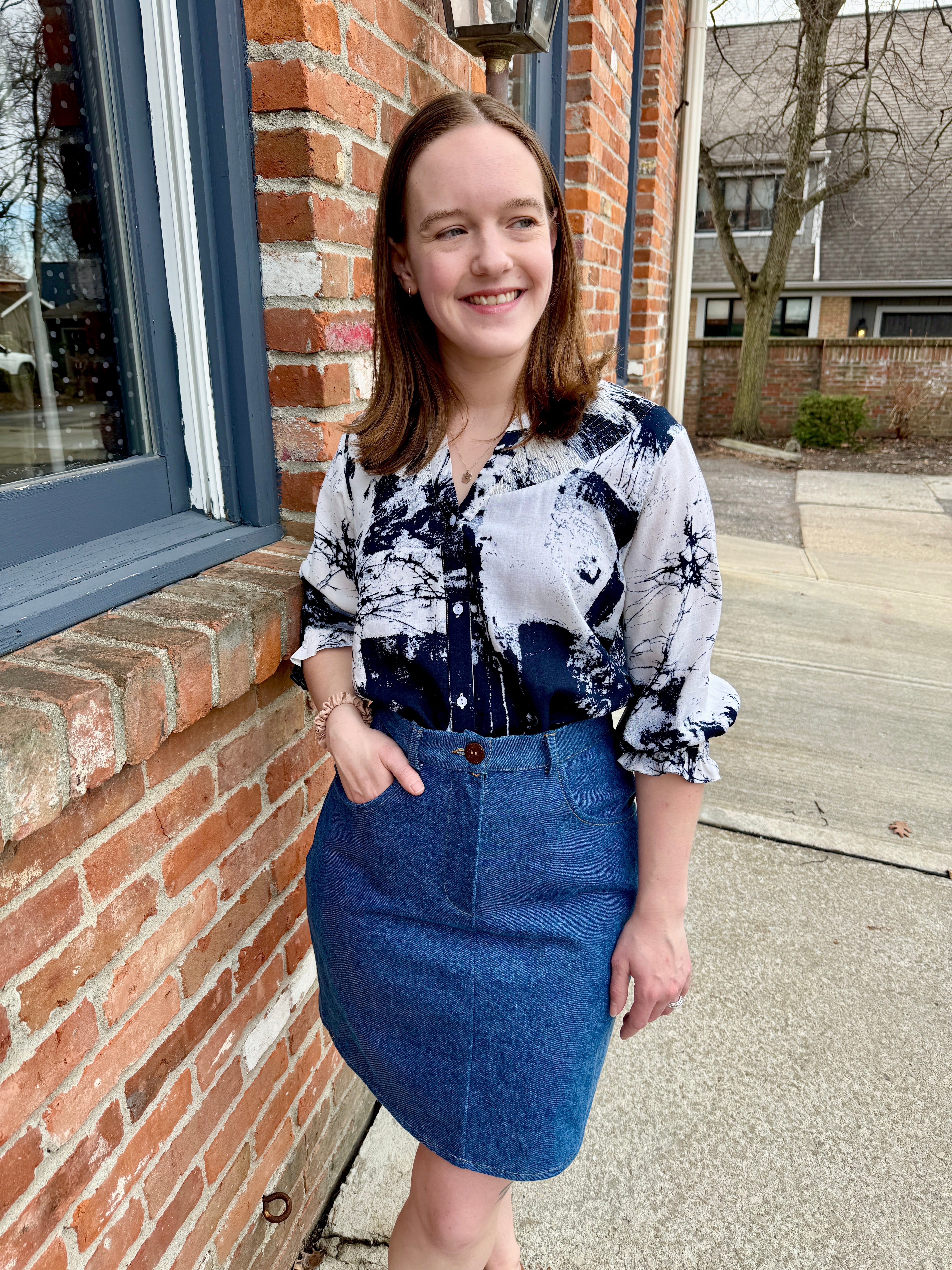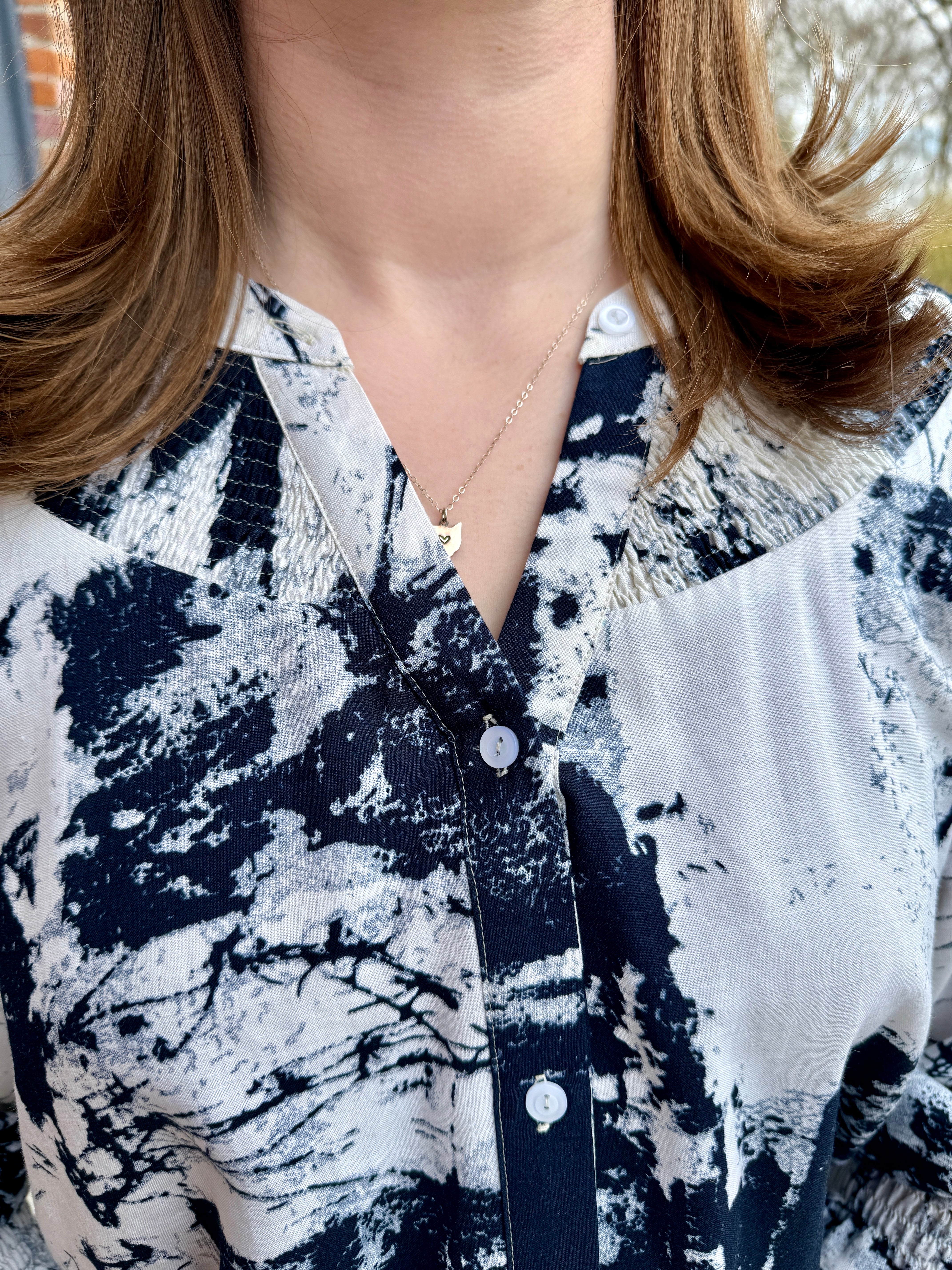 Elevate your wardrobe with the Lucy Blouse, a versatile button-up featuring elegant banded collar and smocked yoke details. This sustainable piece is crafted from surplus viscose fabric in limited-edition prints.