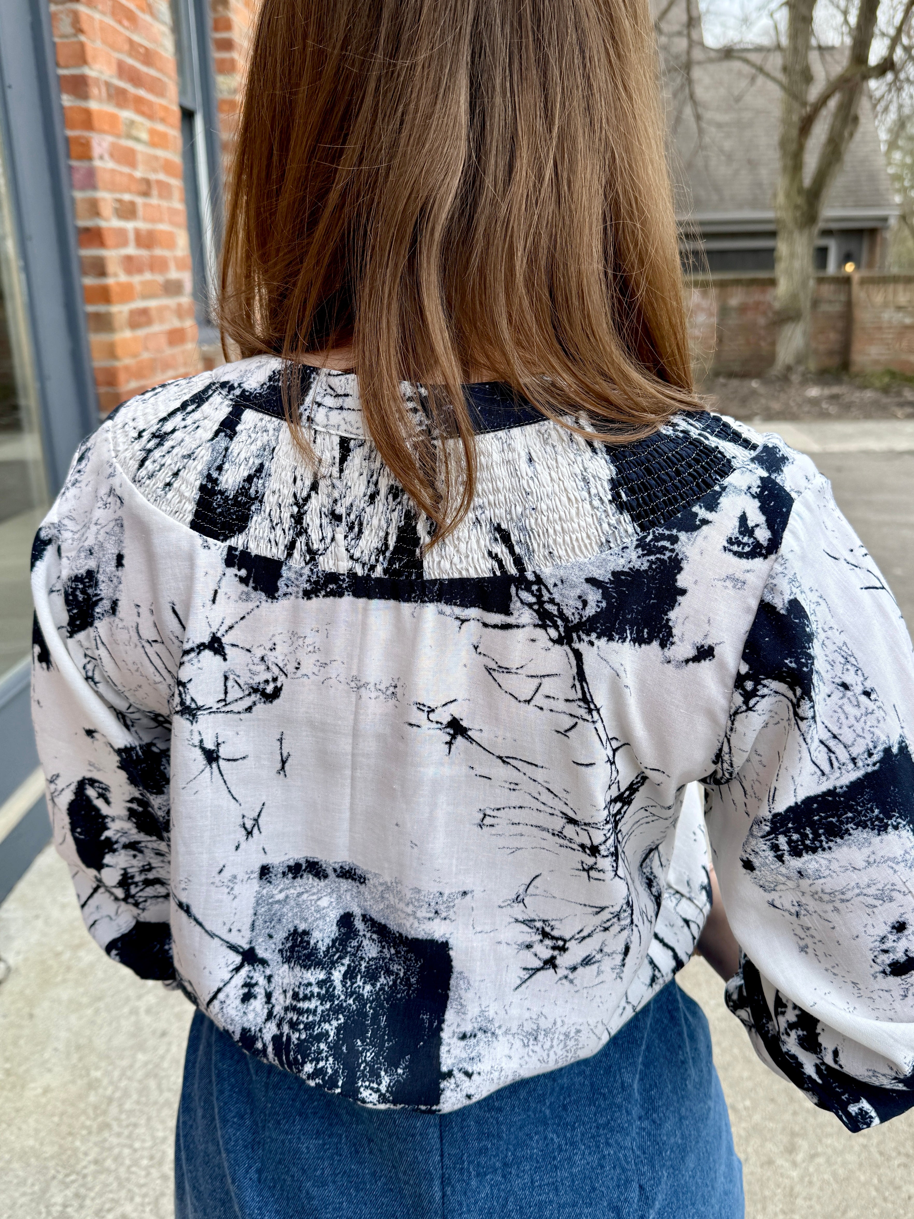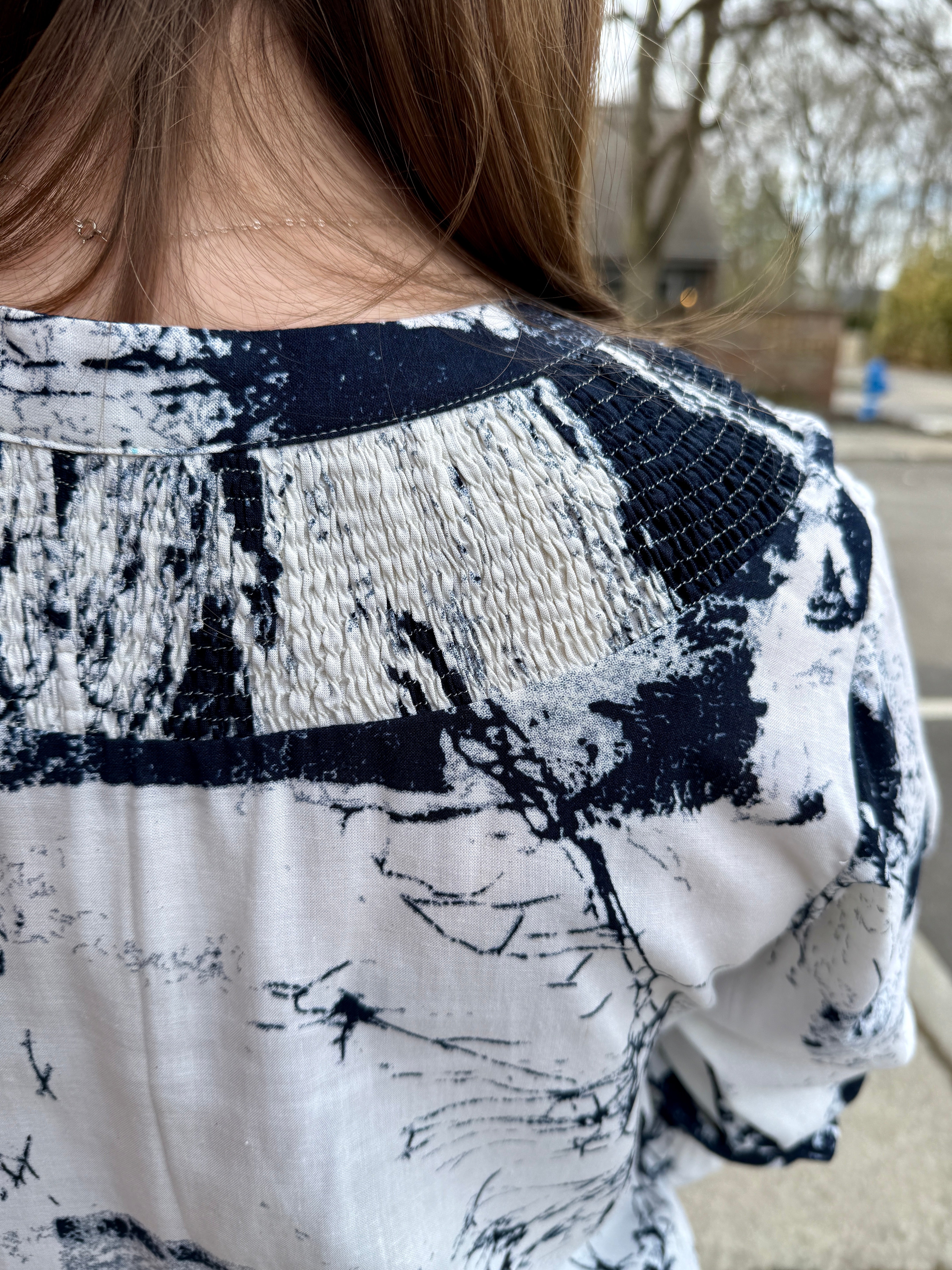 - Banded collar with smocking detail front and back