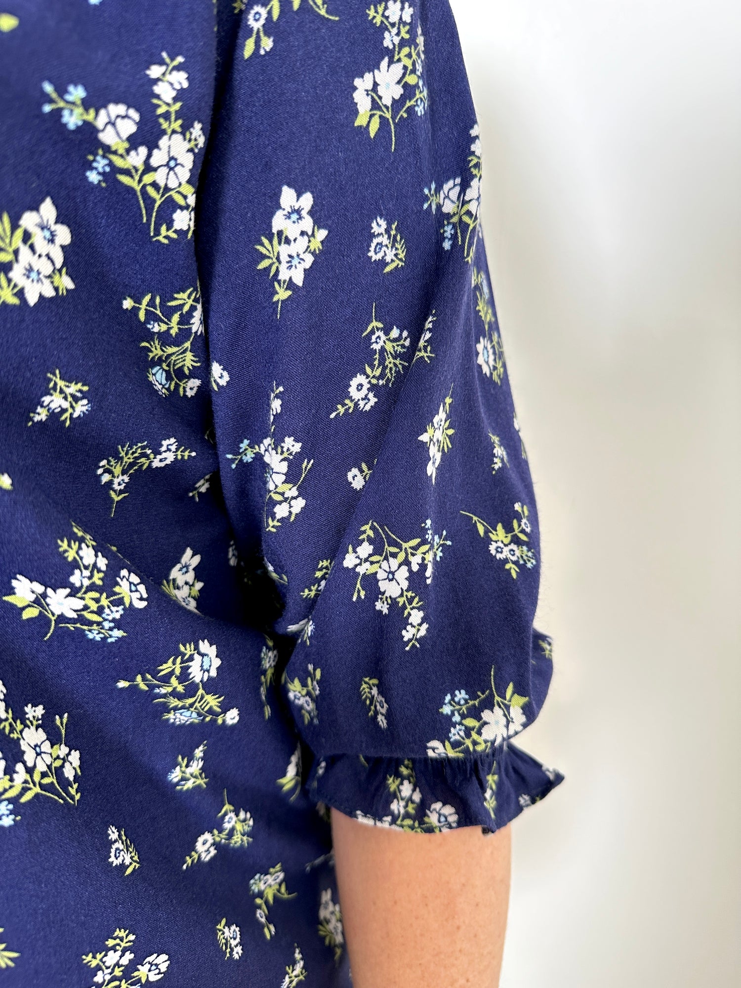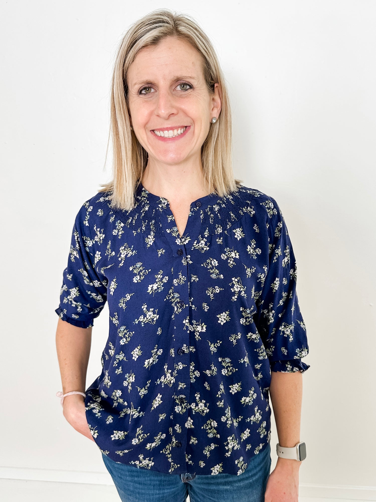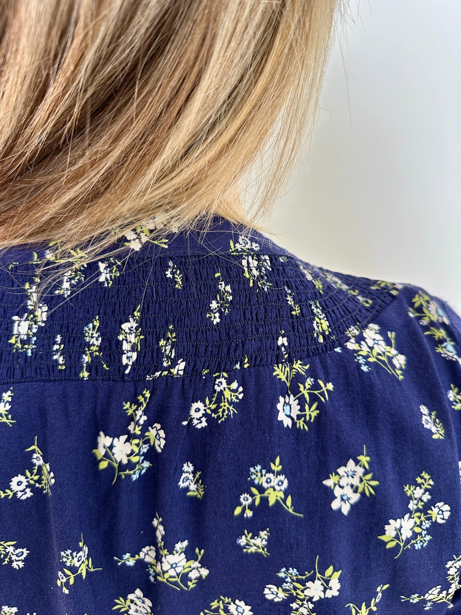 - Model wearing typical size in a top. Elisabeth wearing Blue/White Floral size S, Kelly navy floral wearing size M