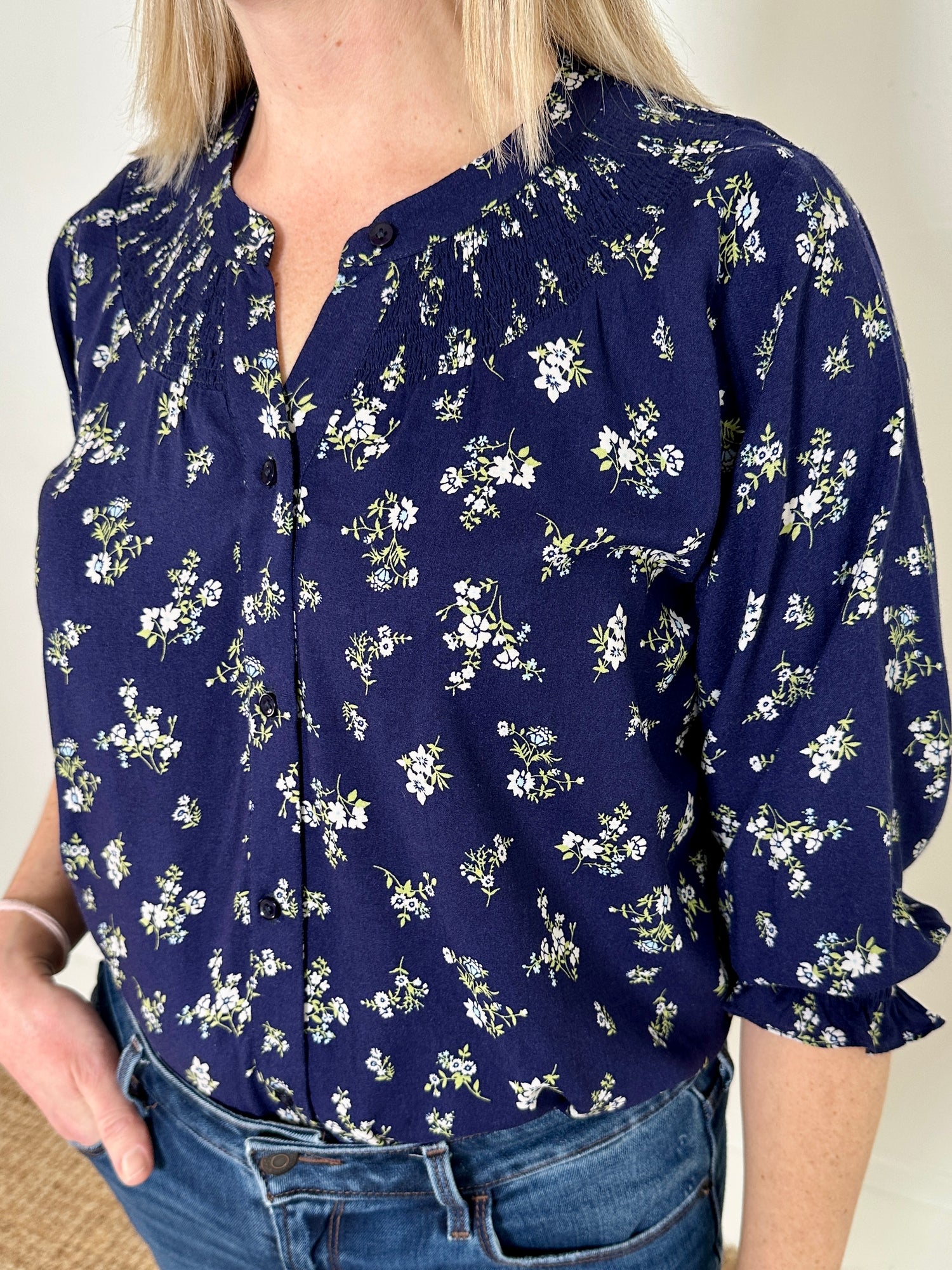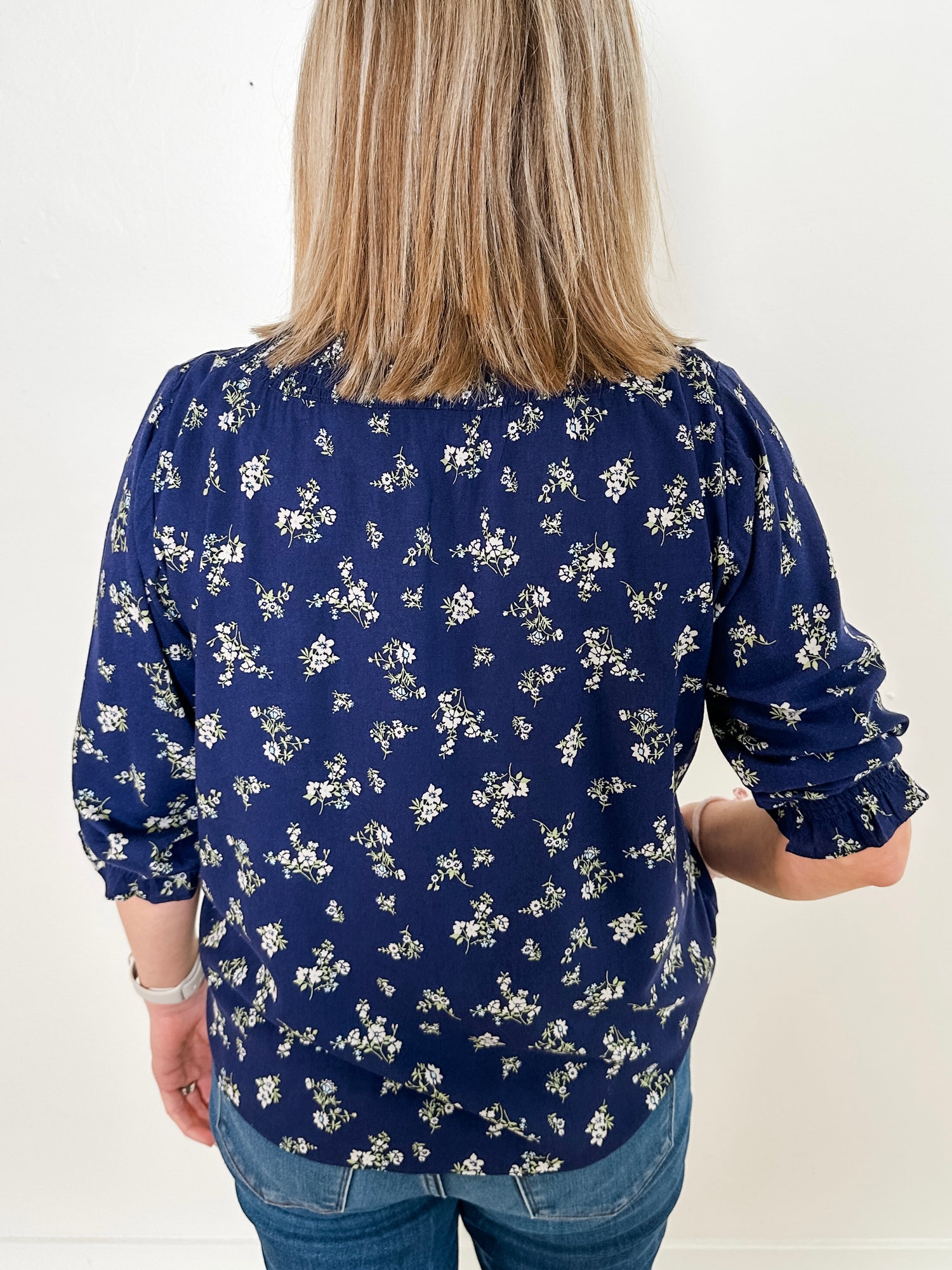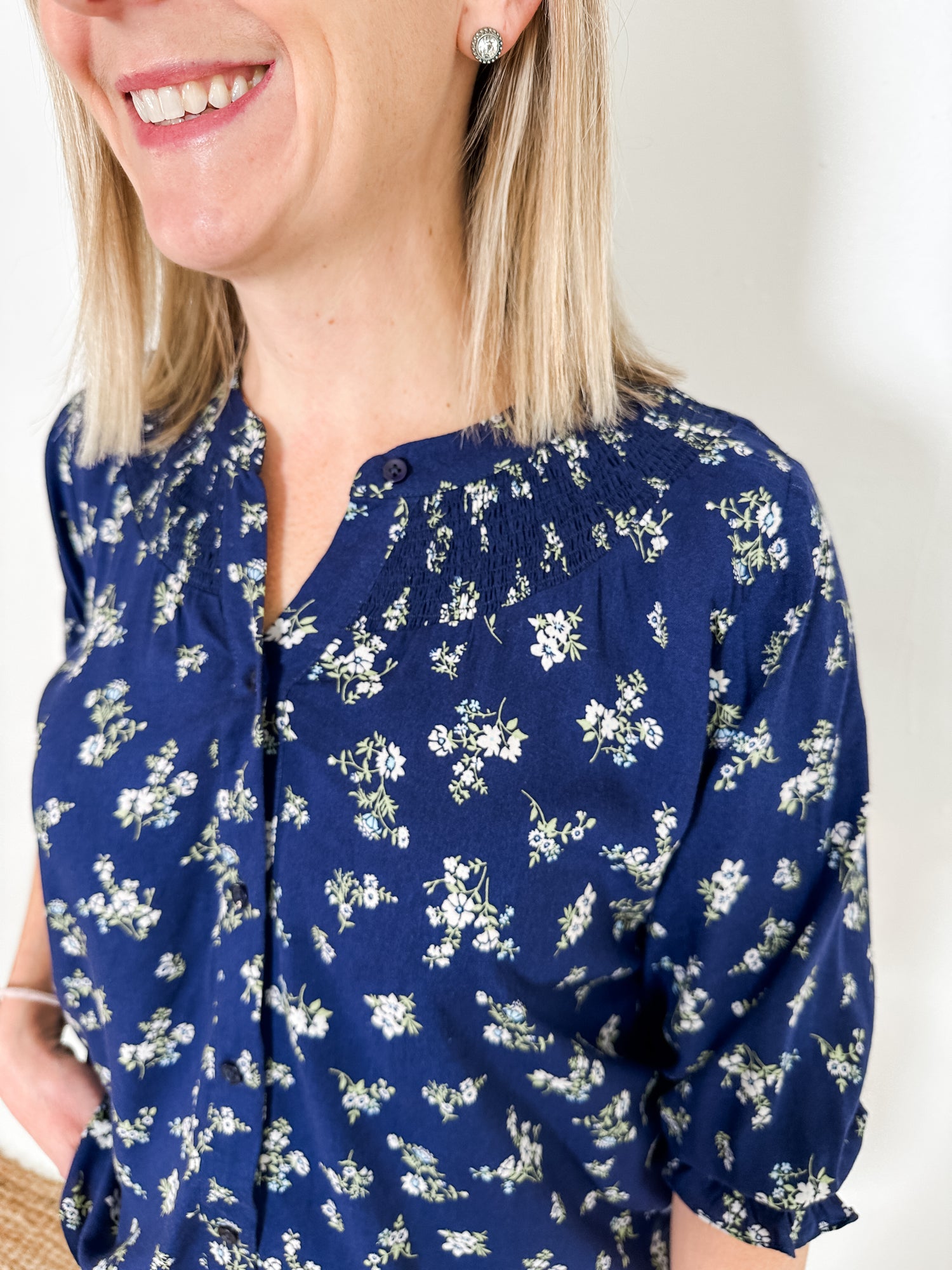 - Model wearing typical size in a top. Elisabeth wearing Blue/White Floral size S, Kelly navy floral wearing size M