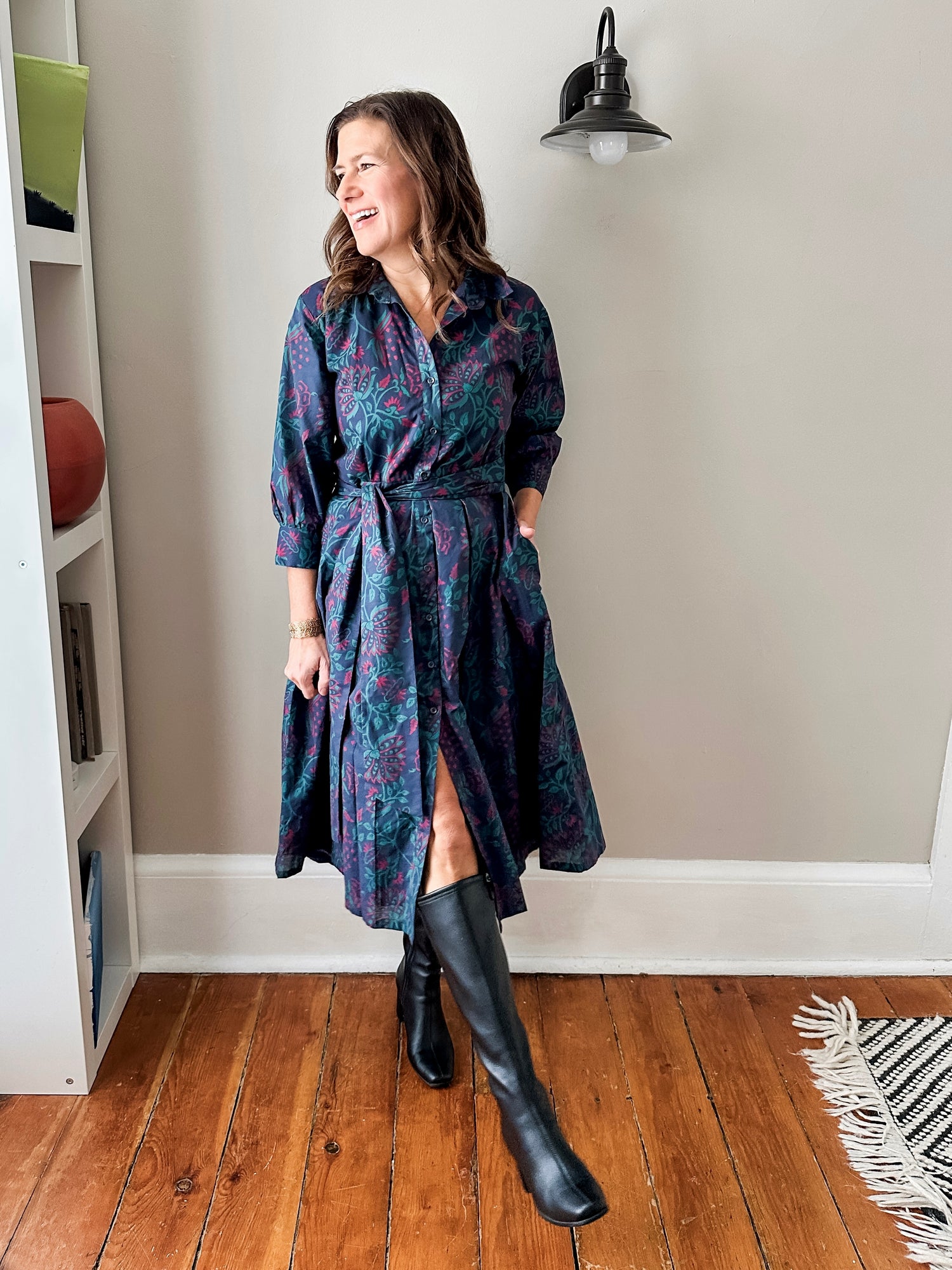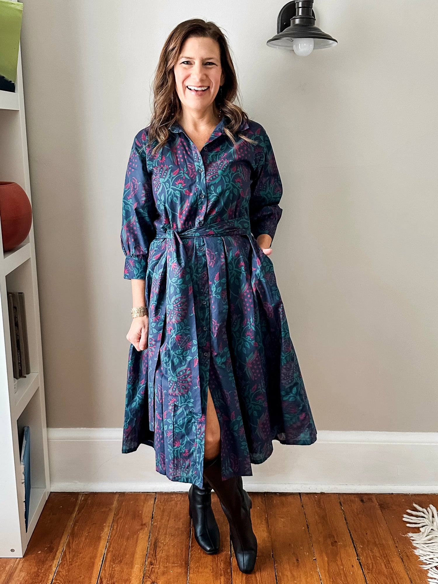 Fabric has zero stretch. We recommend choosing your typical button-up shirt size. Give yourself an additional 1/2-1 inch on each side for comfort and to avoid button gapping. Shirt style is a relaxed but not oversized fit.