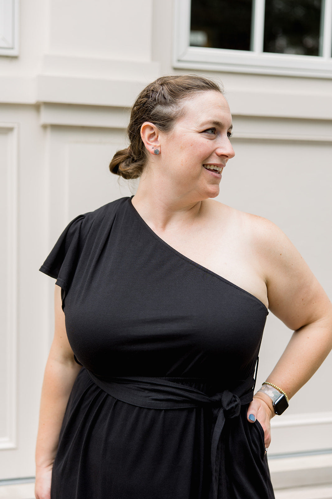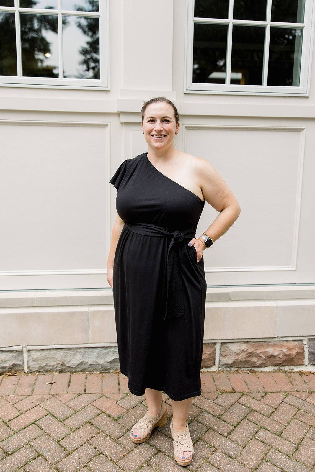 Dressy and dramatic, this one-shoulder dress has a flowy flutter sleeve and matching belt to cinch you in at the waist. This pretty midi is perfect paired with heels, flats, even sneakers!
