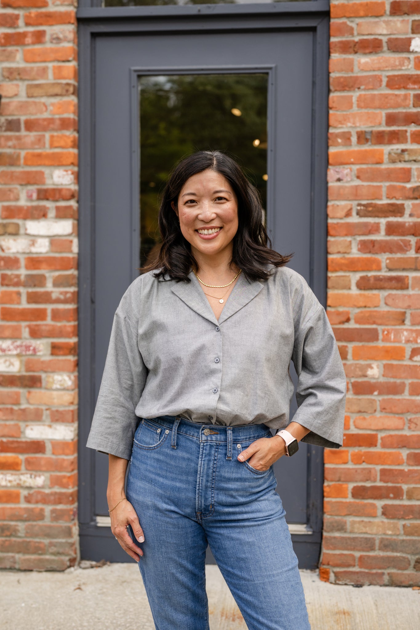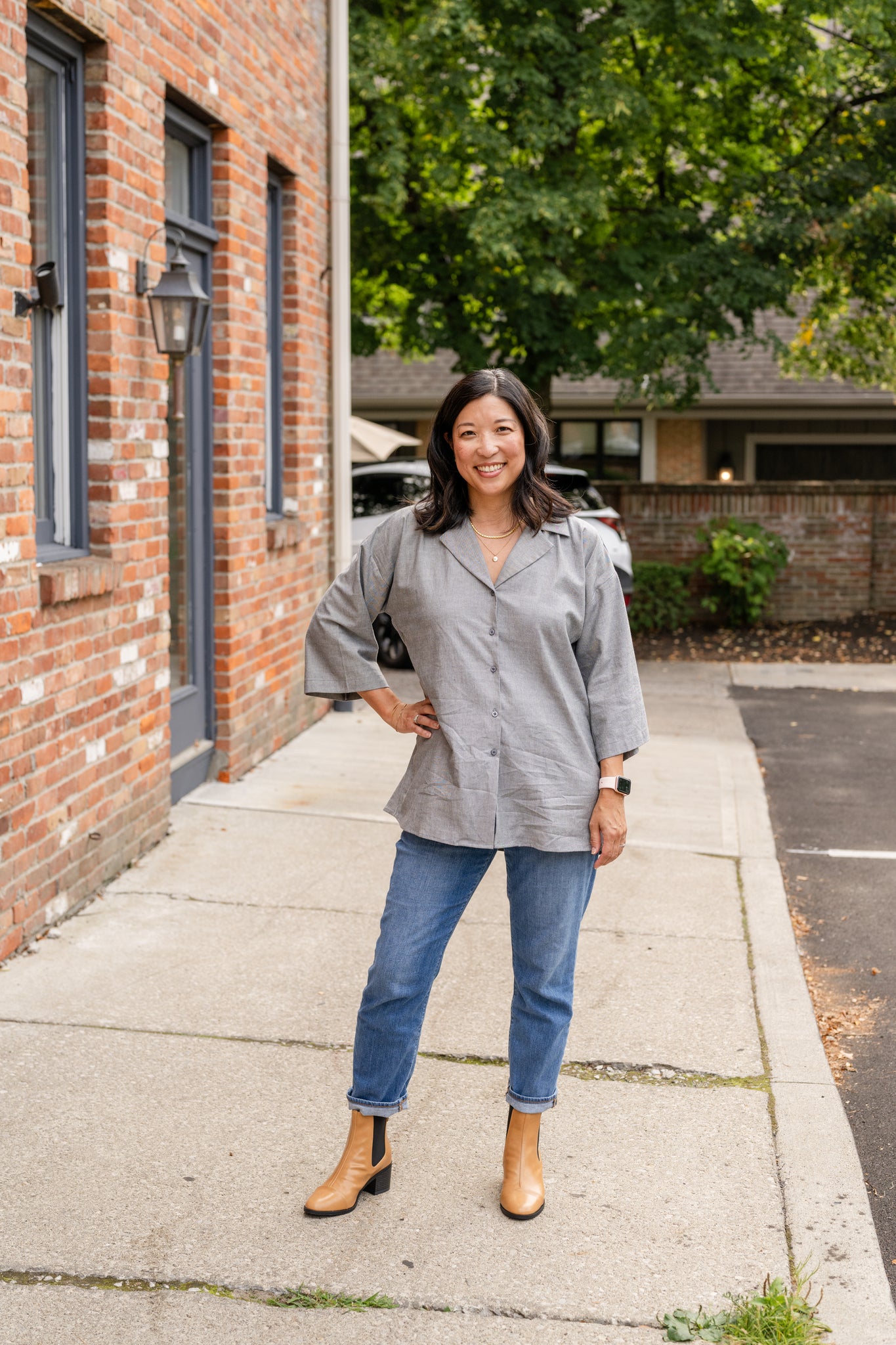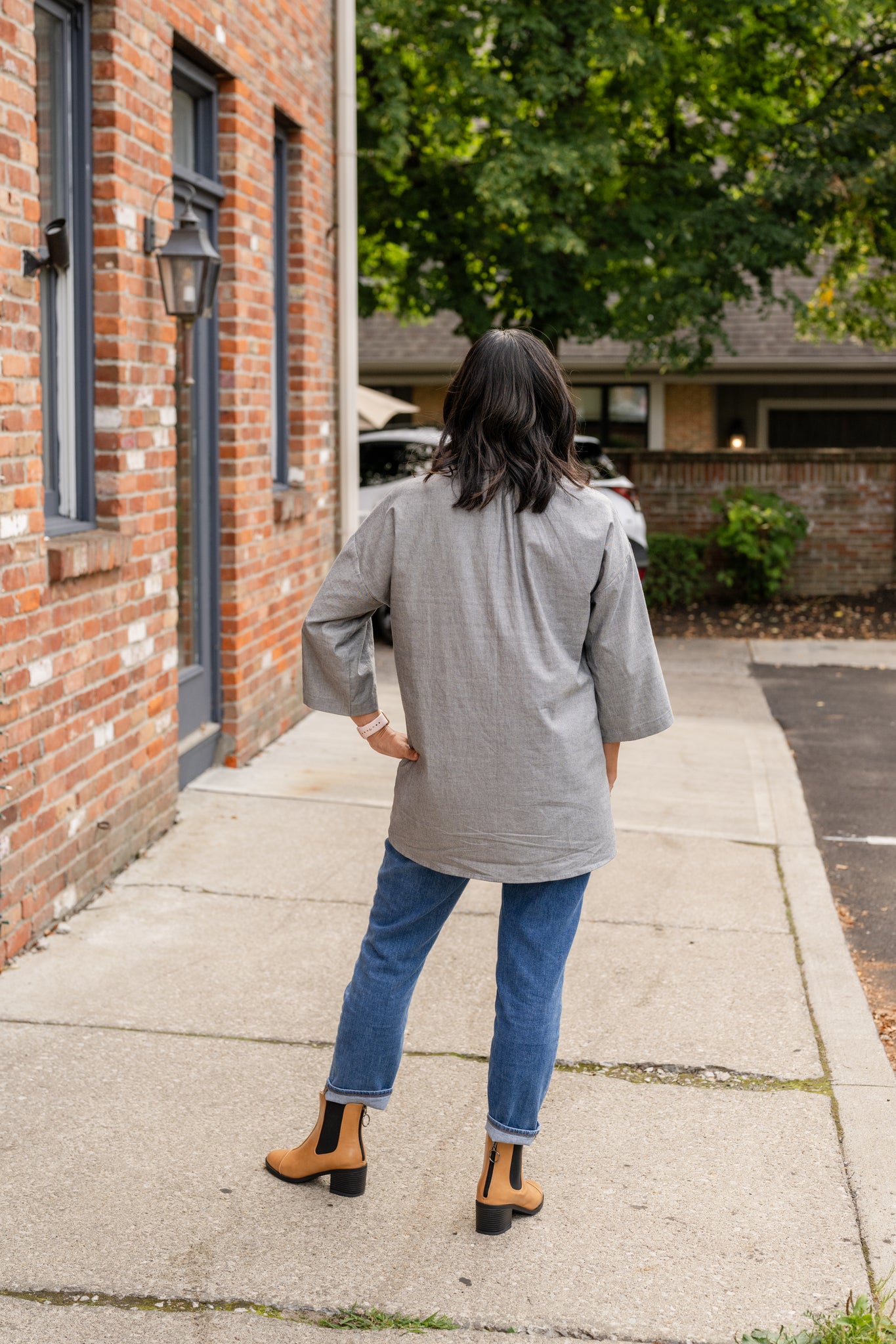 Our Mini-Mini version of a shirt dress in this new relaxed boxy silhouette button-up shirt. Easy-Open Collar with buttons and a Deeper V-neckline.