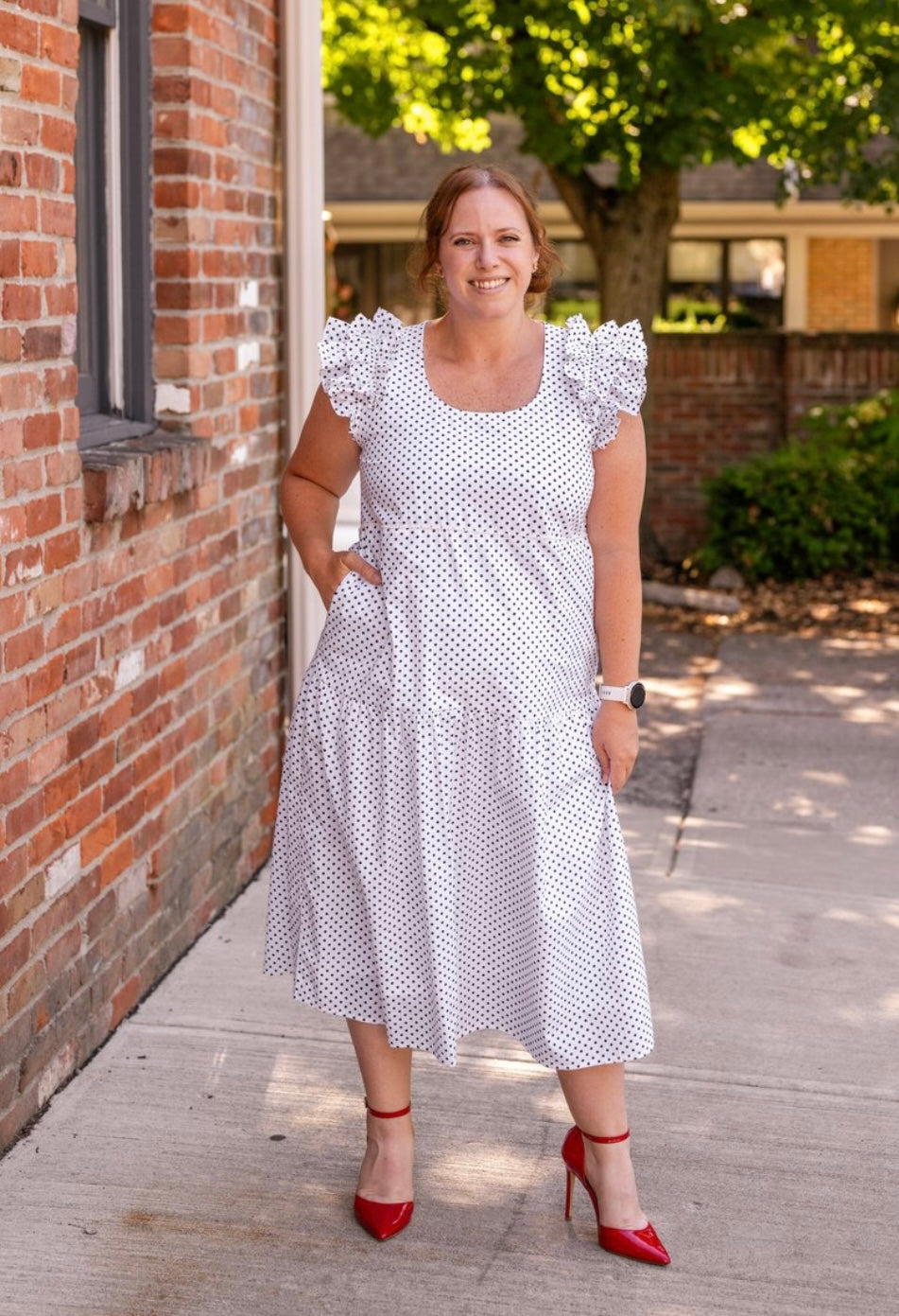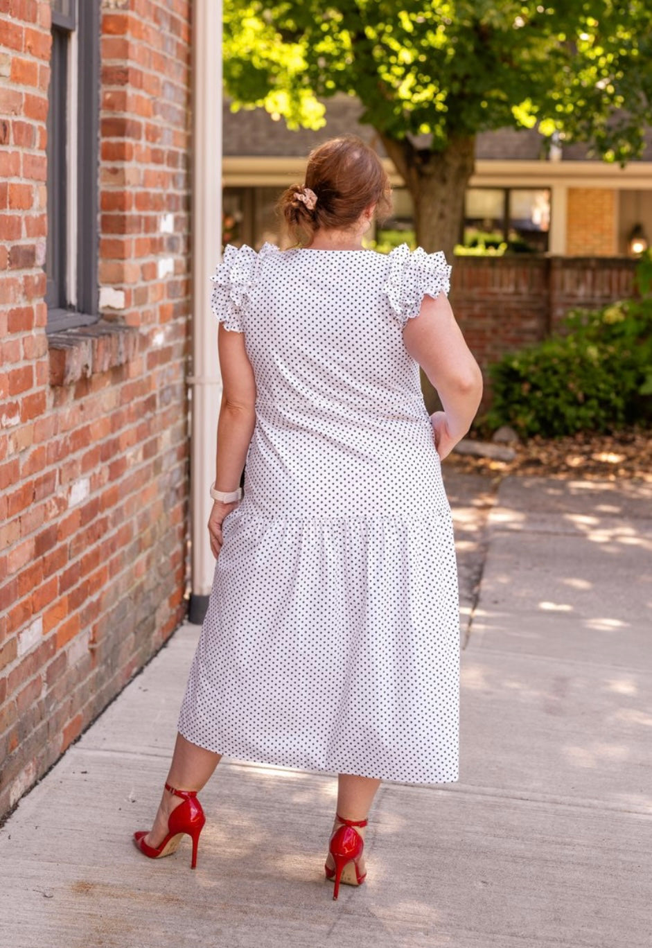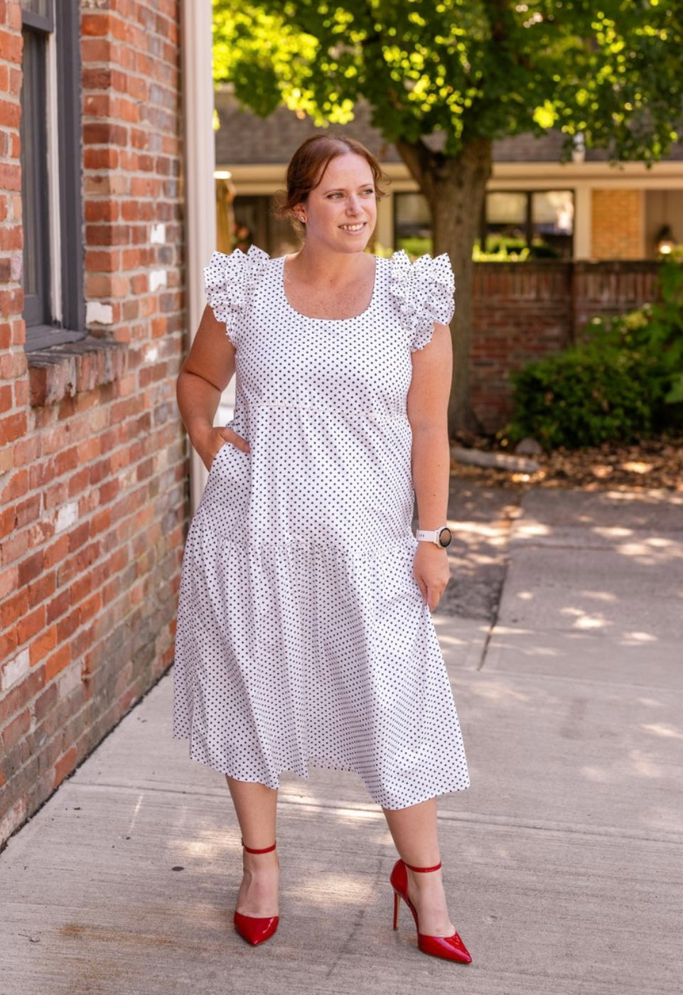 A charming tiered dress featuring cascading ruffle shoulders and a flattering A-line, drop waist silhouette.