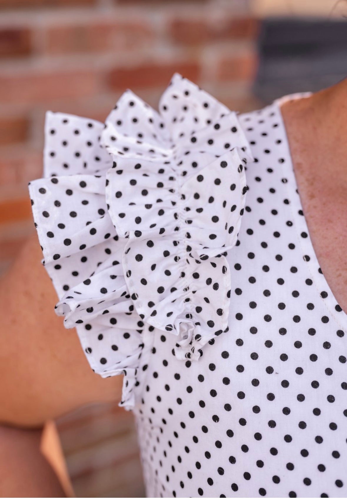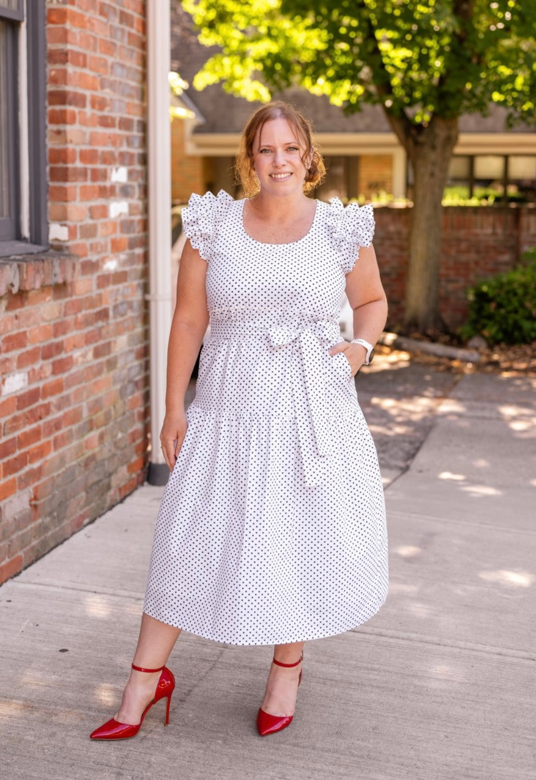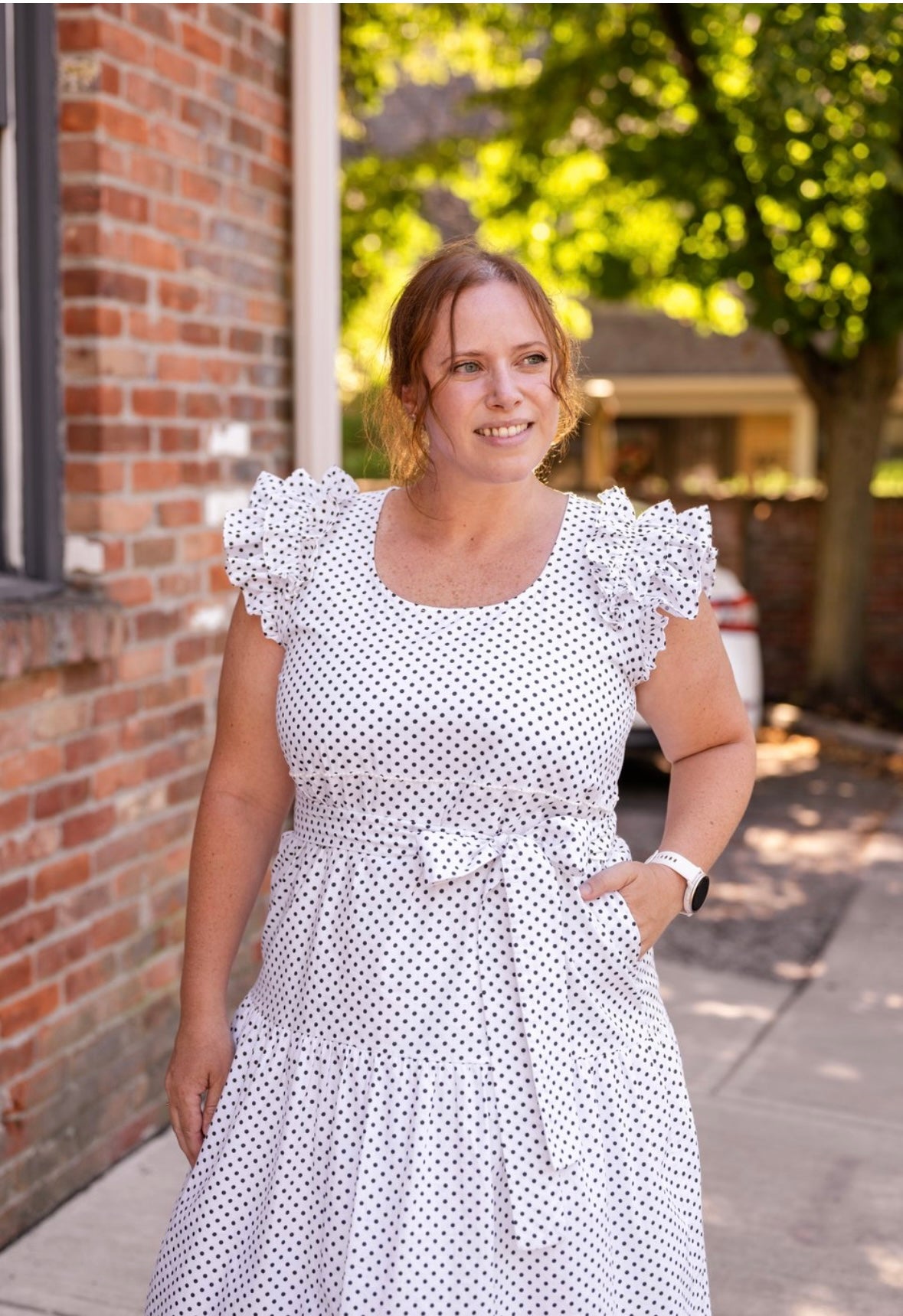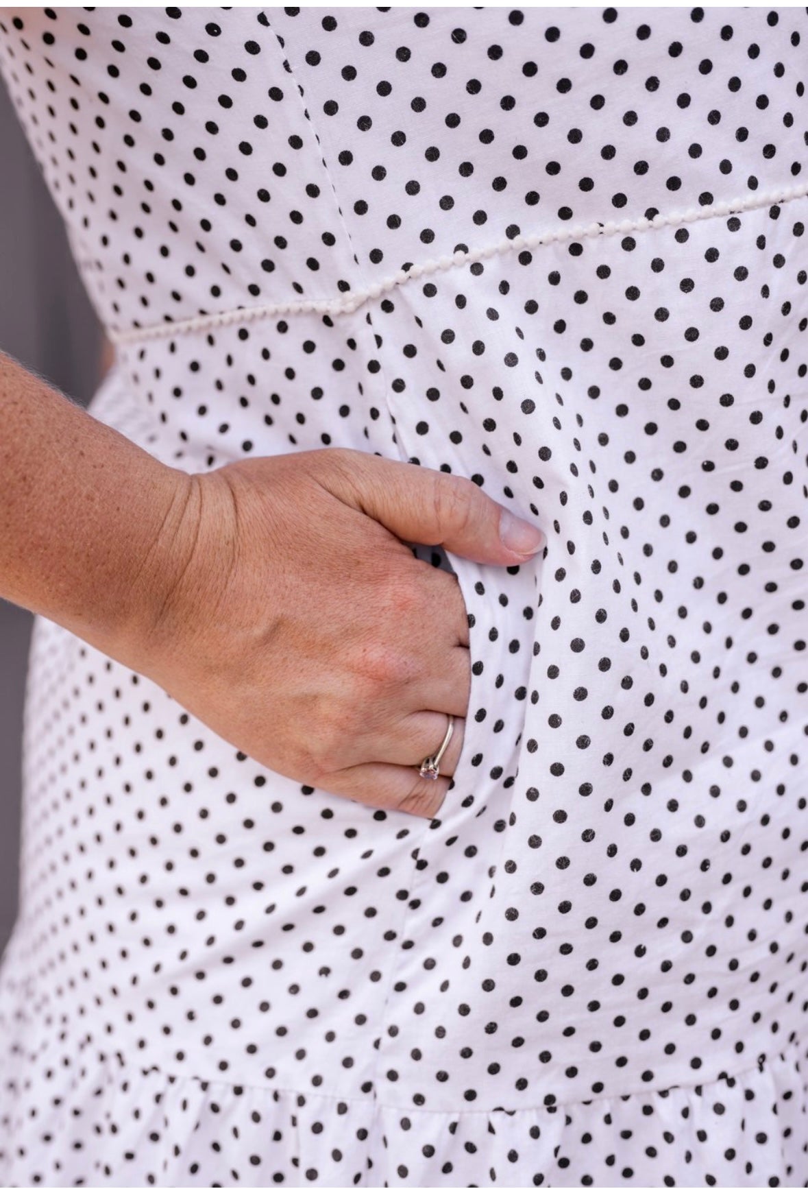 A charming tiered dress featuring cascading ruffle shoulders and a flattering A-line, drop waist silhouette.