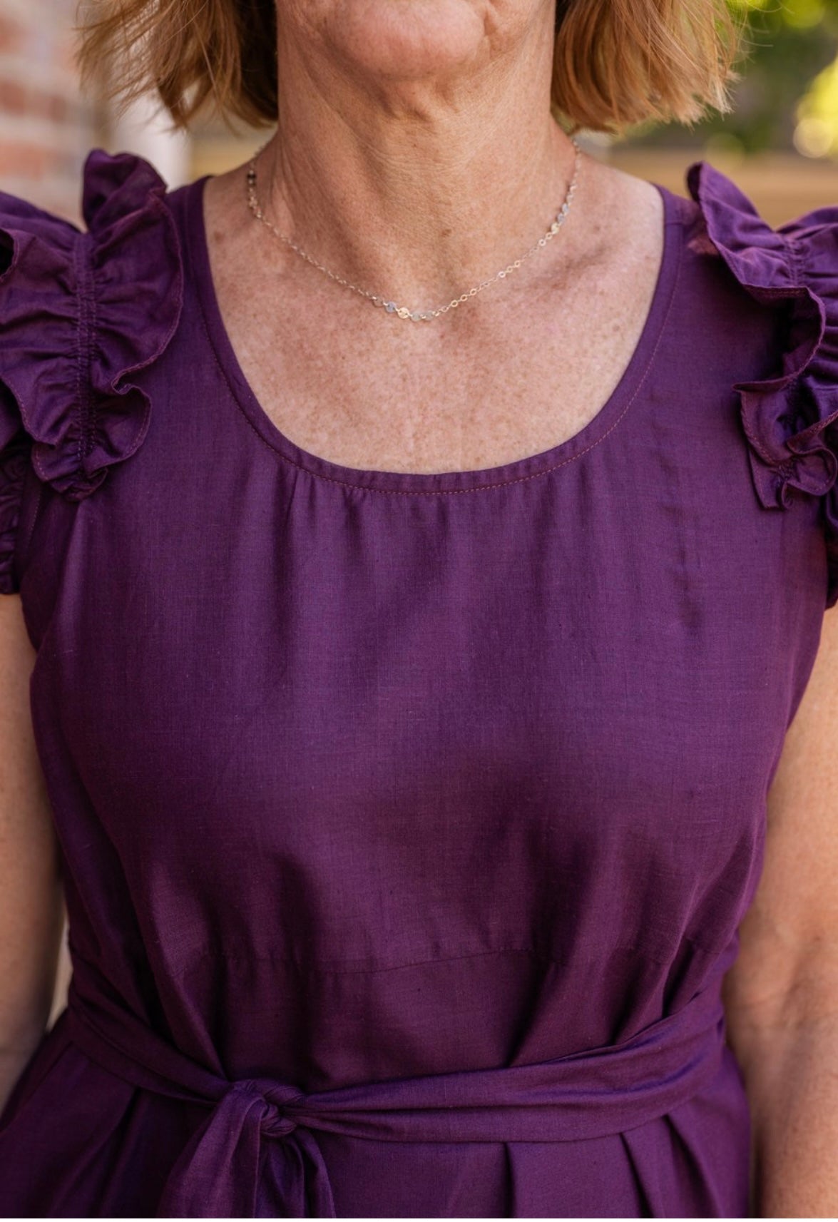 - Curved scoop neckline with ruffle cap sleeves