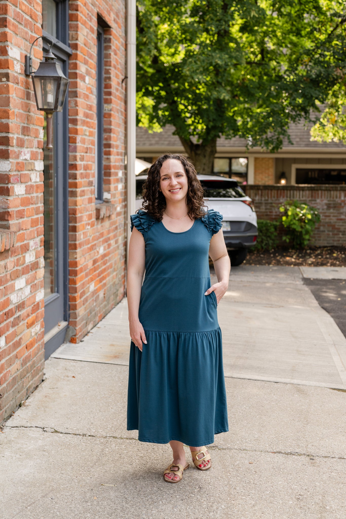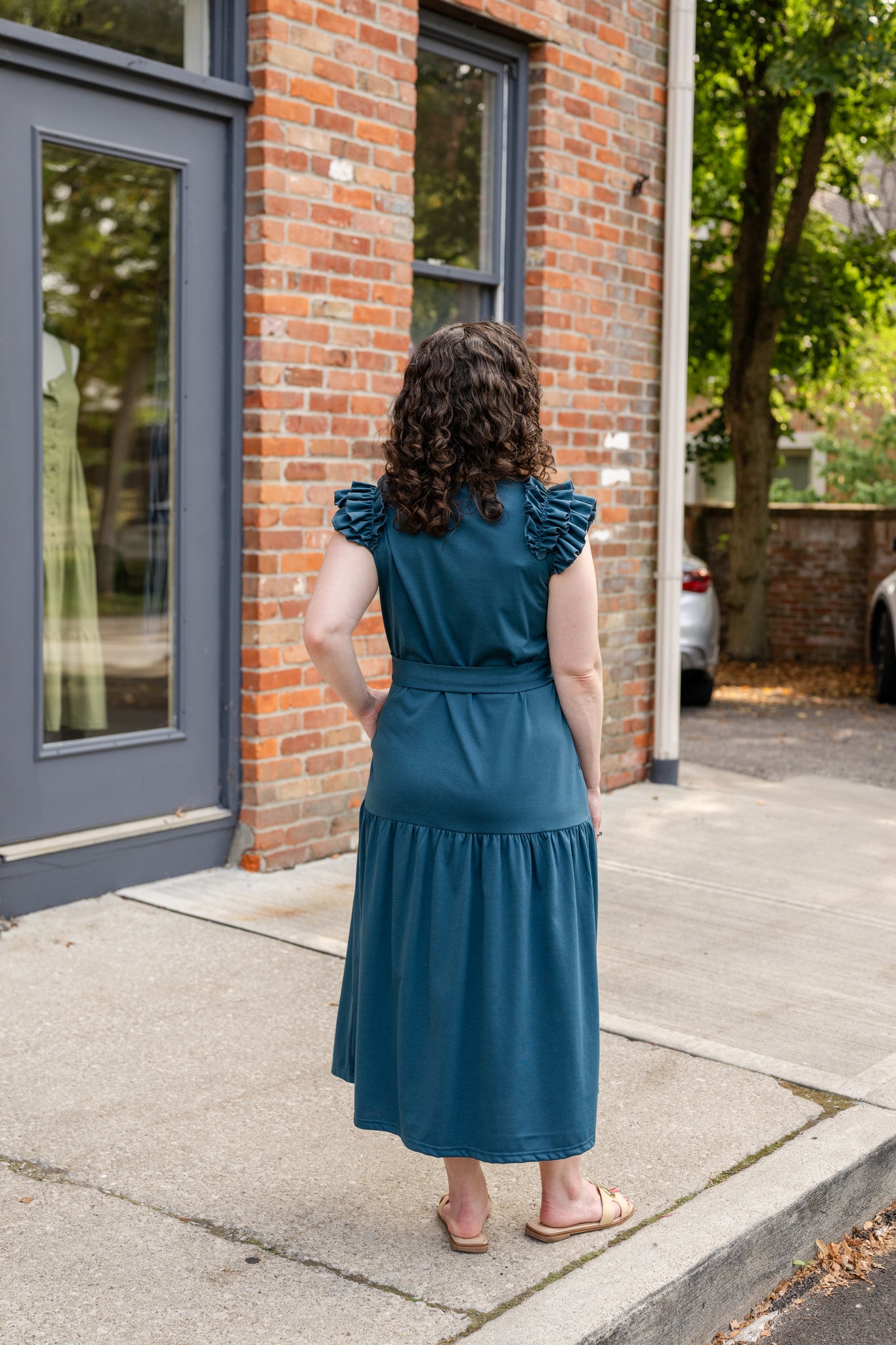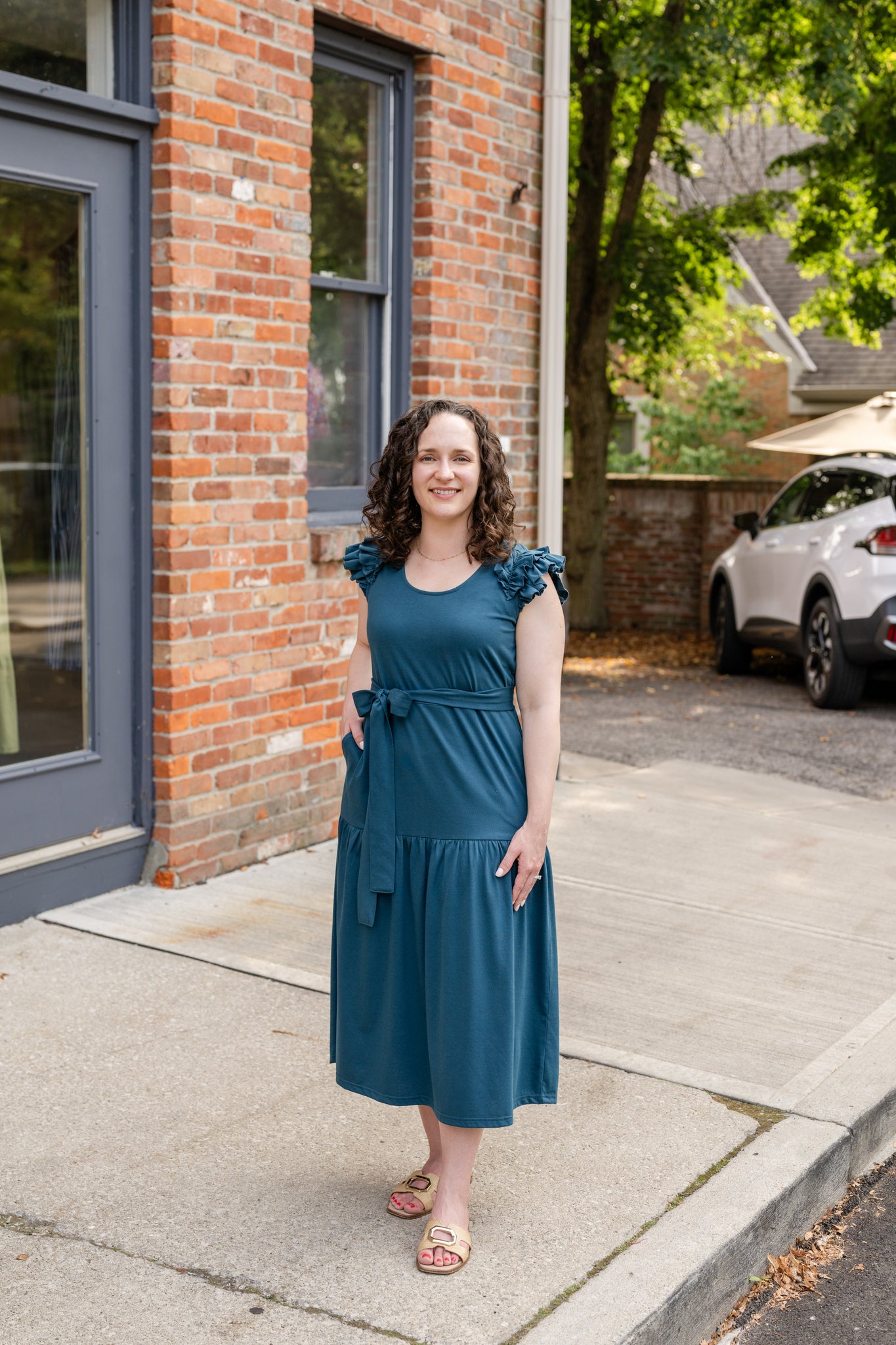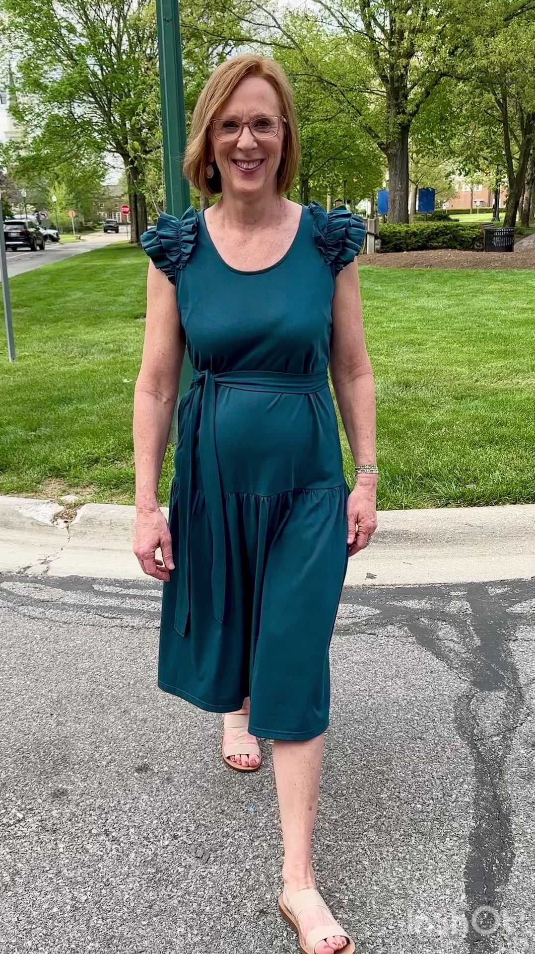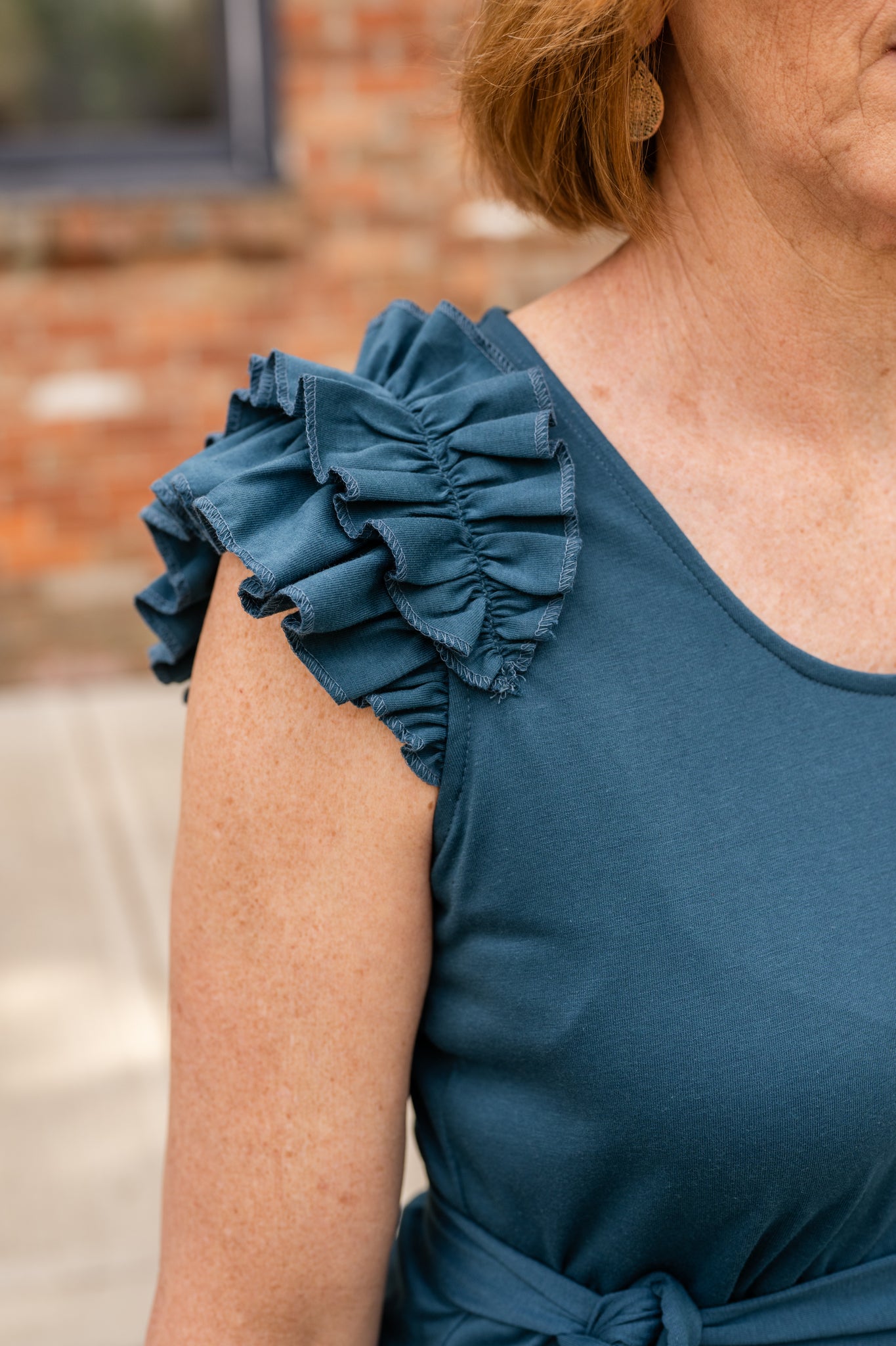 • Curved scoop neckline with cascading ruffle cap sleeves