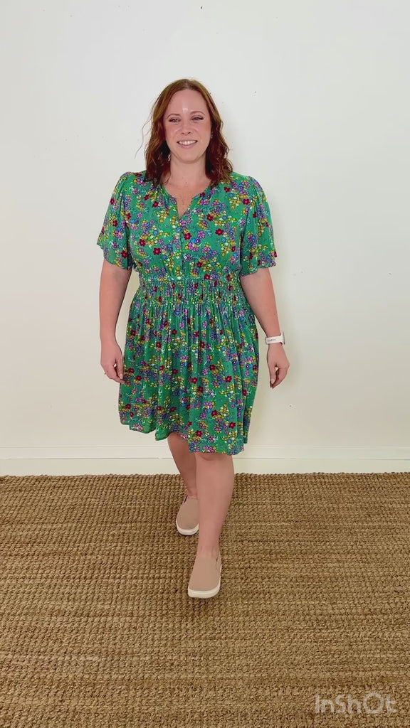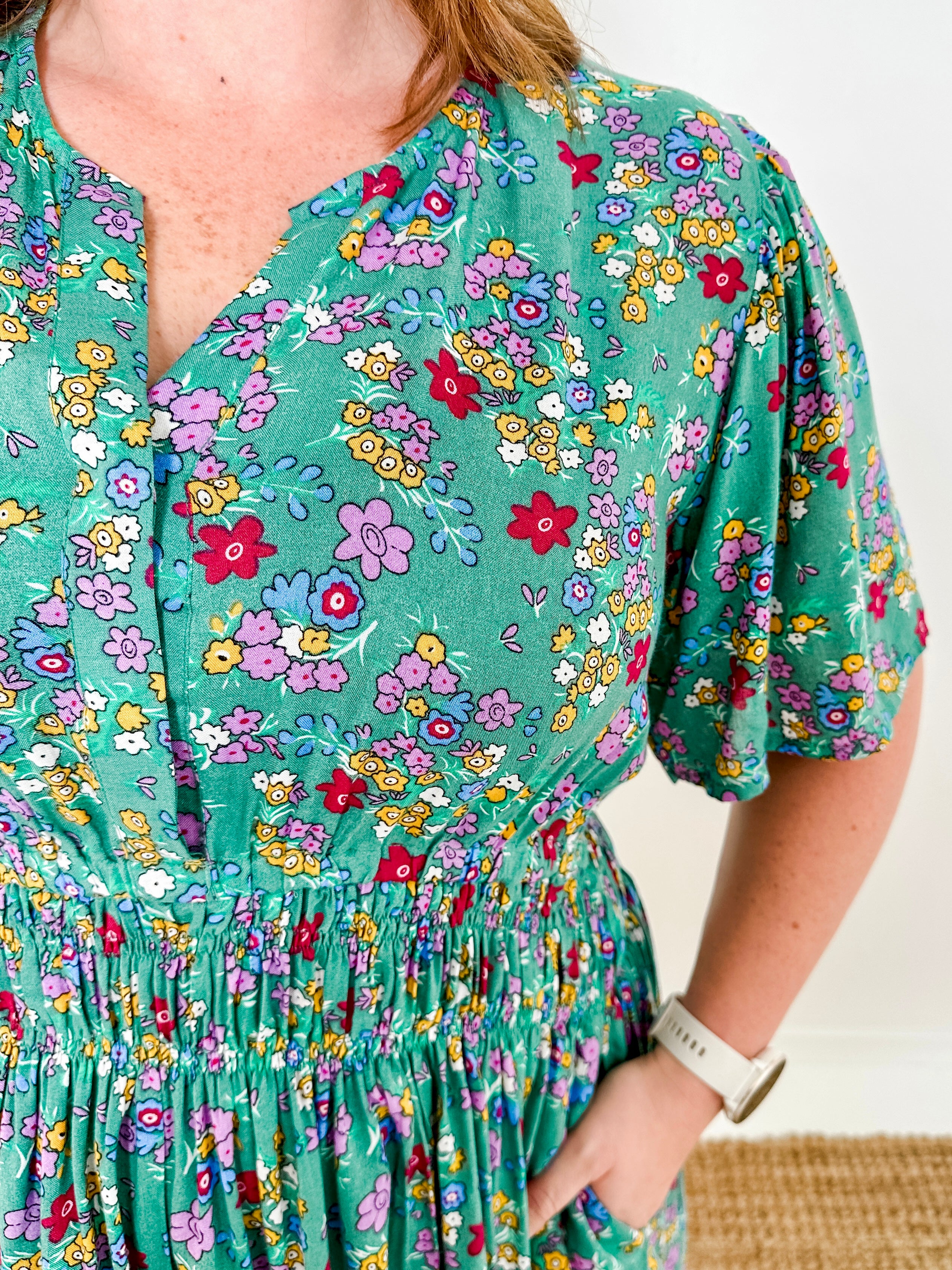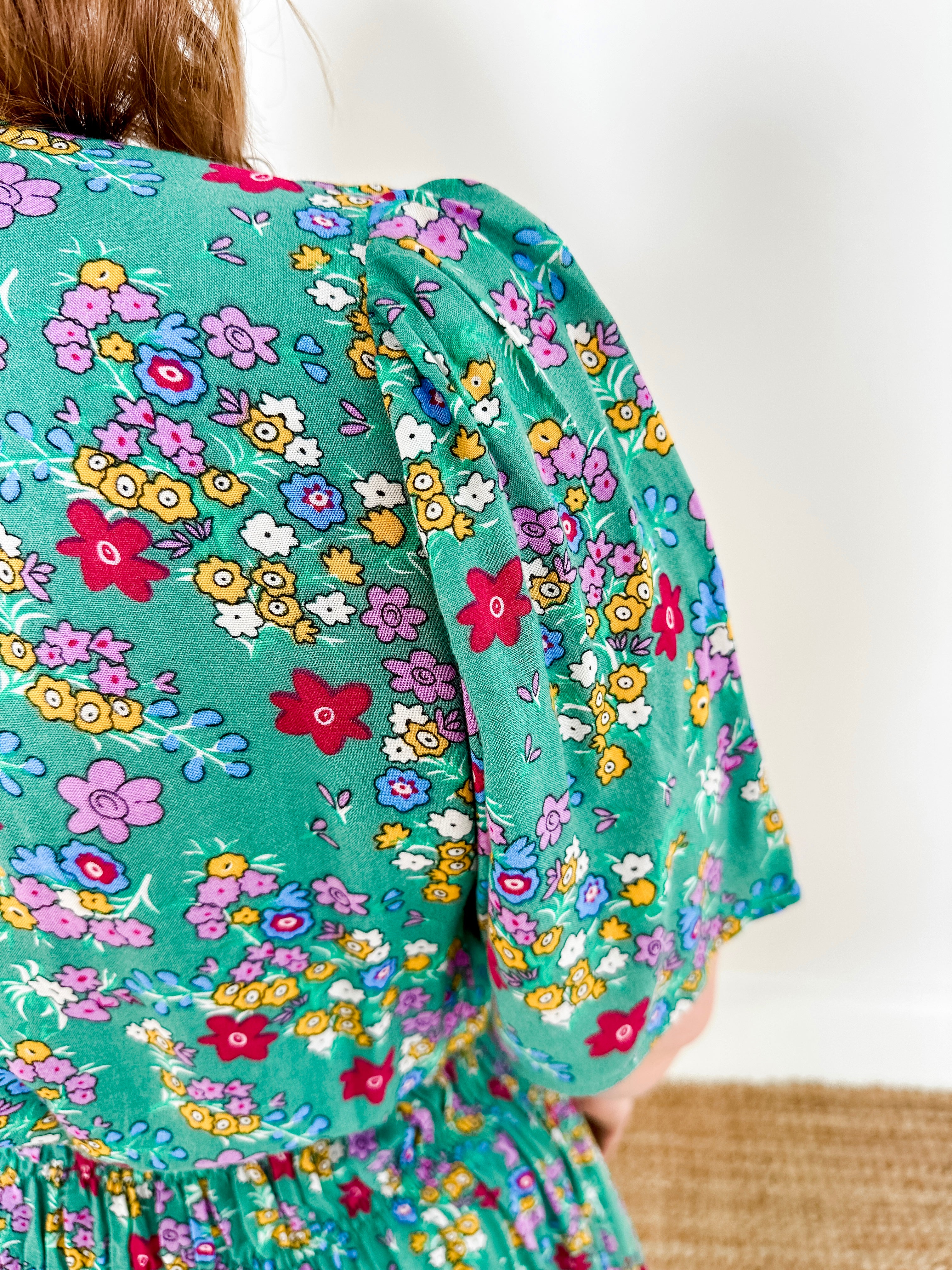 Created from surplus viscose material and features pockets, flutter sleeve, mid-high flattering elastic waist and front hook-n-eye closure.