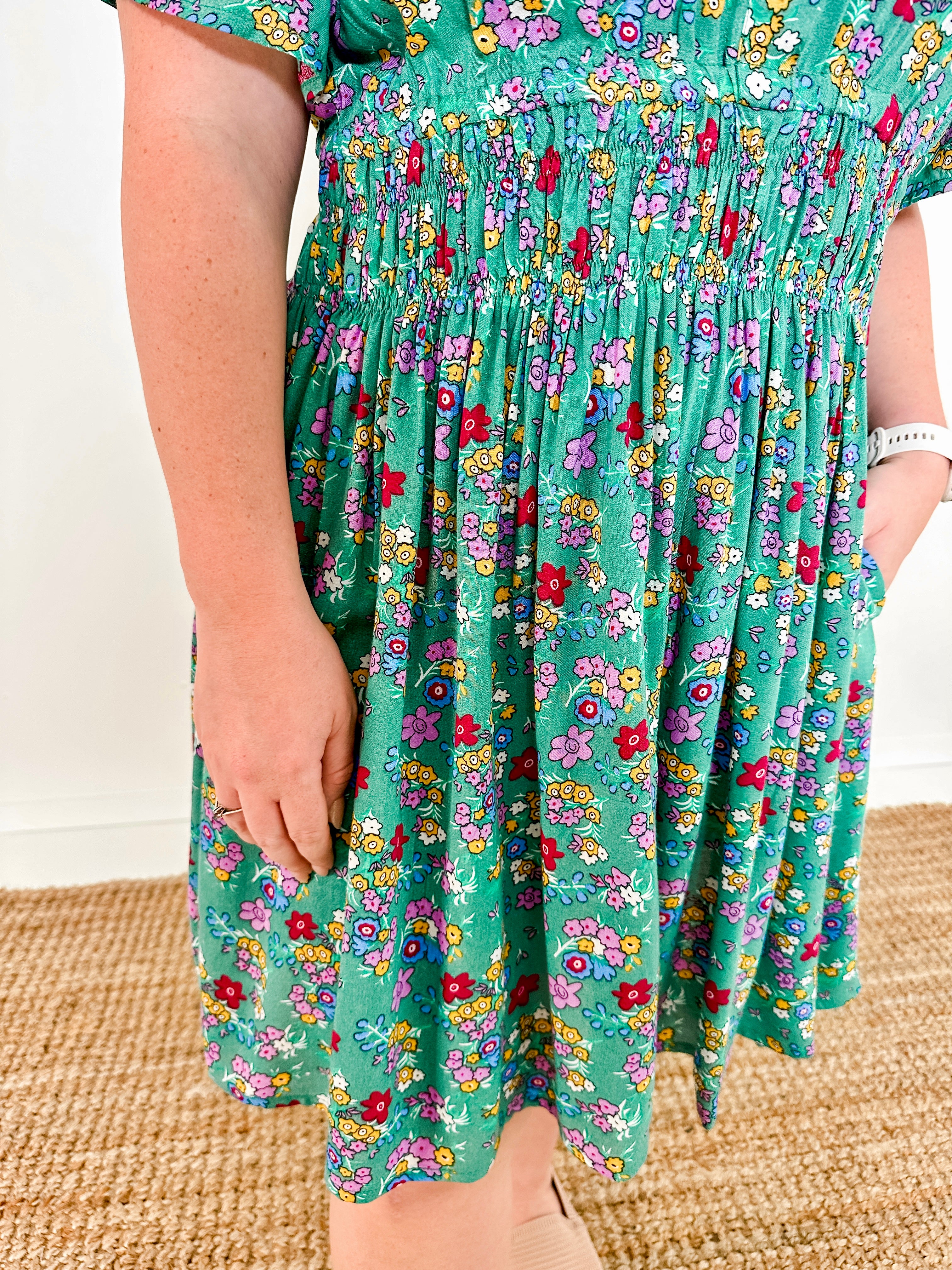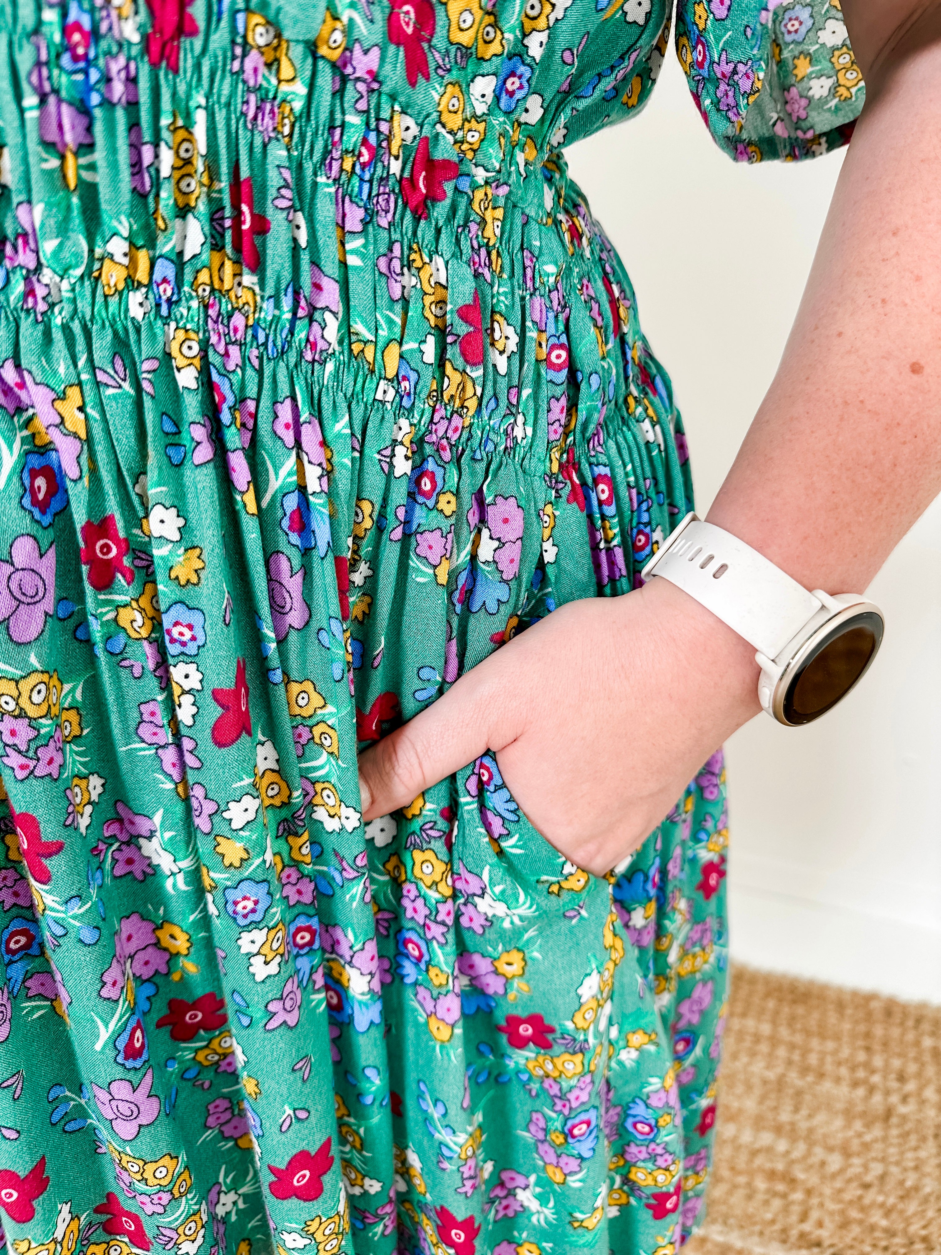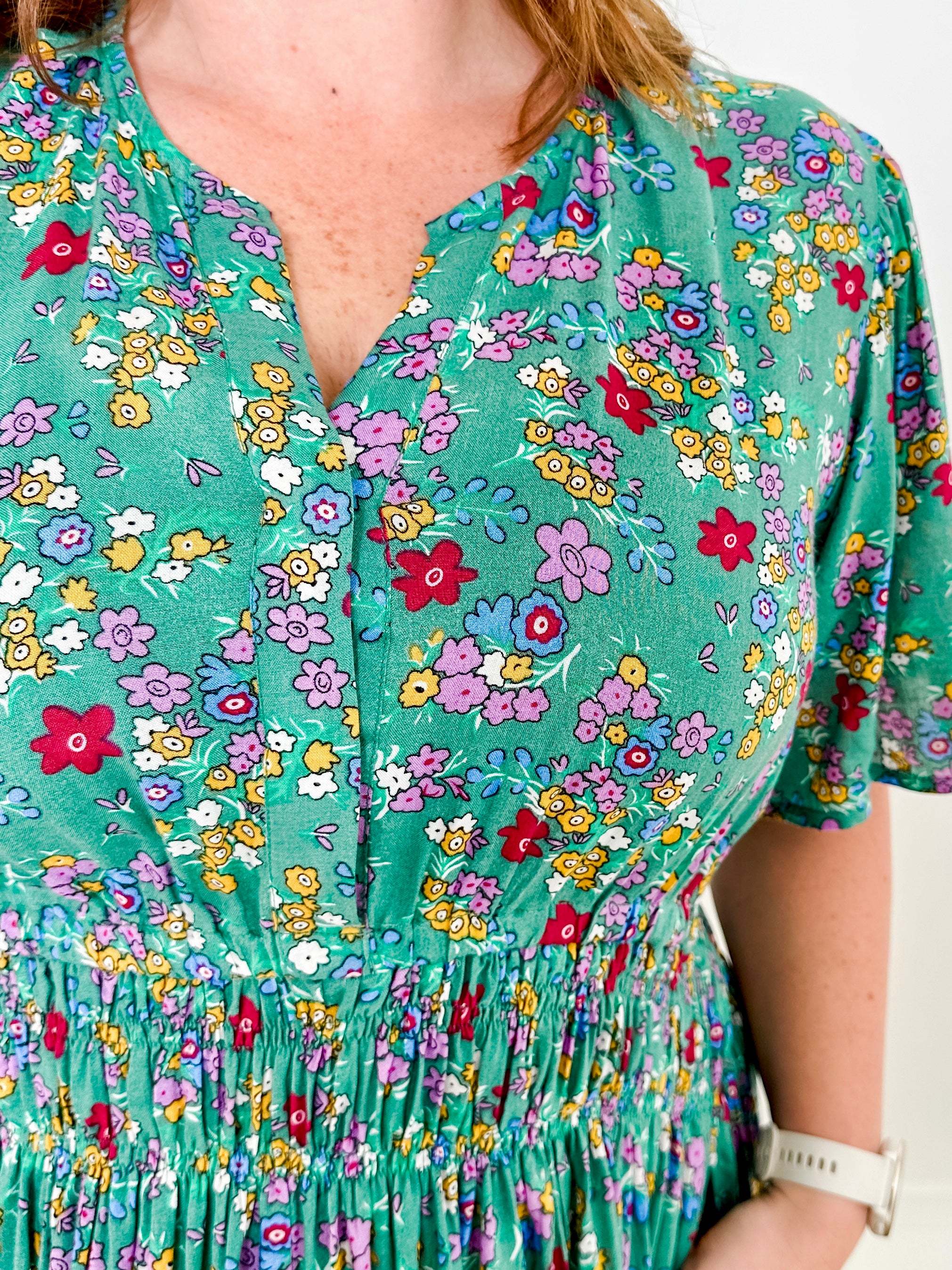 Created from surplus viscose material and features pockets, flutter sleeve, mid-high flattering elastic waist and front hook-n-eye closure.