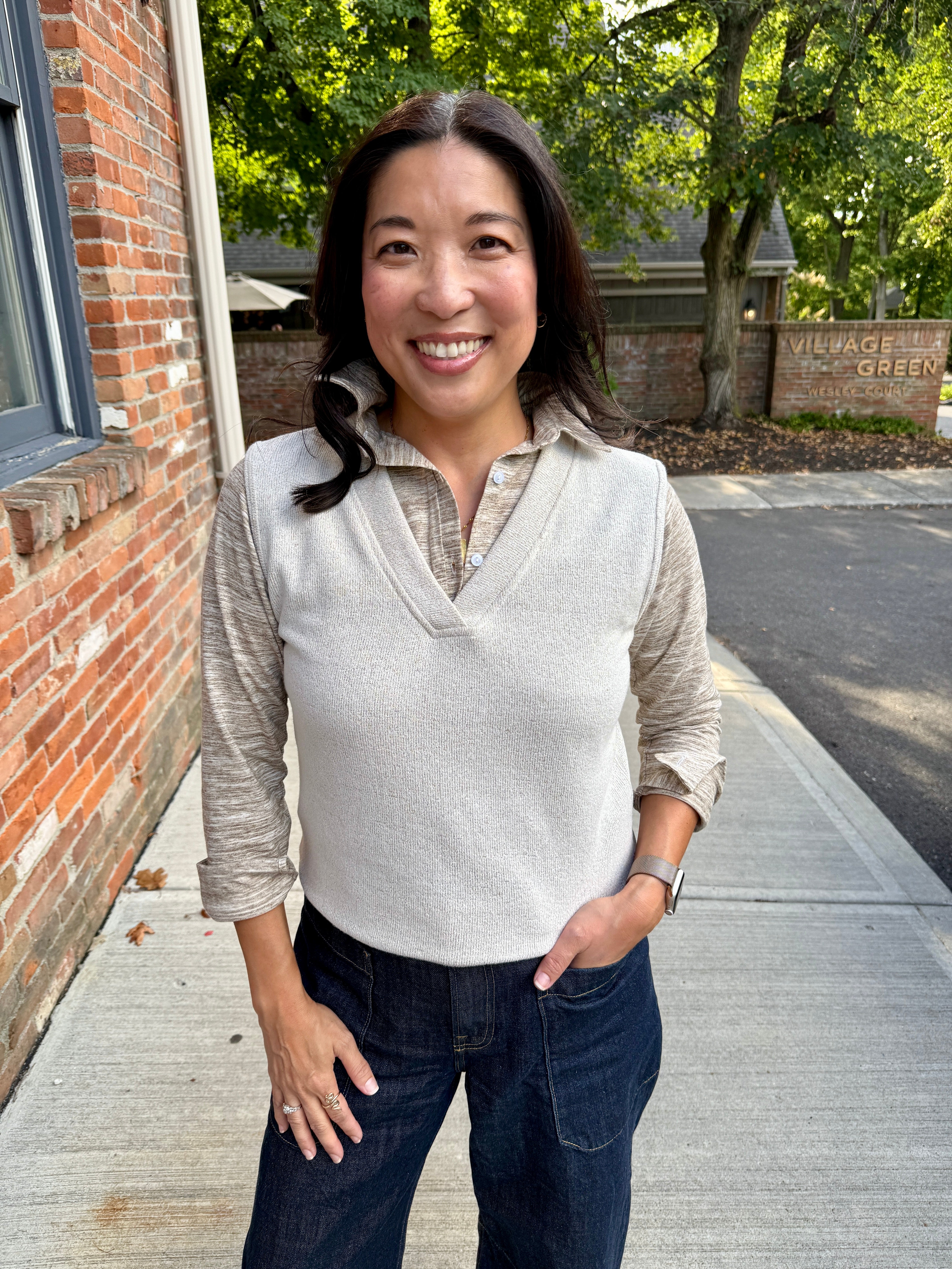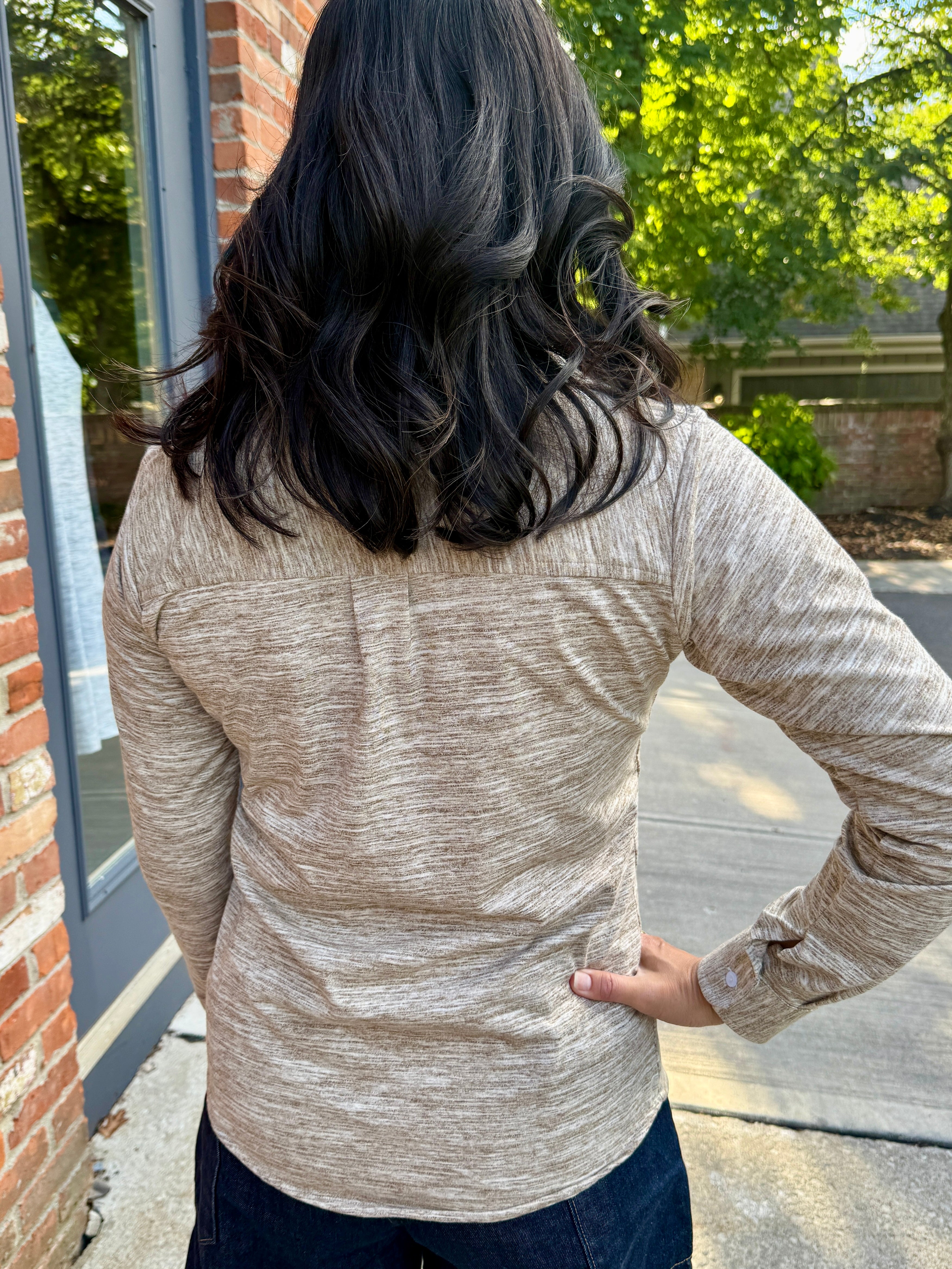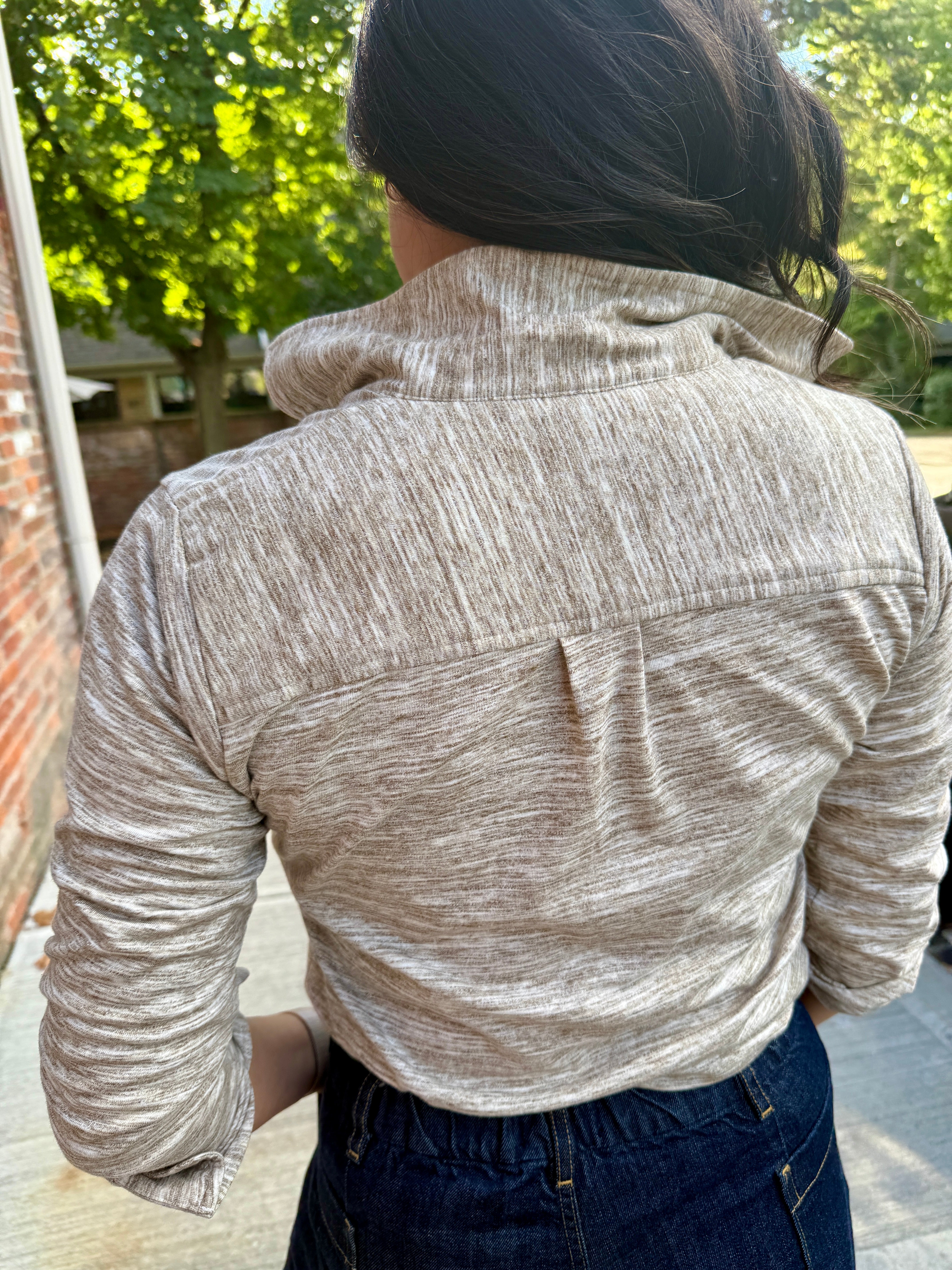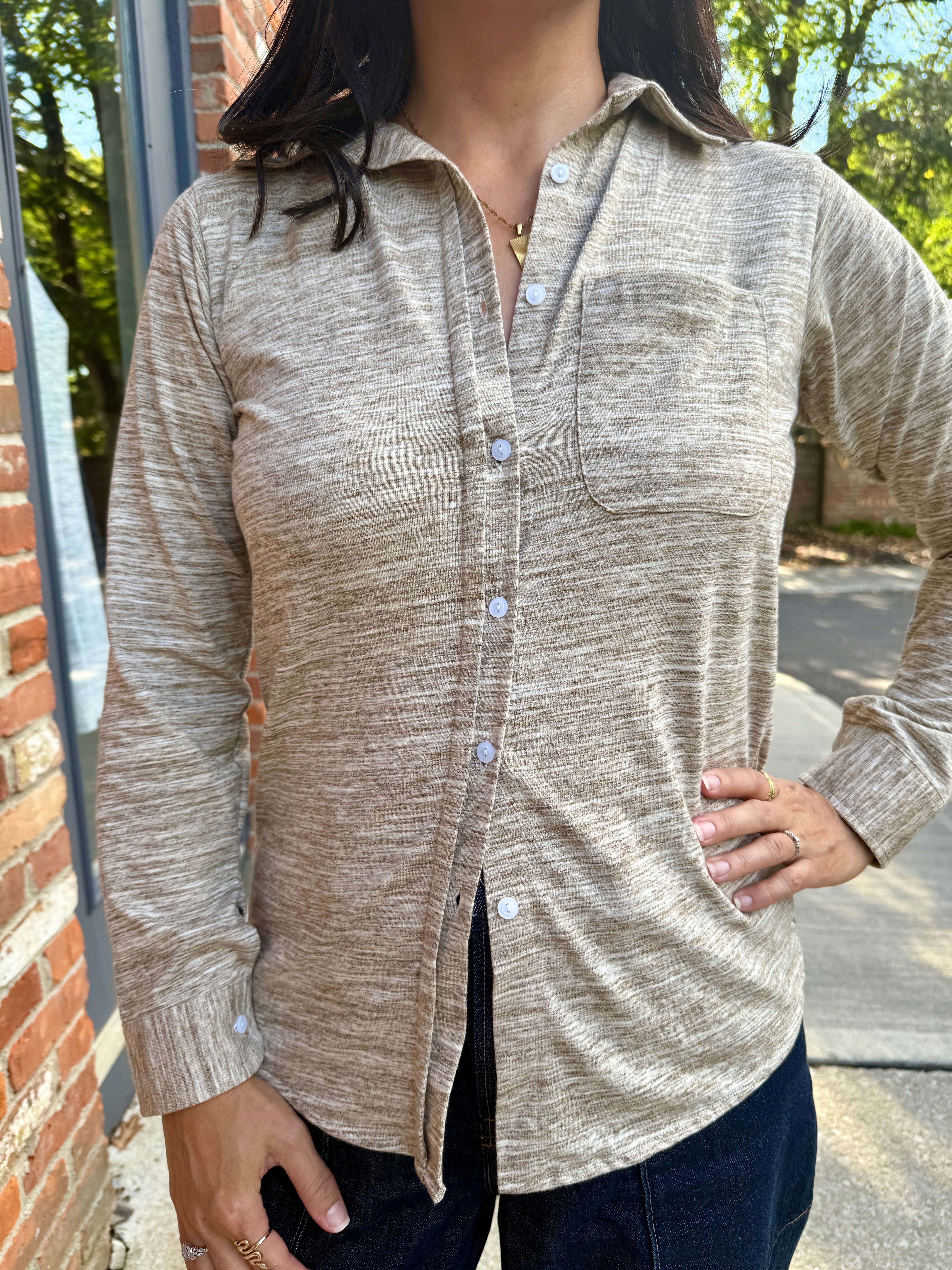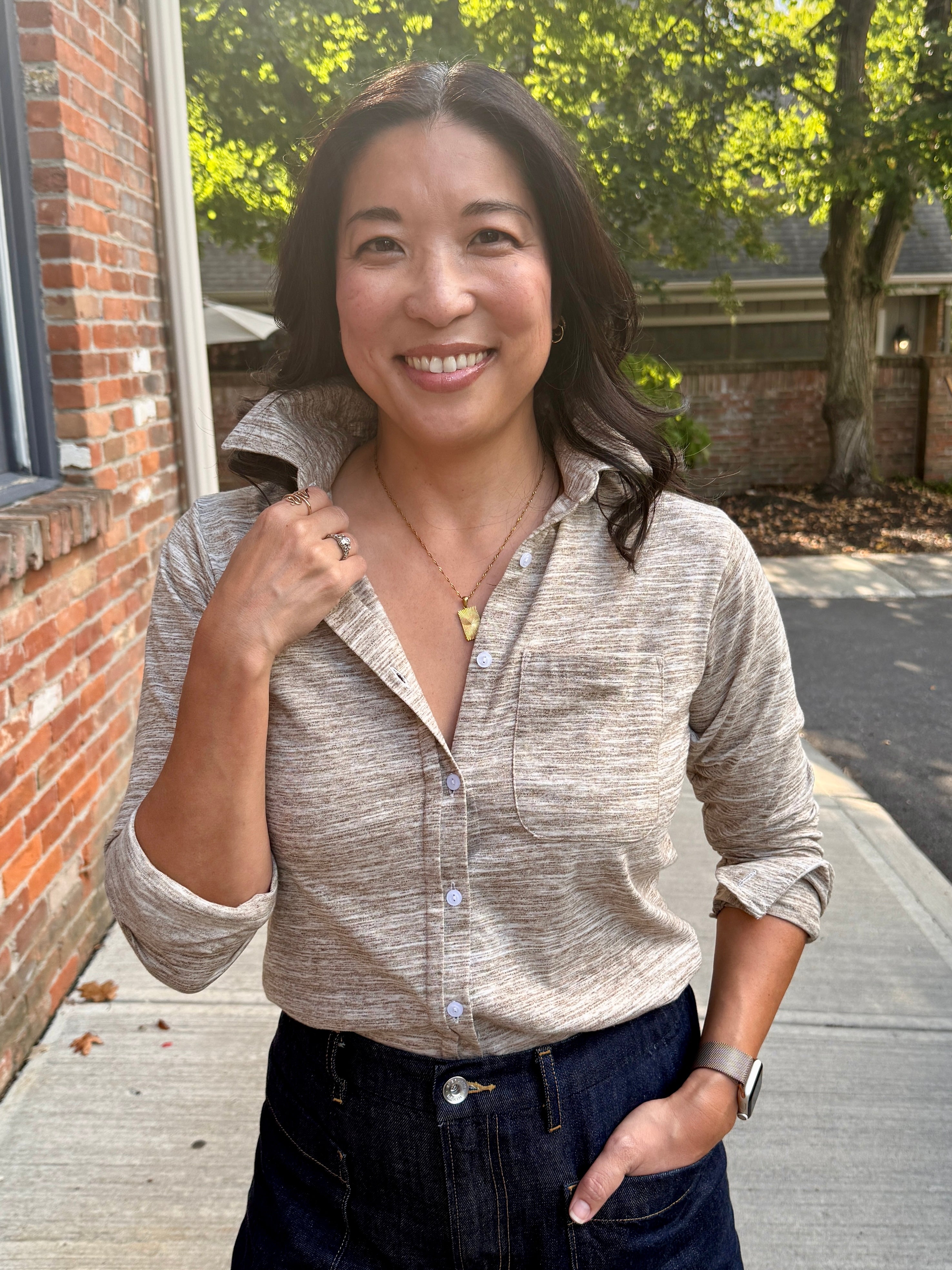 A sustainable, versatile button-front blouse crafted from 100% cotton jersey knit surplus fabric. Features a classic fit with front pocket, partial covered button placket, and back yoke pleat. Perfect for wearing alone or layering without bulk.