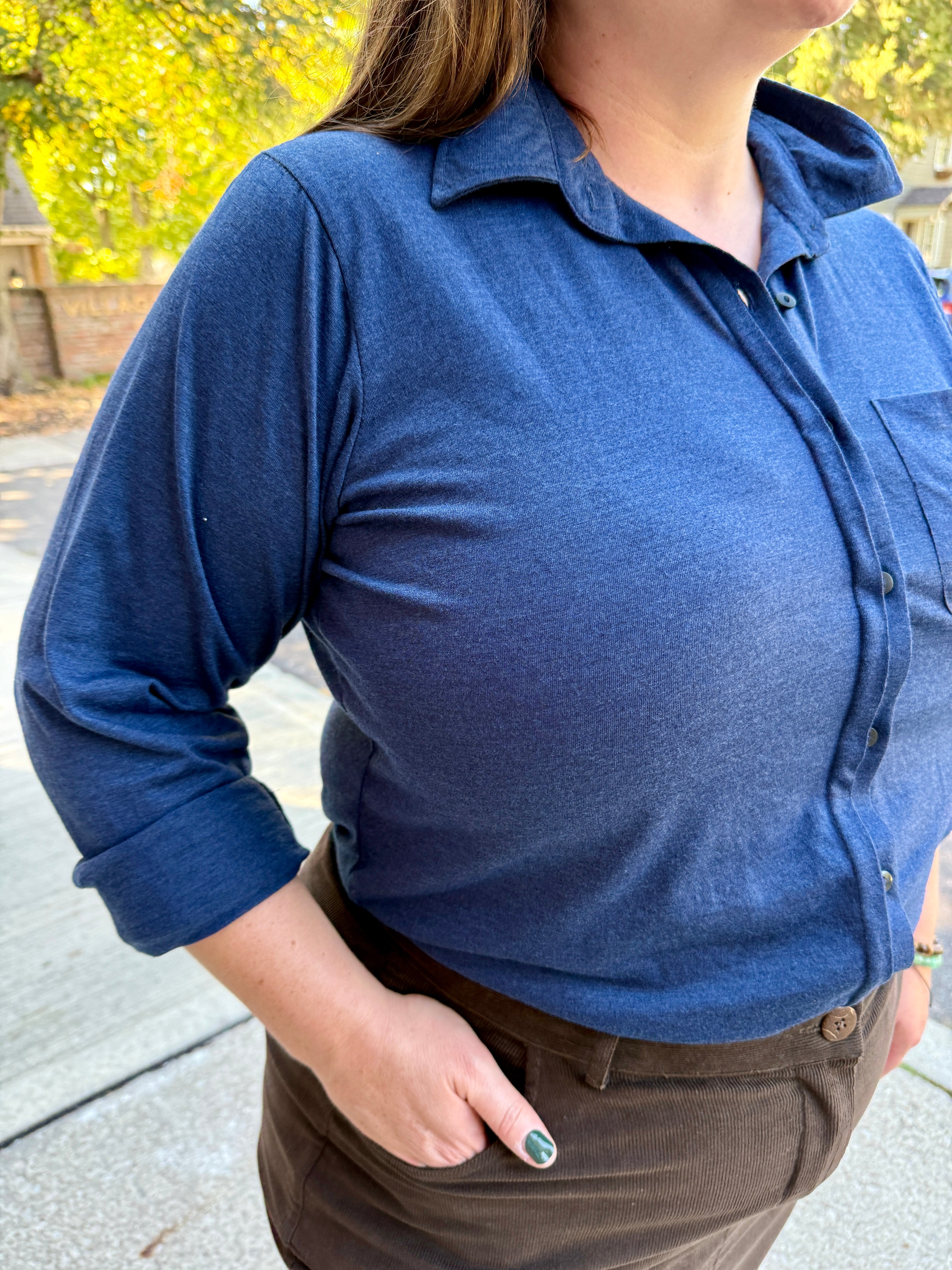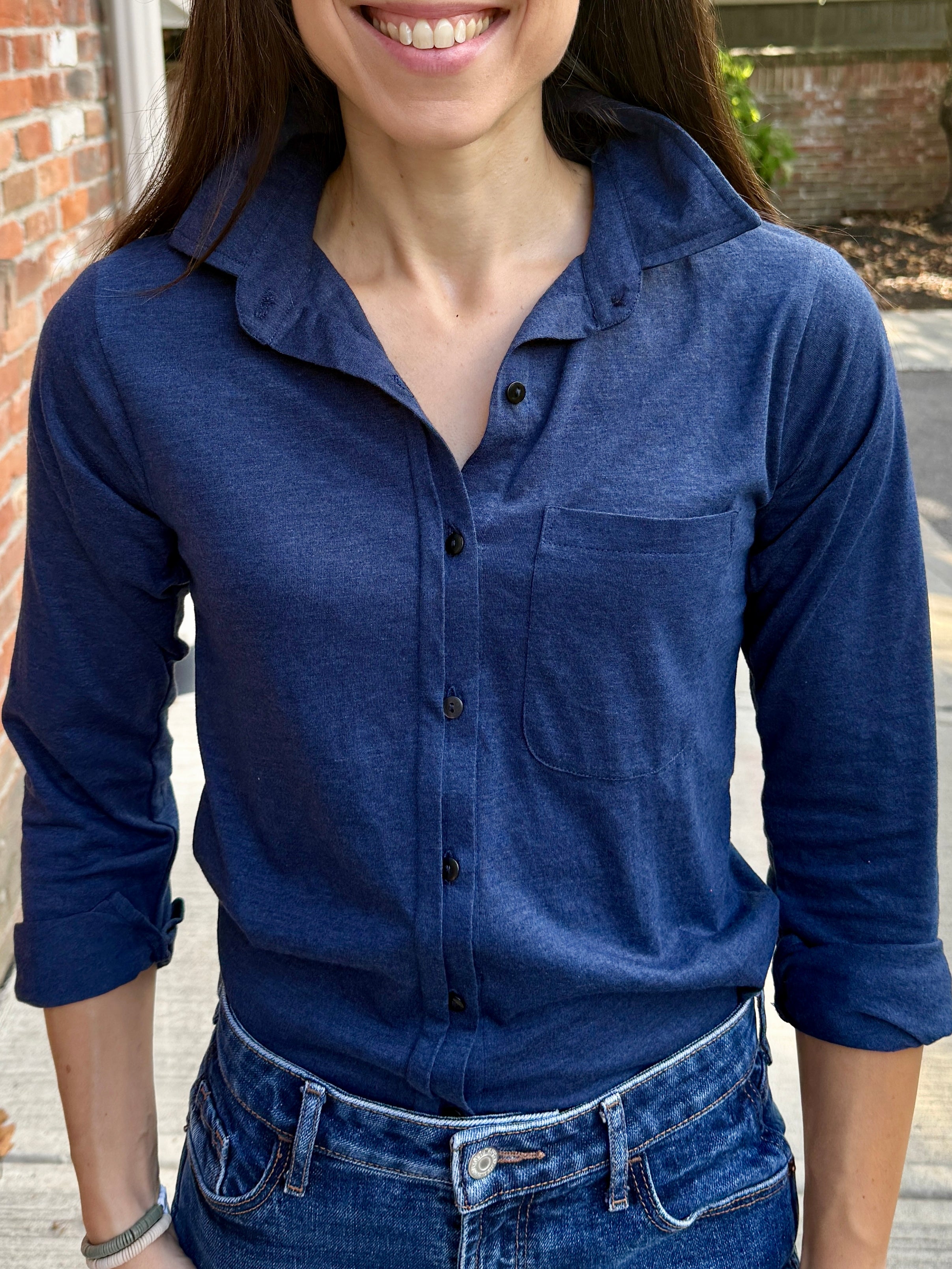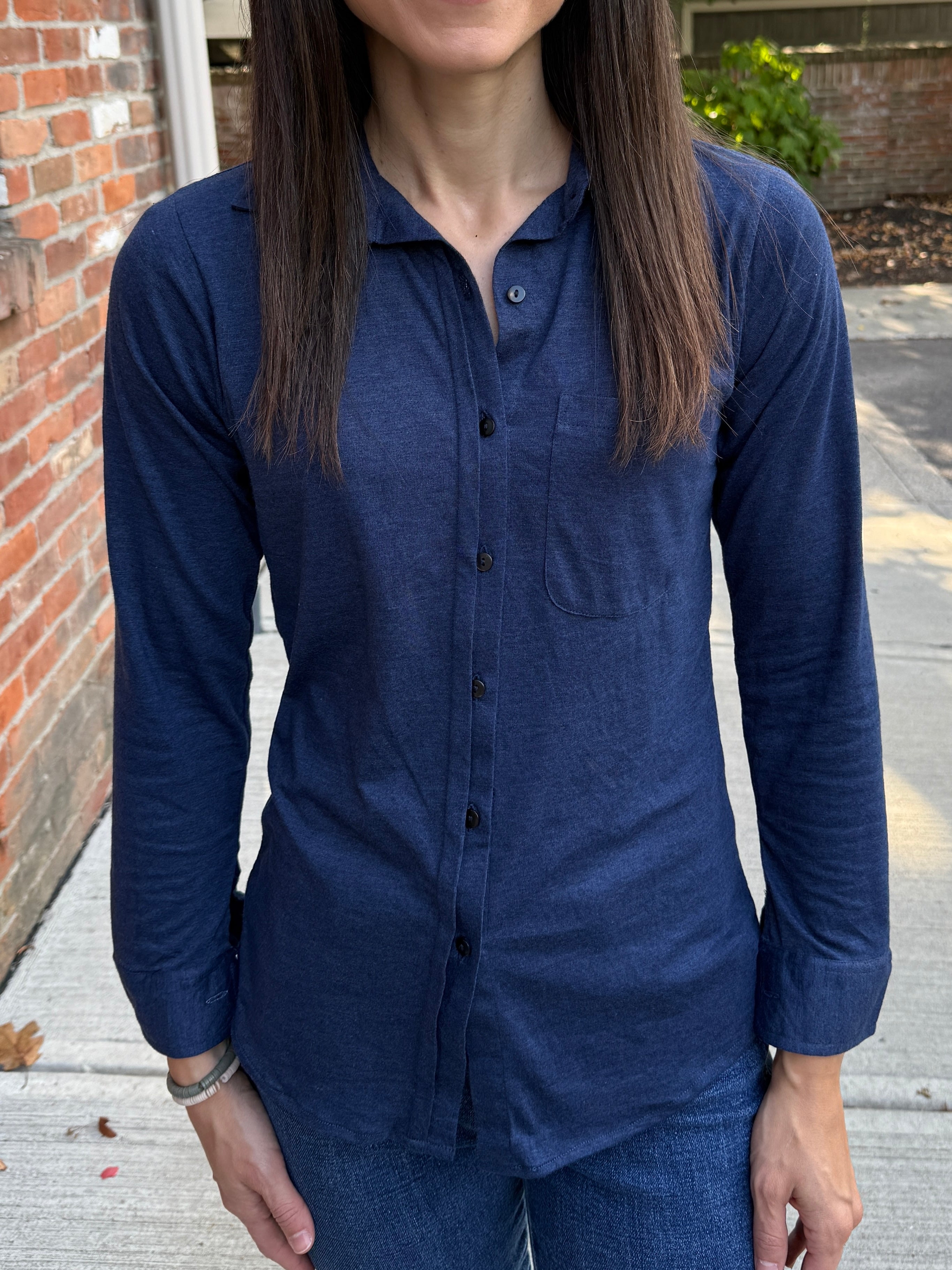 Classic button-up shirt crafted from 100% cotton jersey knit surplus fabric. Features a timeless design with modern comfort.