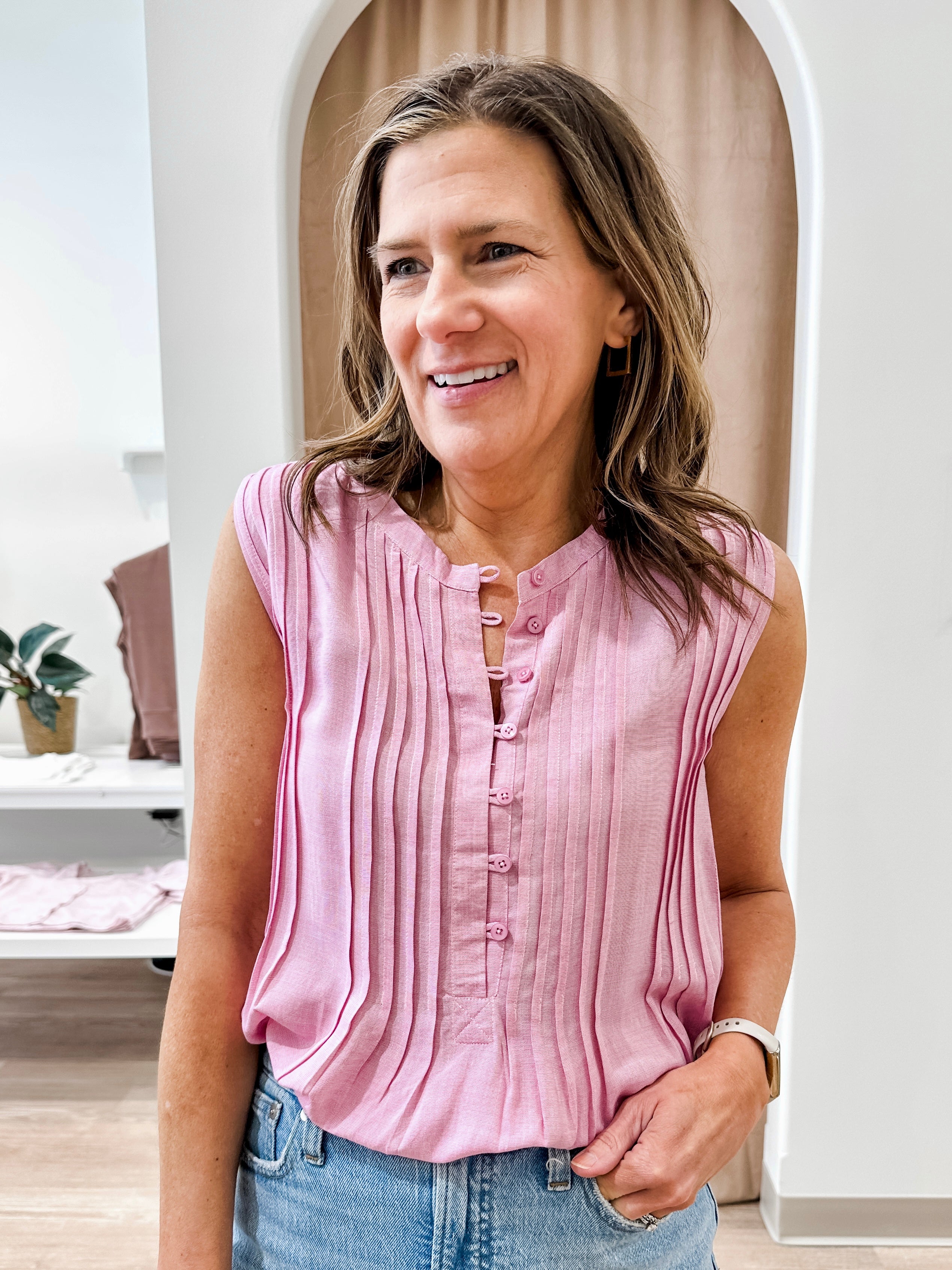 Sleeveless pleated blouse crafted from soft sustainable surplus cotton. Features a revised 2024 pattern with relaxed fit and refined details for versatile everyday or office wear.