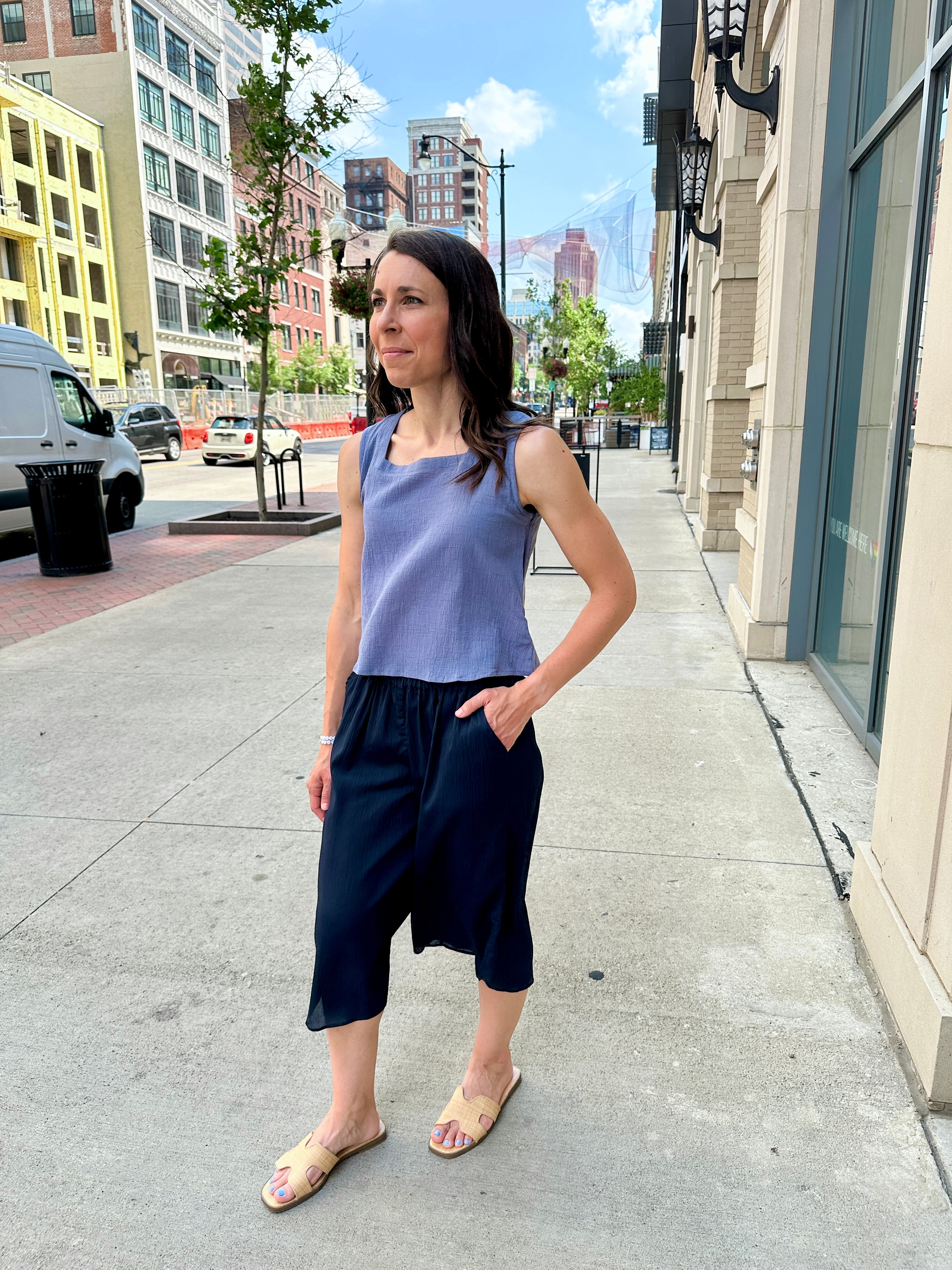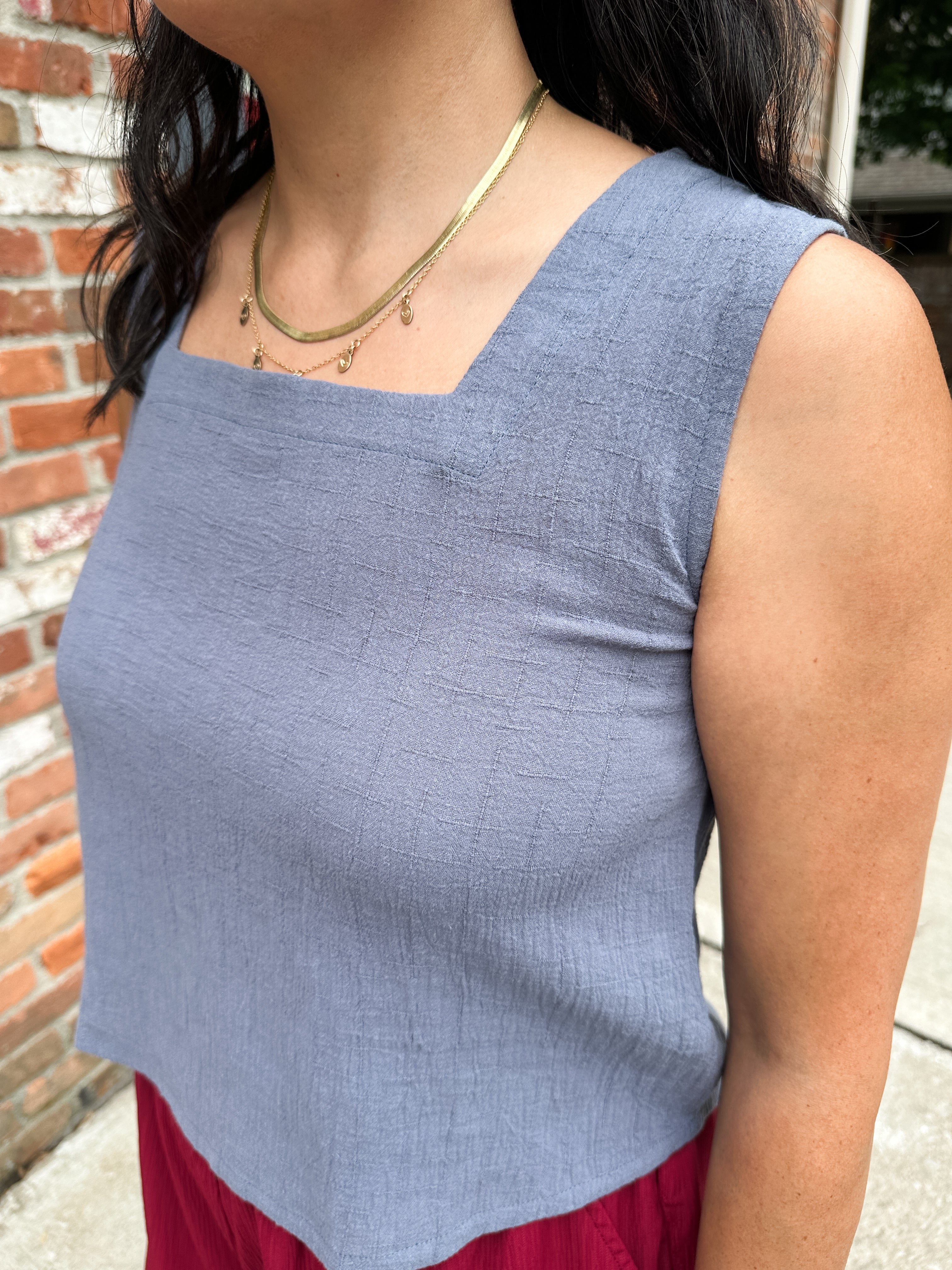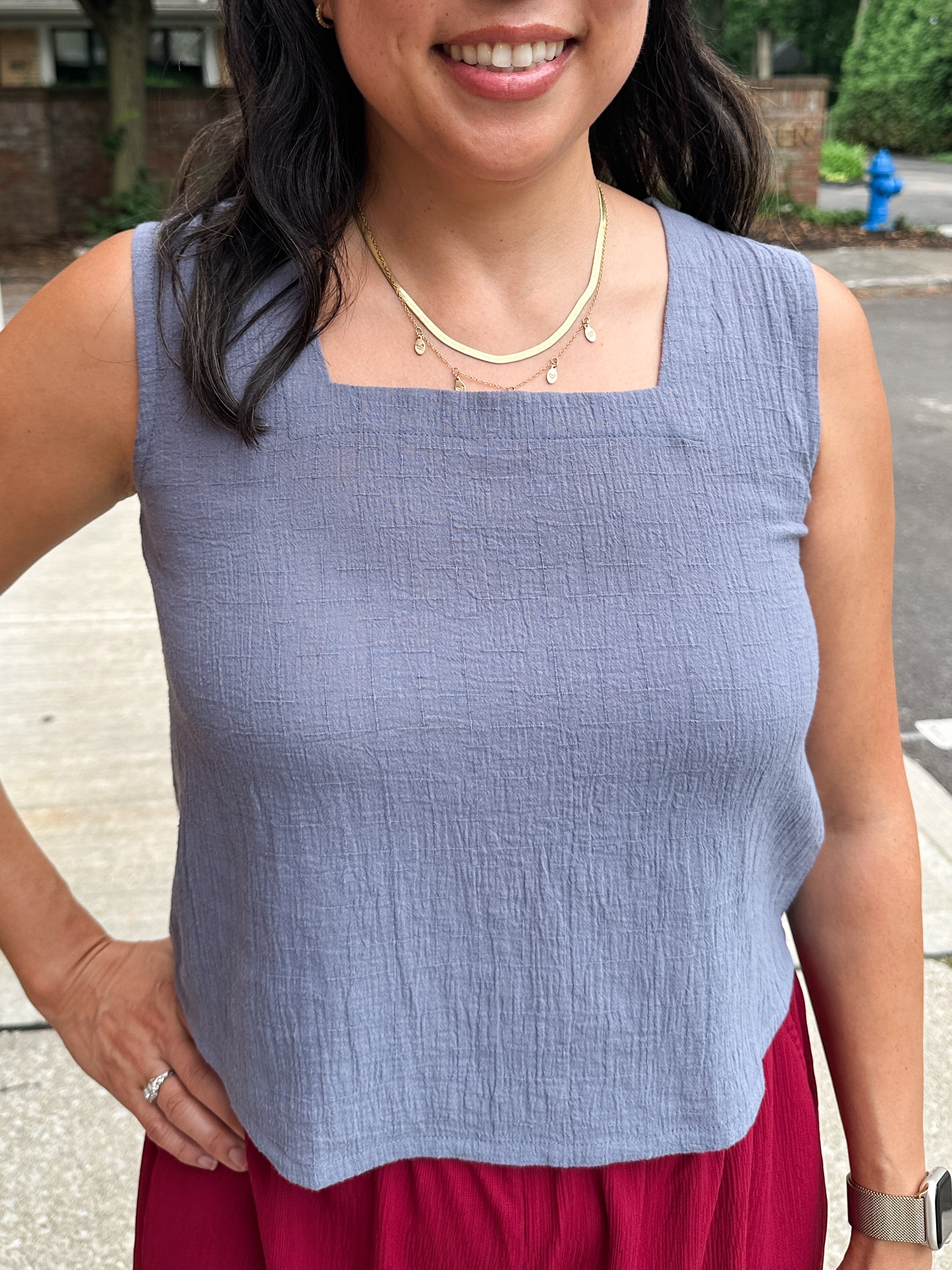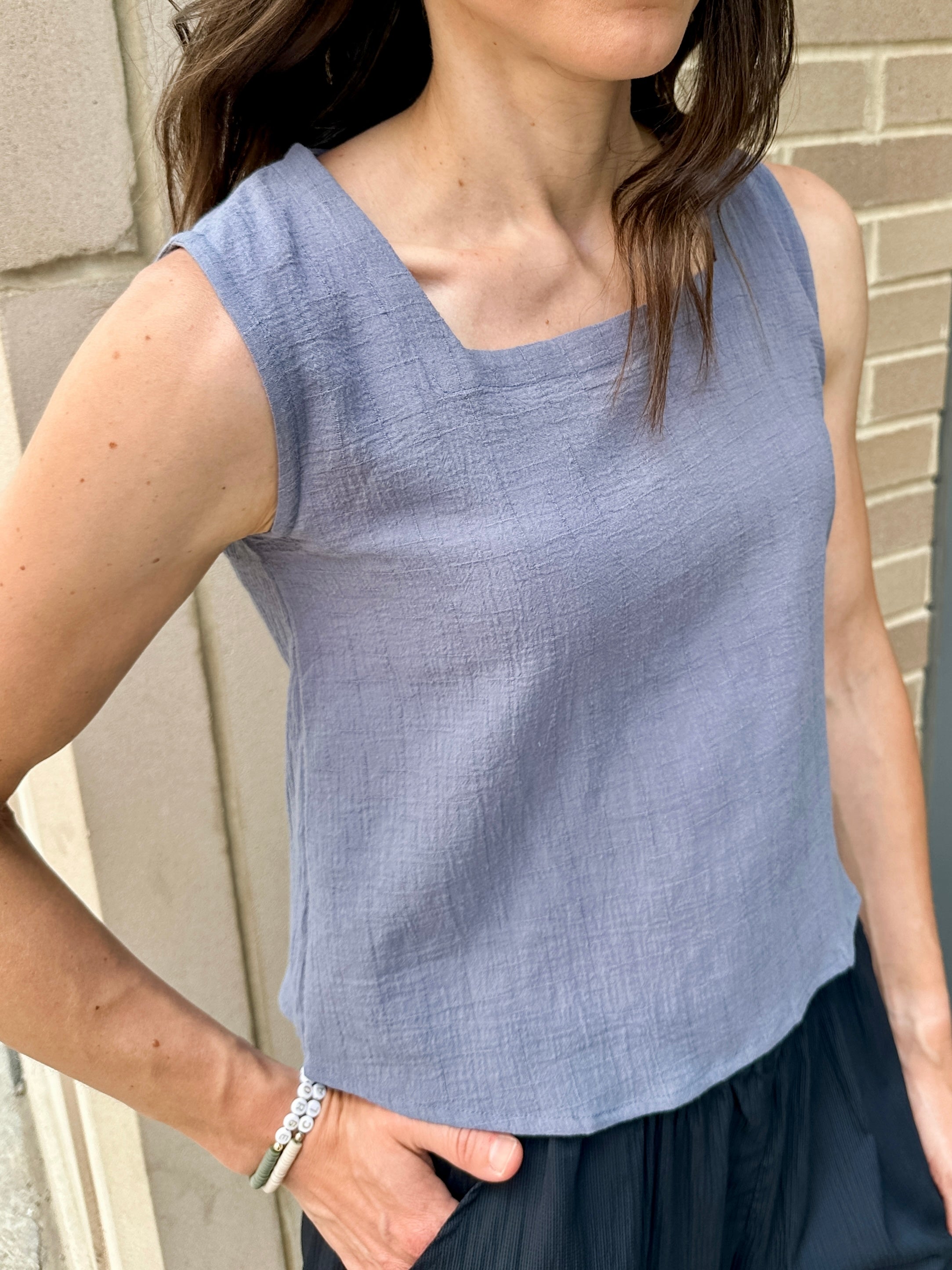 Elevate your summer wardrobe with this versatile sleeveless square neck top crafted from 100% crinkle cotton gauze surplus fabrics. Lightweight and airy with a sophisticated finish.