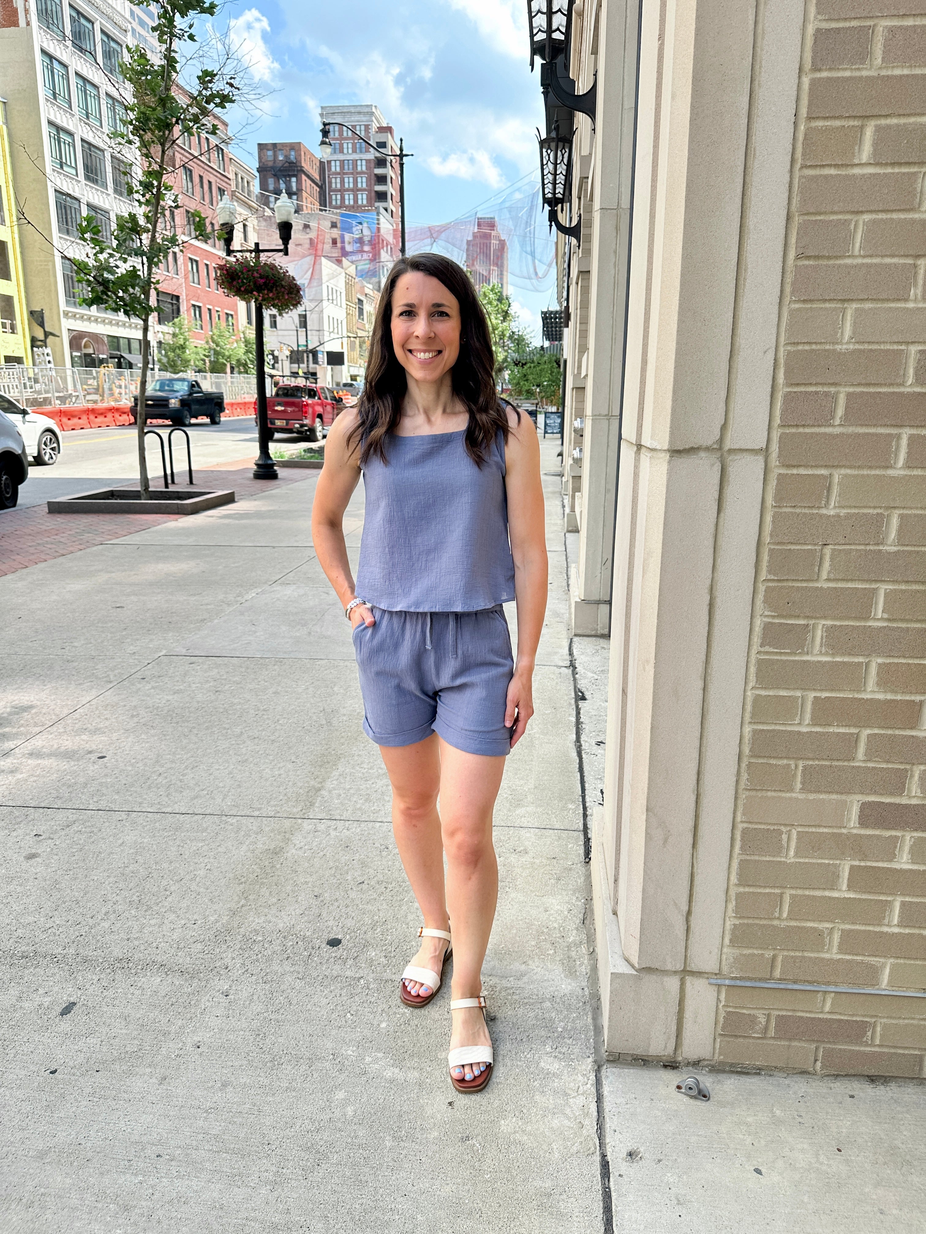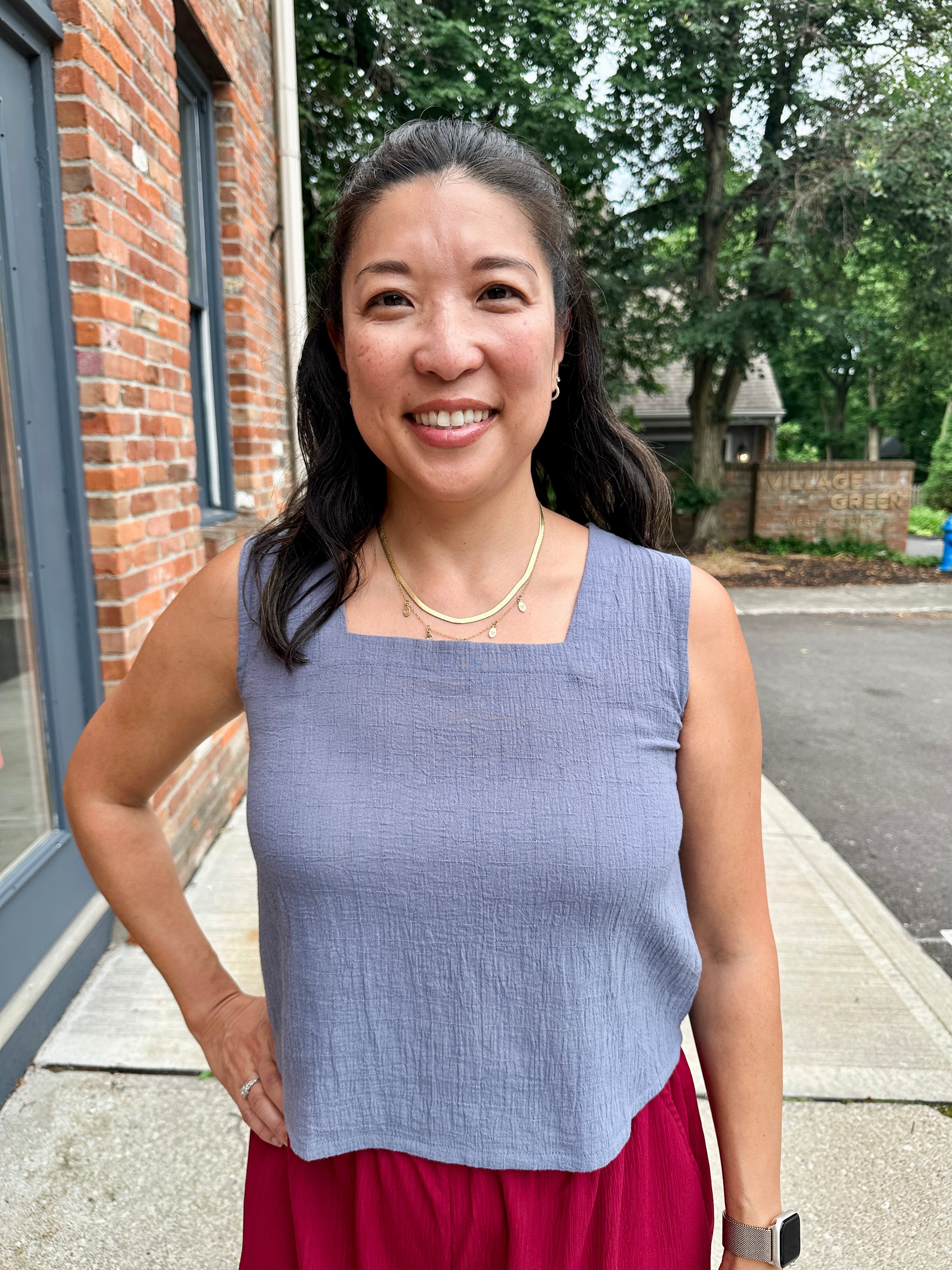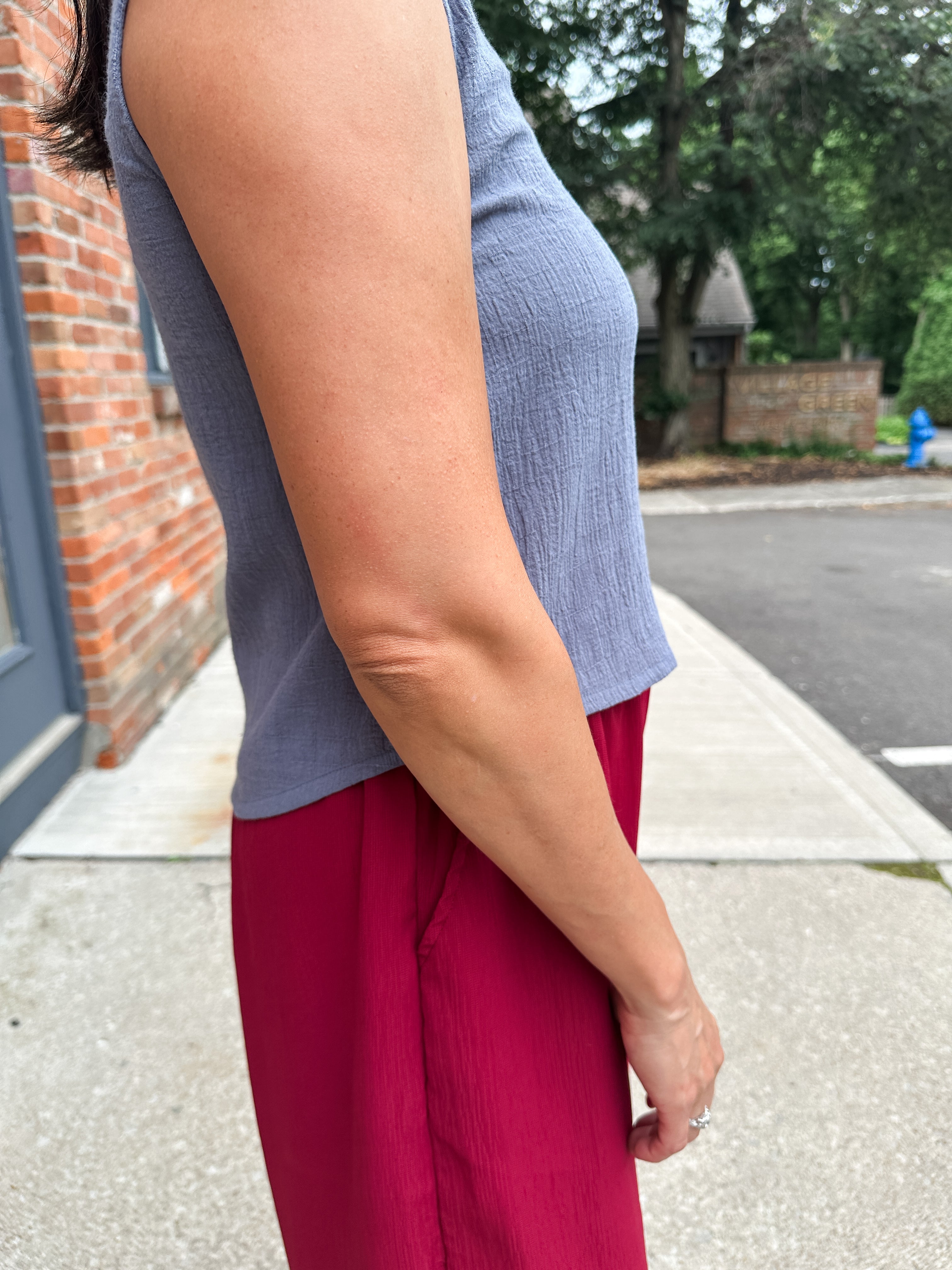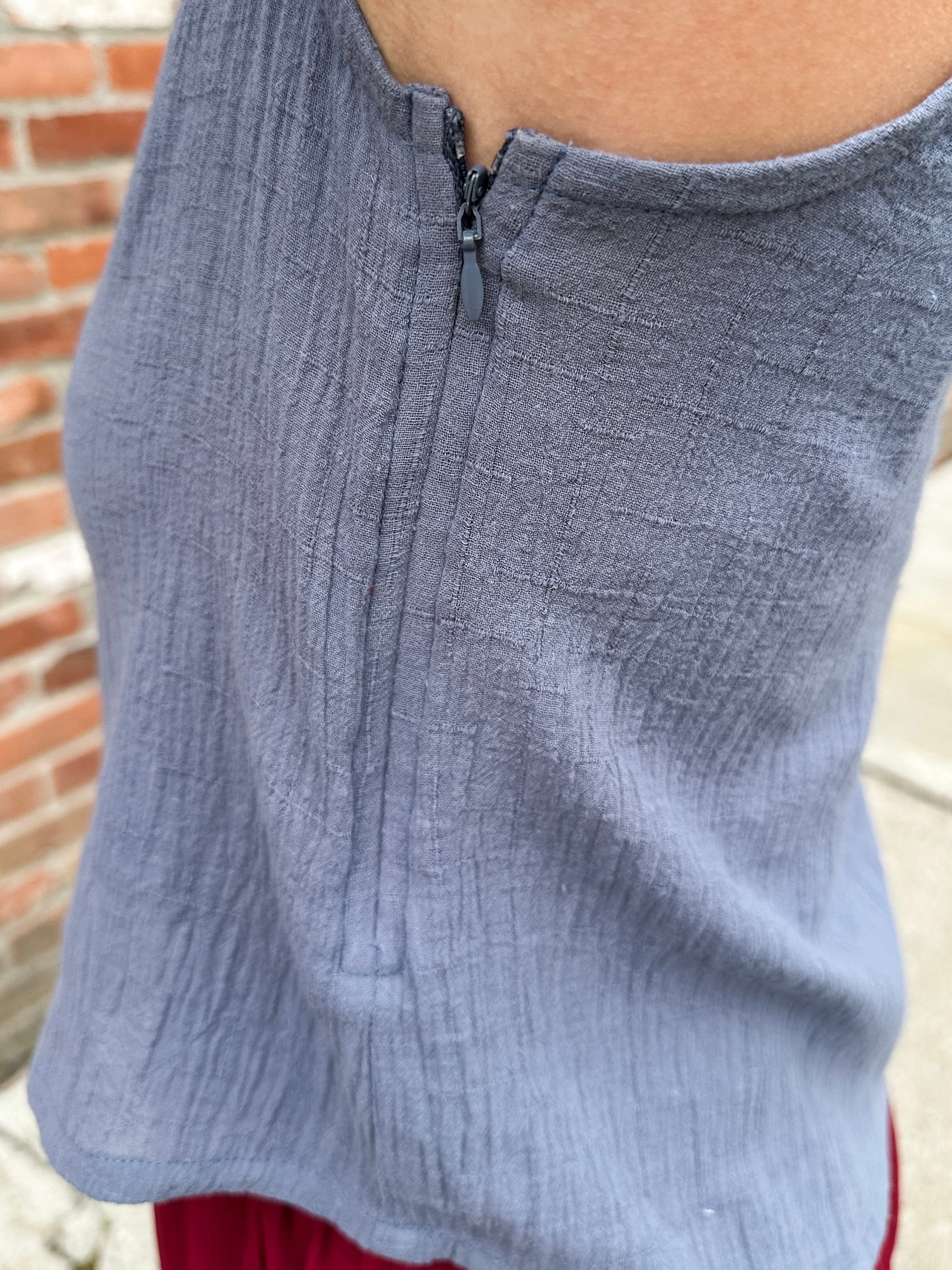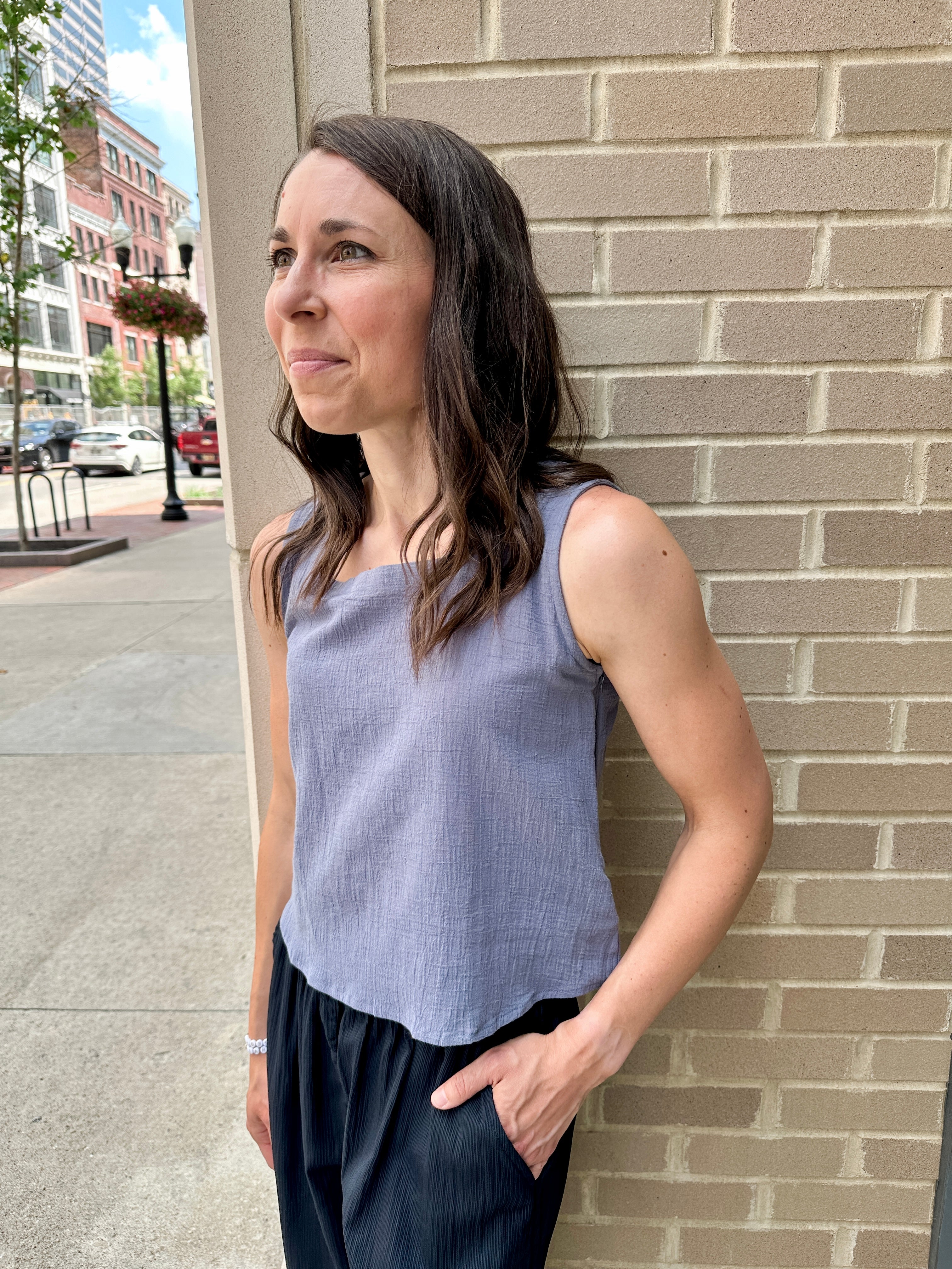 Elevate your summer wardrobe with this versatile sleeveless square neck top crafted from 100% crinkle cotton gauze surplus fabrics. Lightweight and airy with a sophisticated finish.