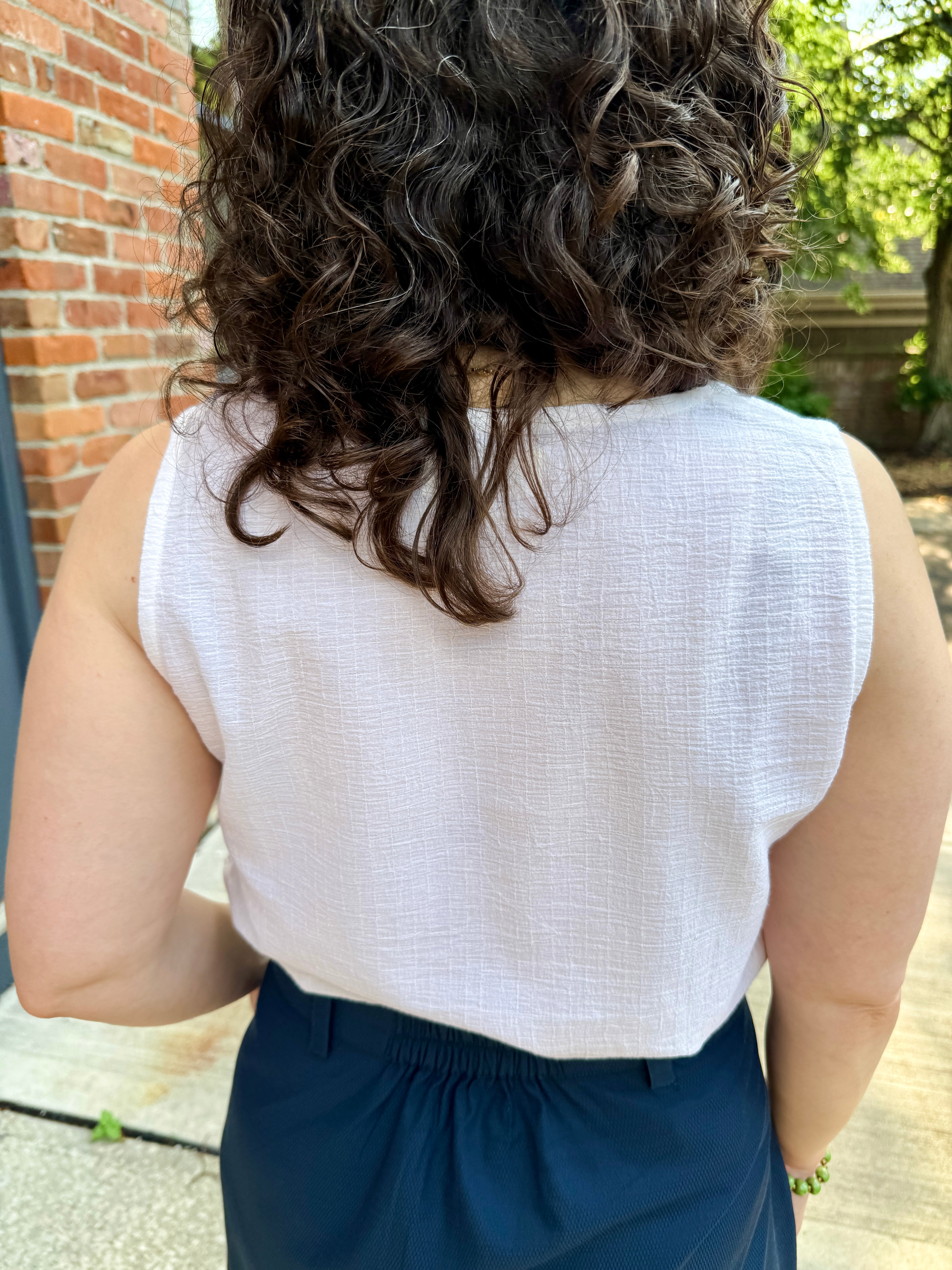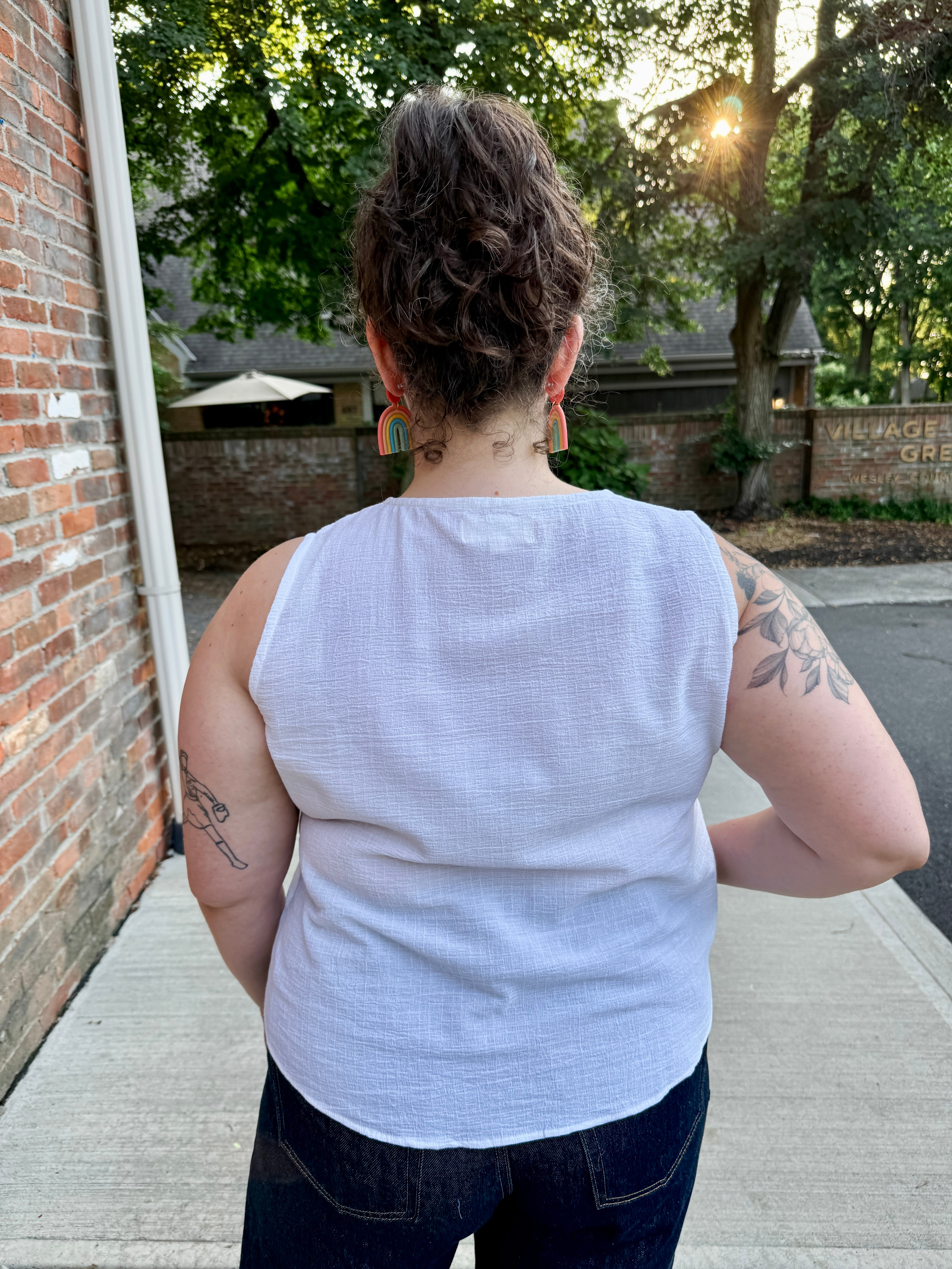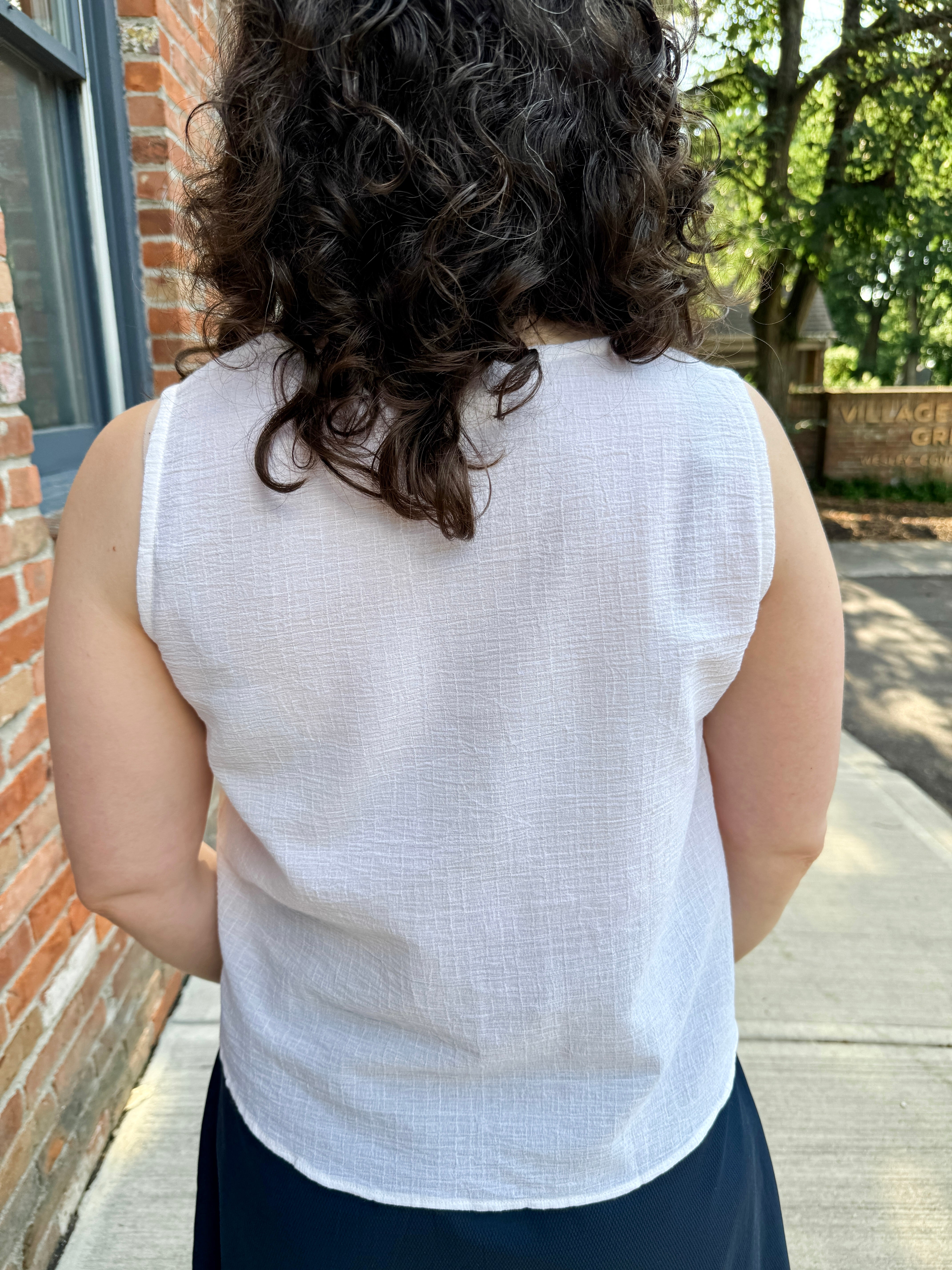 Effortlessly chic sleeveless square neck top in lightweight crinkle cotton gauze. Perfect for warm weather styling with a flattering silhouette that hits just below the waist.