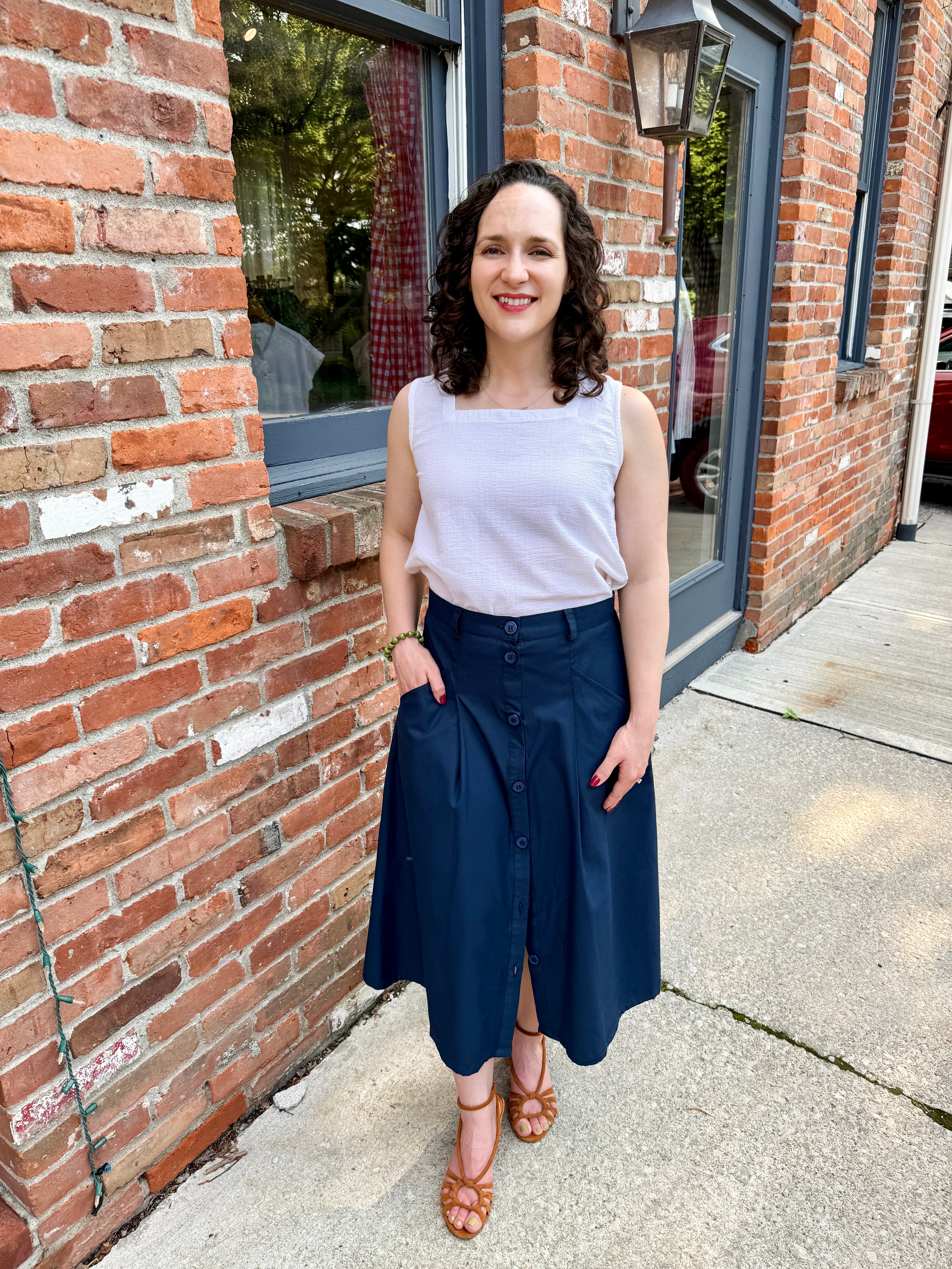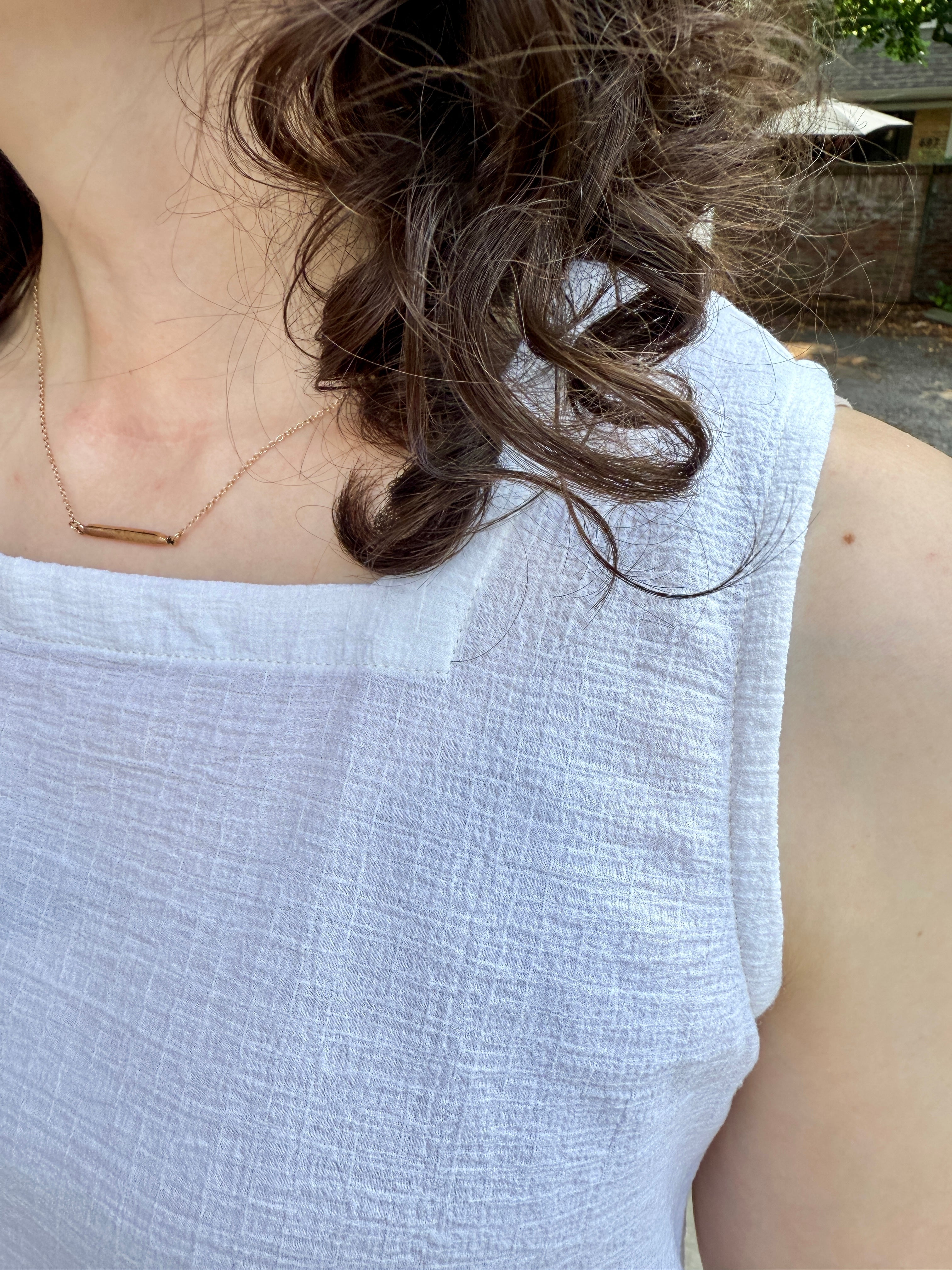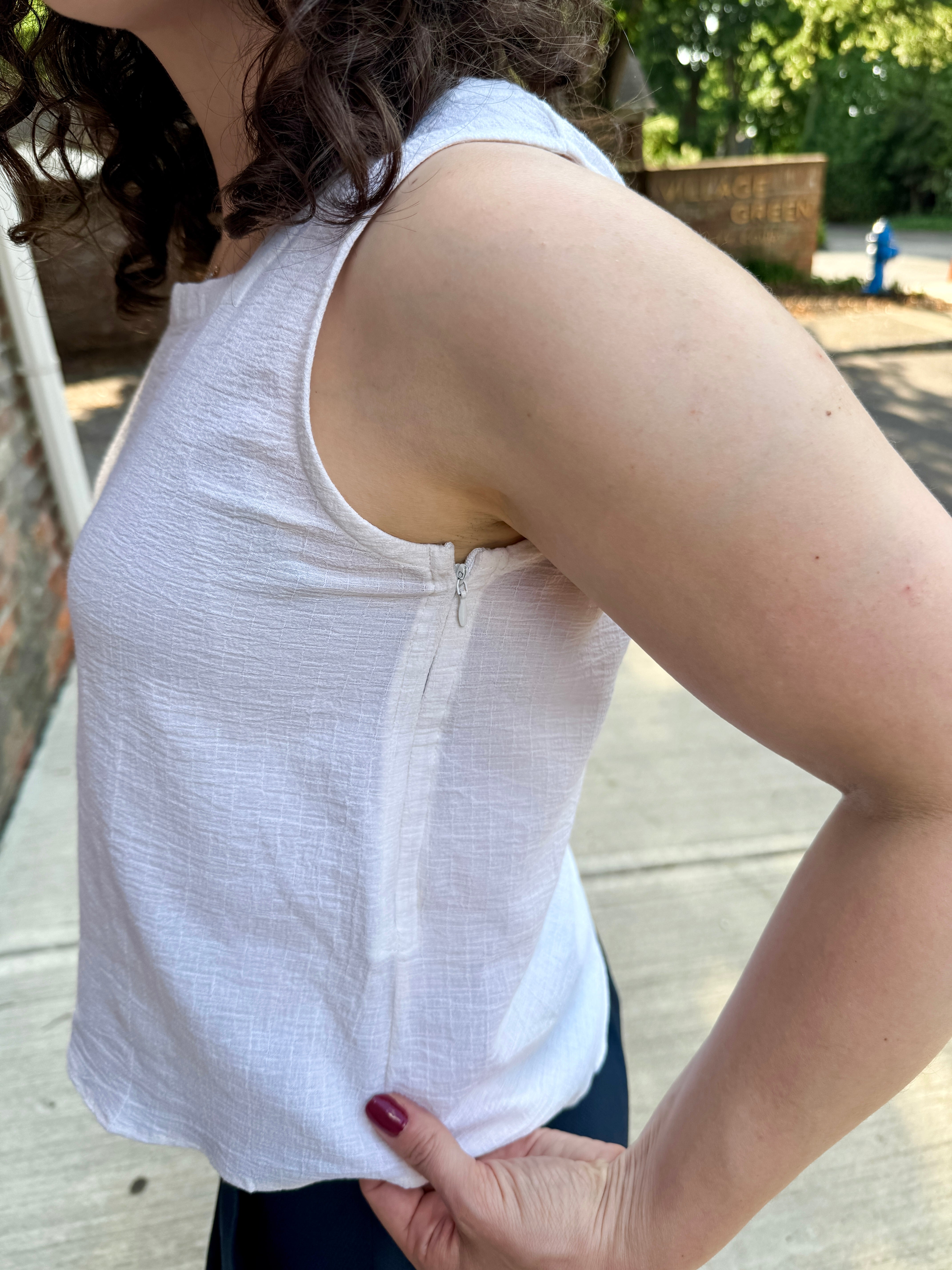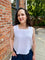 Effortlessly chic sleeveless square neck top in lightweight crinkle cotton gauze. Perfect for warm weather styling with a flattering silhouette that hits just below the waist.