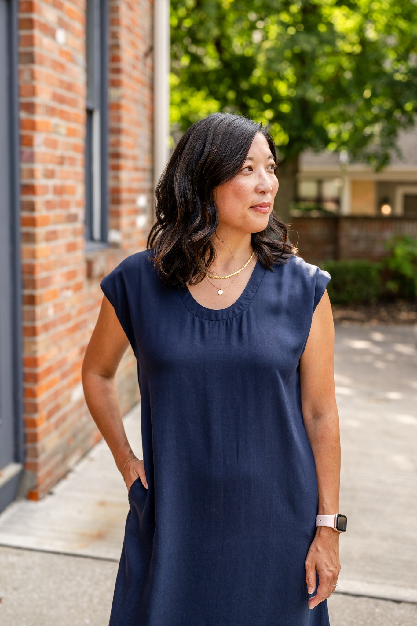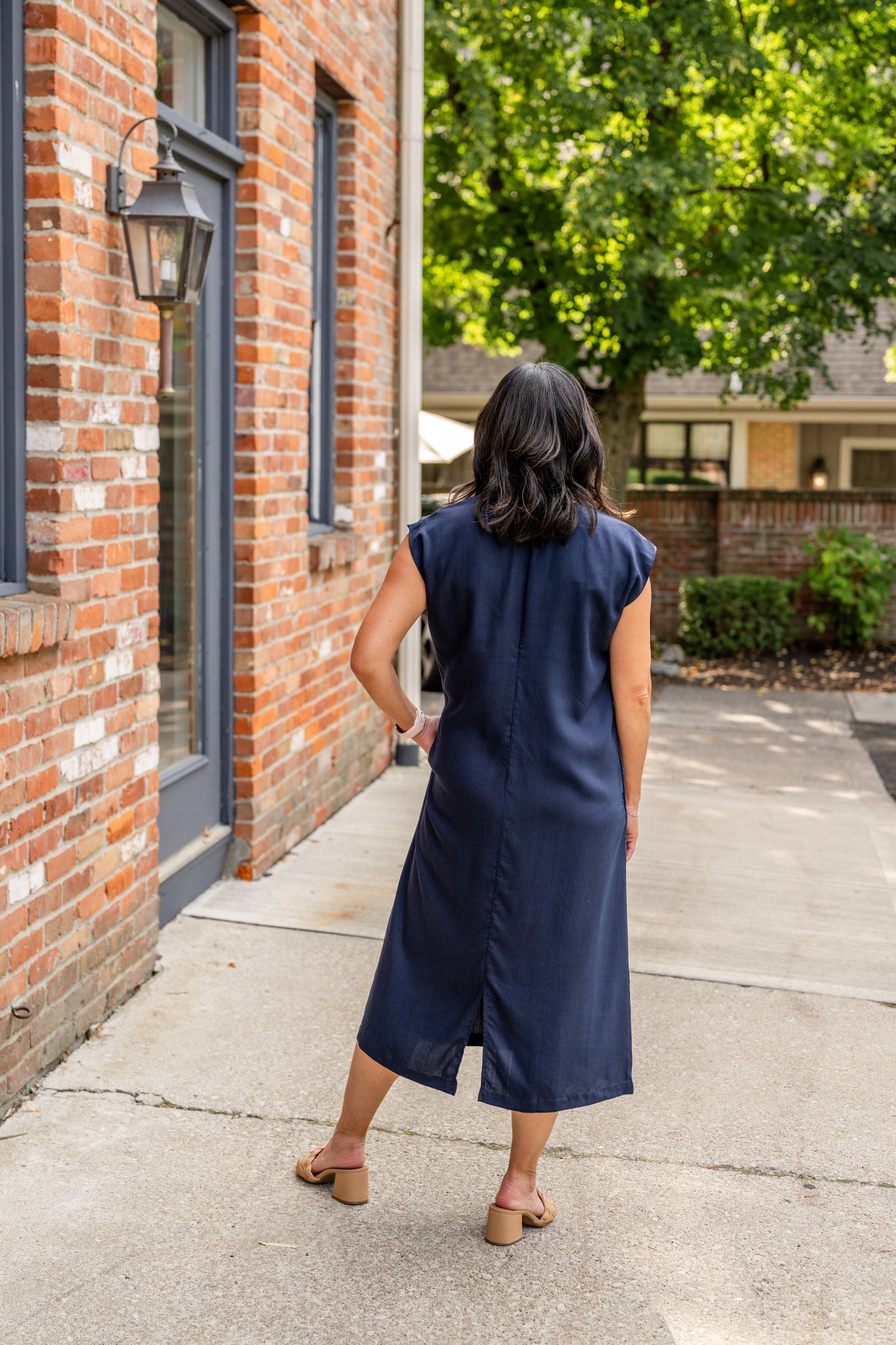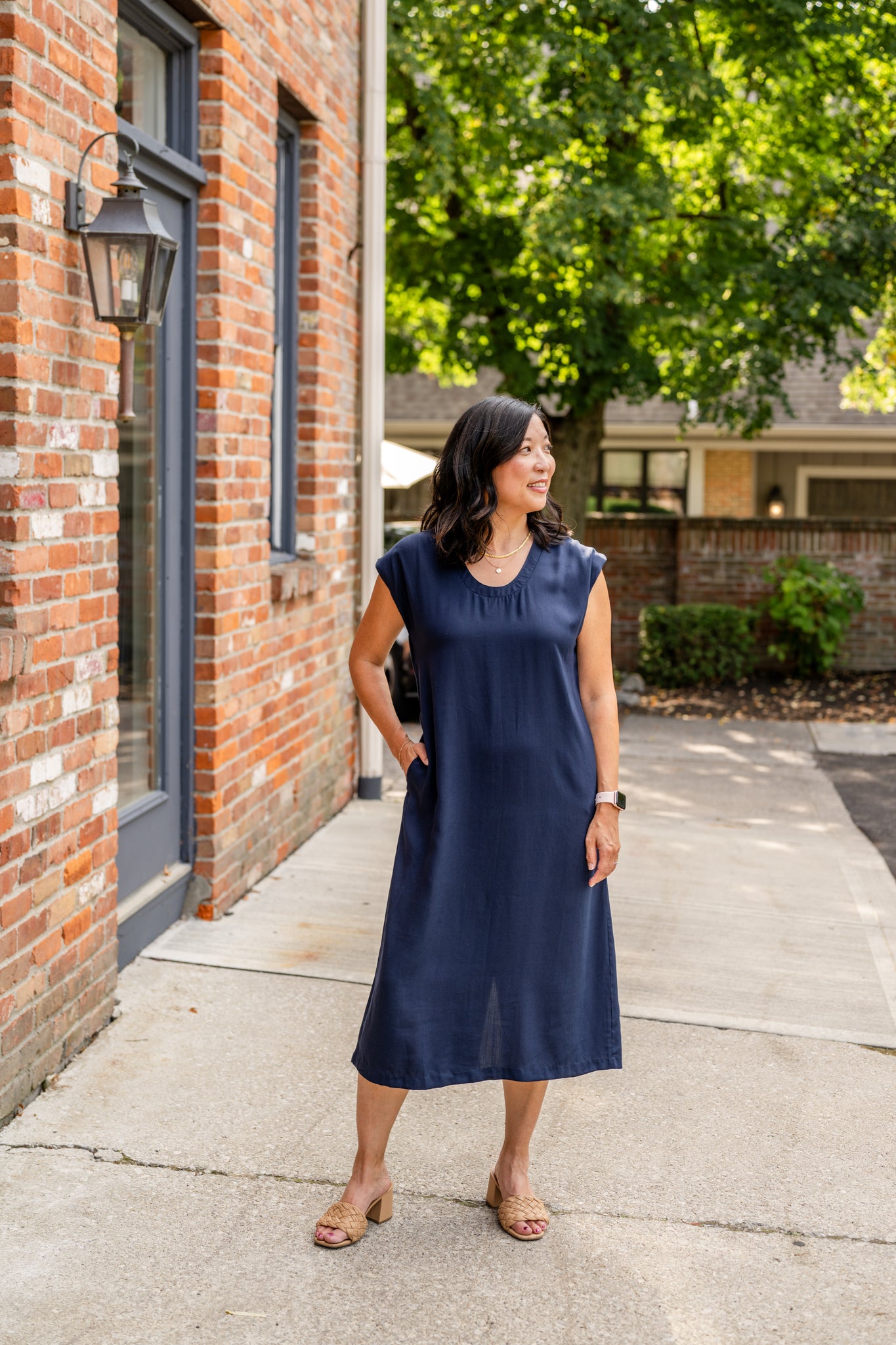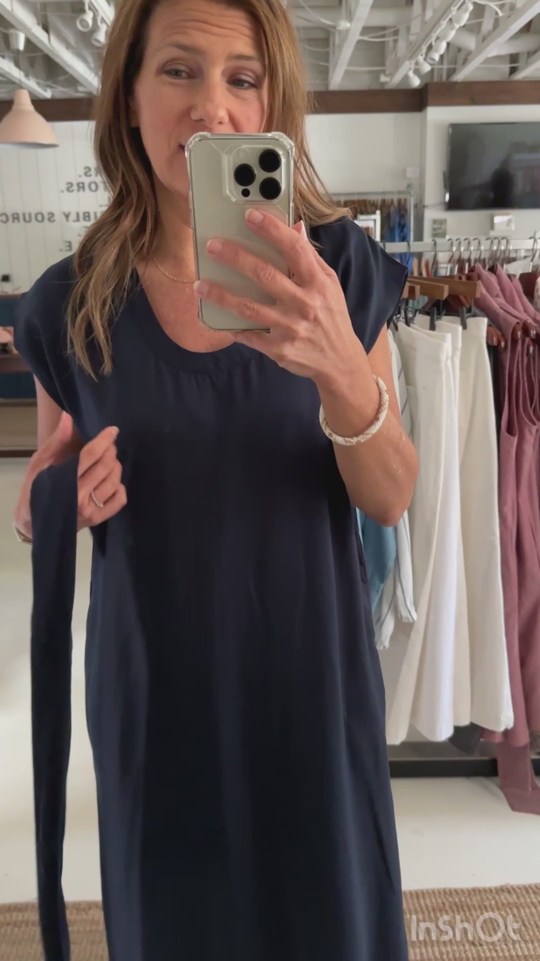 The Sophie Dress effortlessly transitions from season to season and occasion to occasion. The timeless scoop neckline and flattering A-line silhouette work beautifully on their own or layered with jackets and cardigans. Crafted from surplus 100% woven viscose with thoughtful details like hidden side pockets, a removable tie for styling options, and finished French seams. The midi length and back slit ensure comfort whether you're at the office, running errands, or enjoying dinner out.