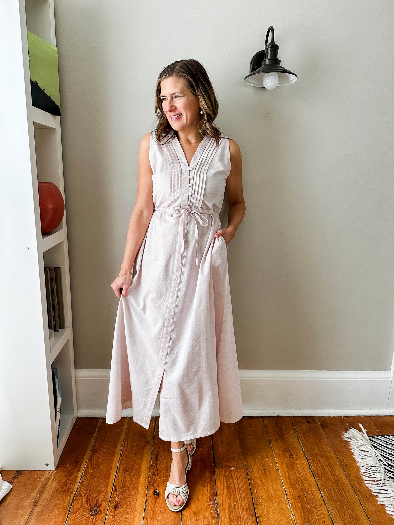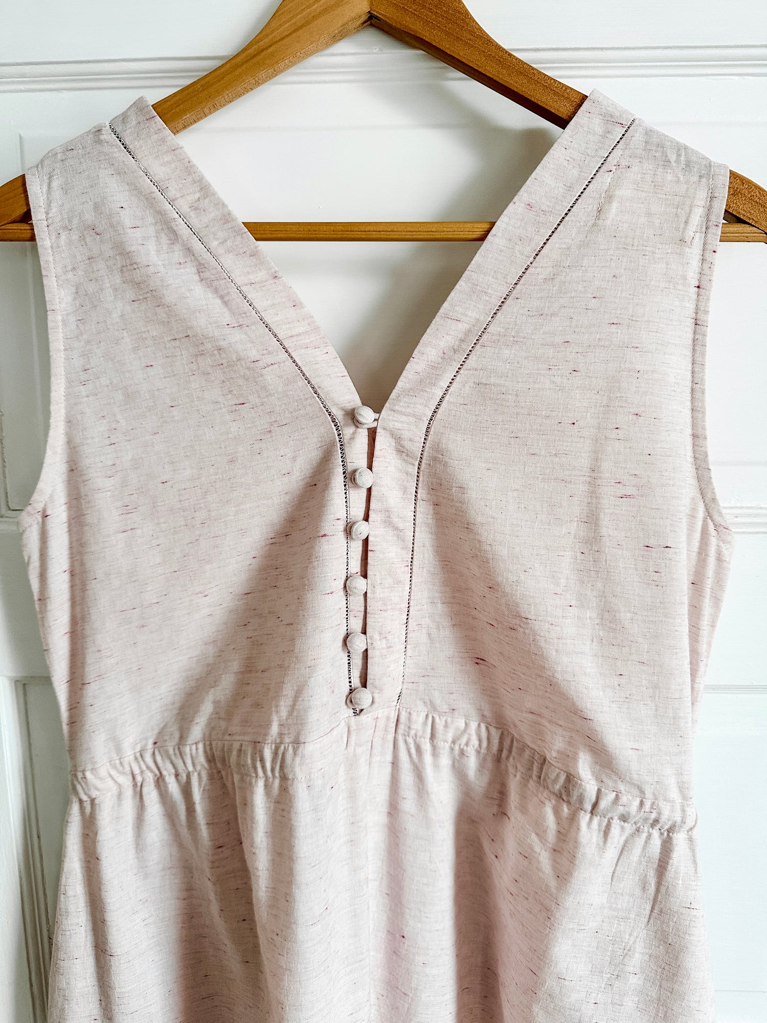 Double V-Neck Button Down Dress creates effortless style with a flattering V-Neck line and charming button detailing a touch of elegance while still keeping breezy and comfortable. Whether styled with a beach hat and sandals, sneakers for a day of errands or heels to a summer wedding, the details will have you turning heads. The fabrics are so unique and one-of-a-kind.